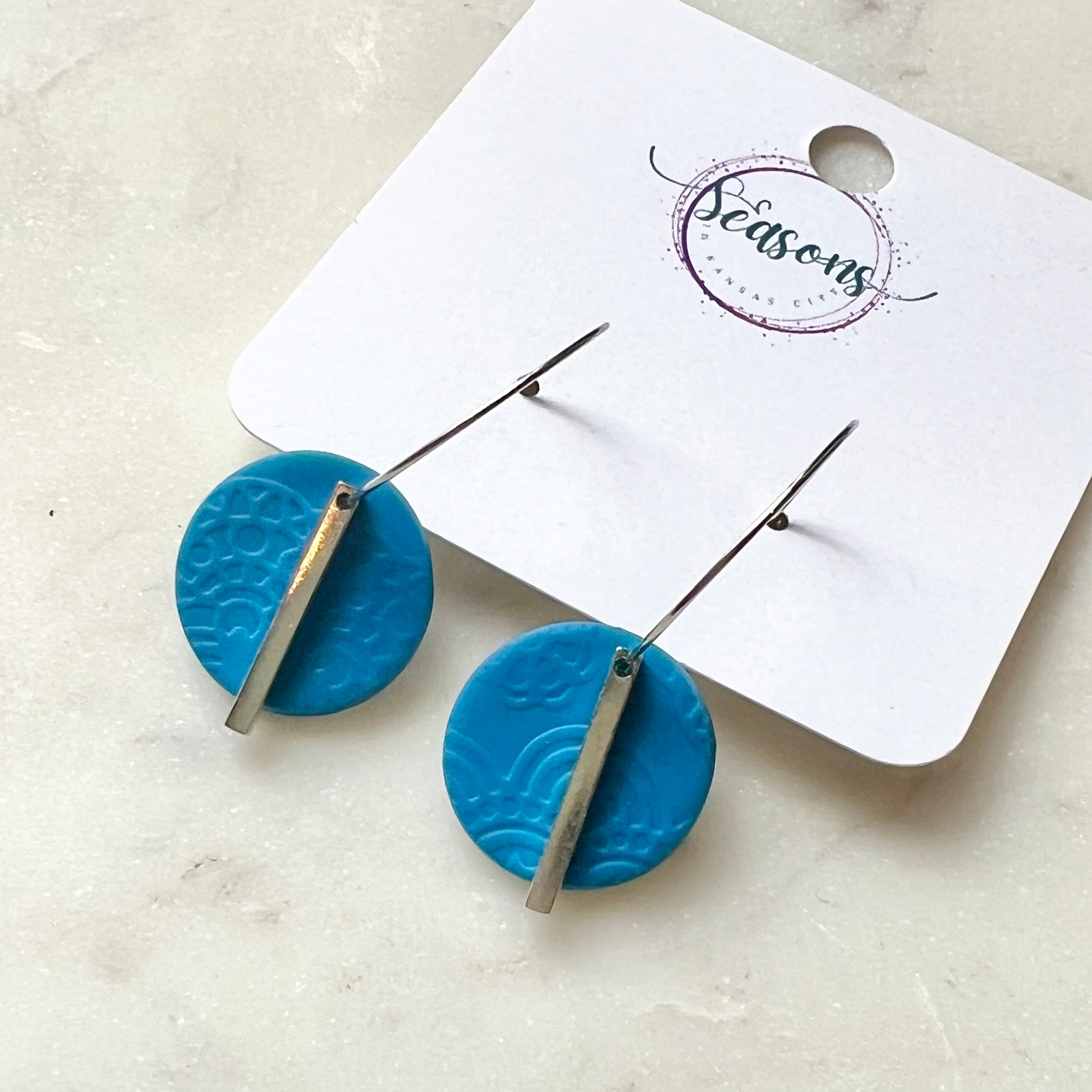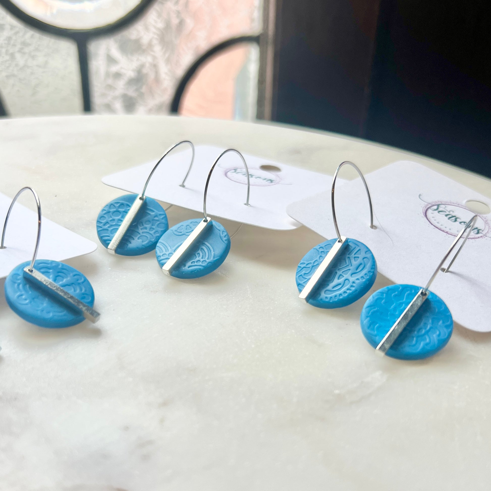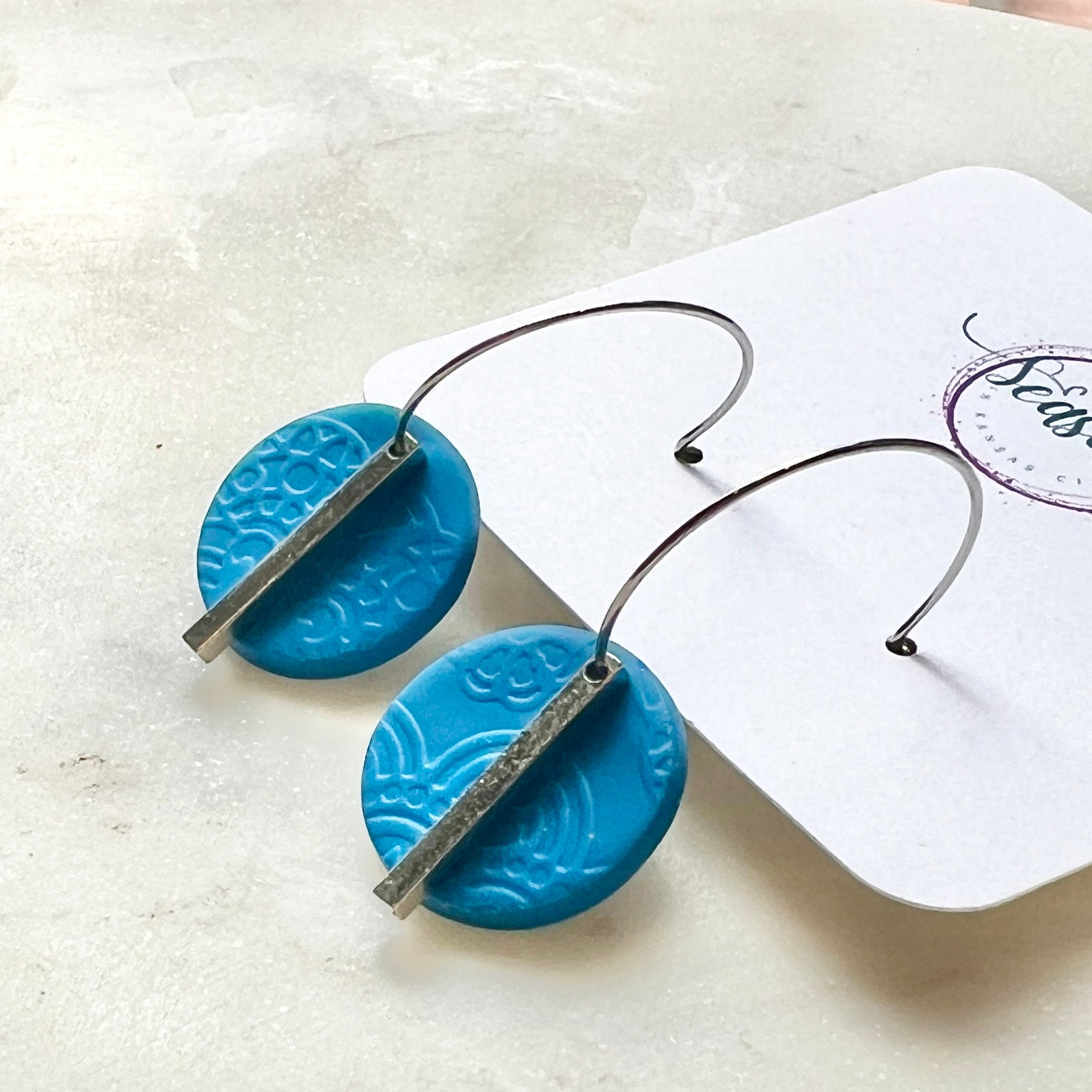 A round disk of turquoise blue clay is embossed before being finished with silver, stainless steel hardware.