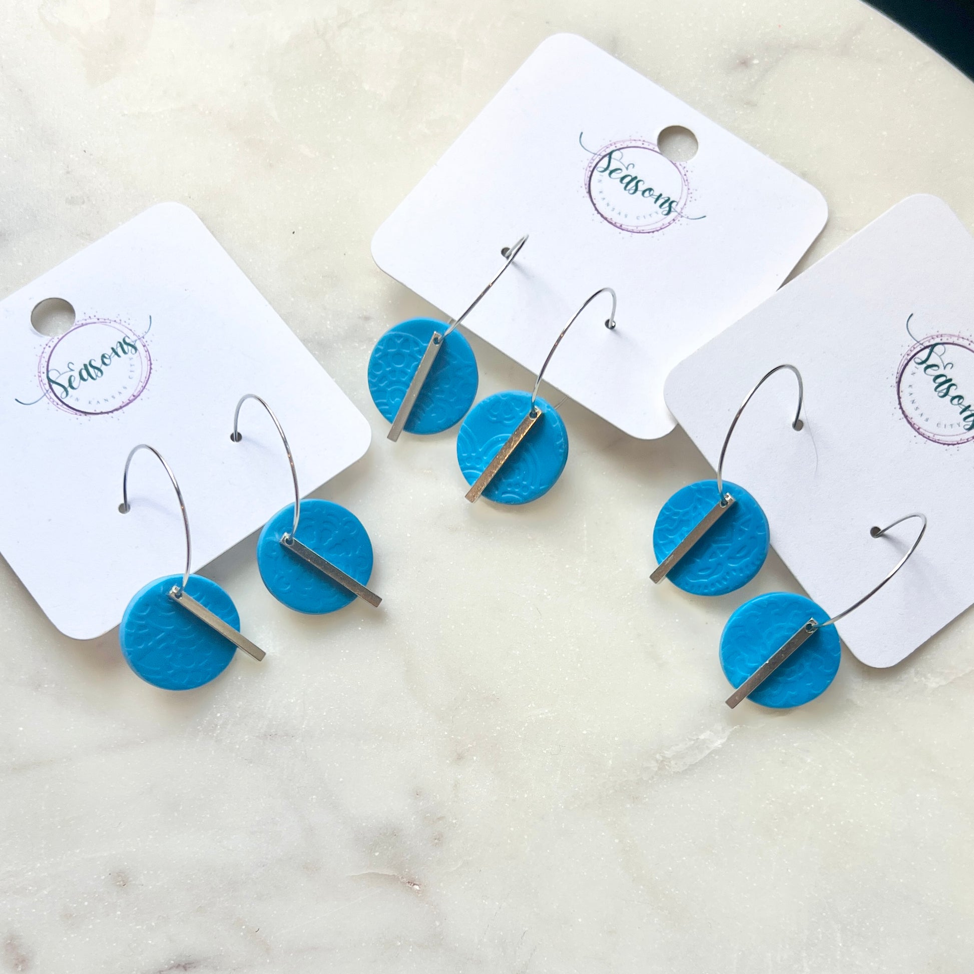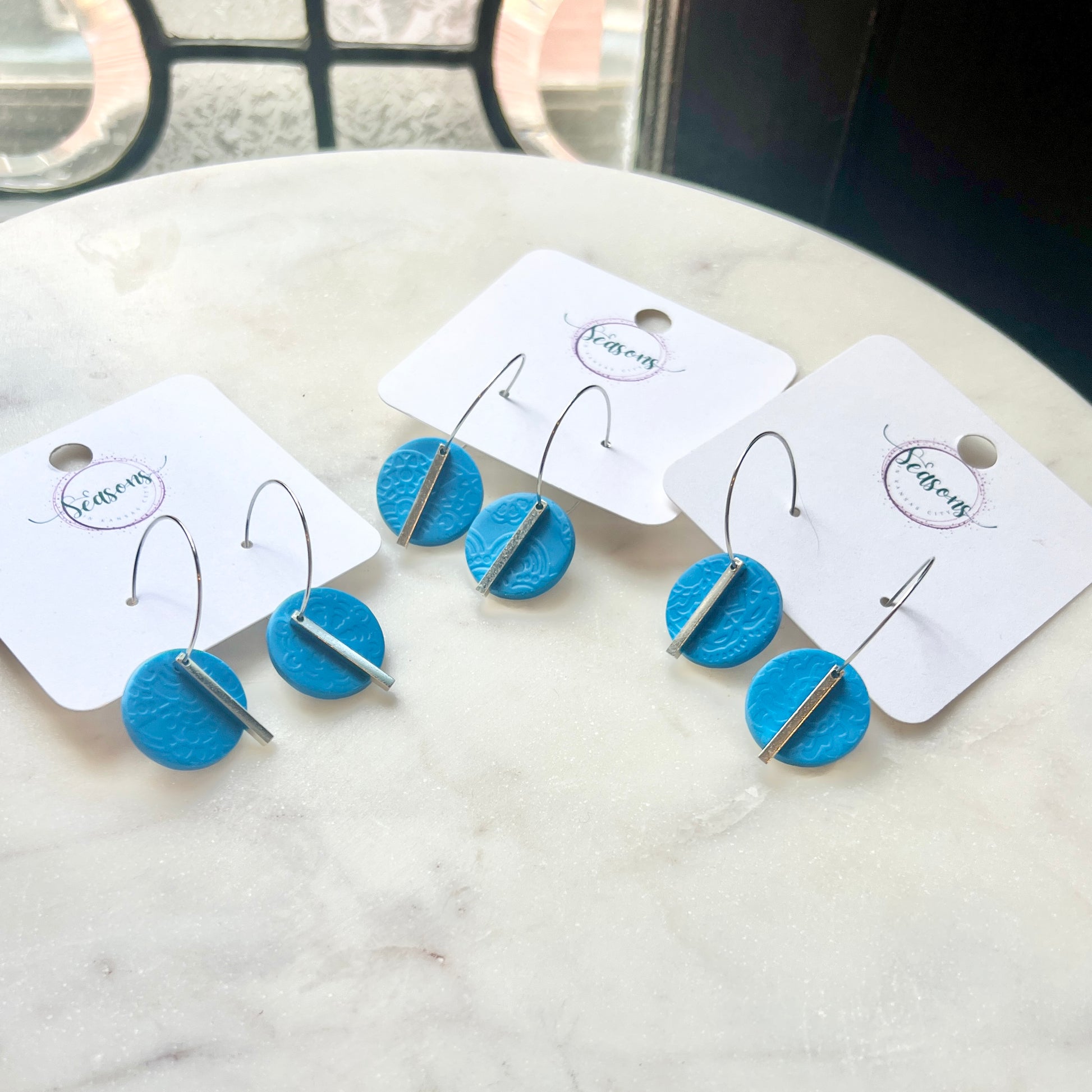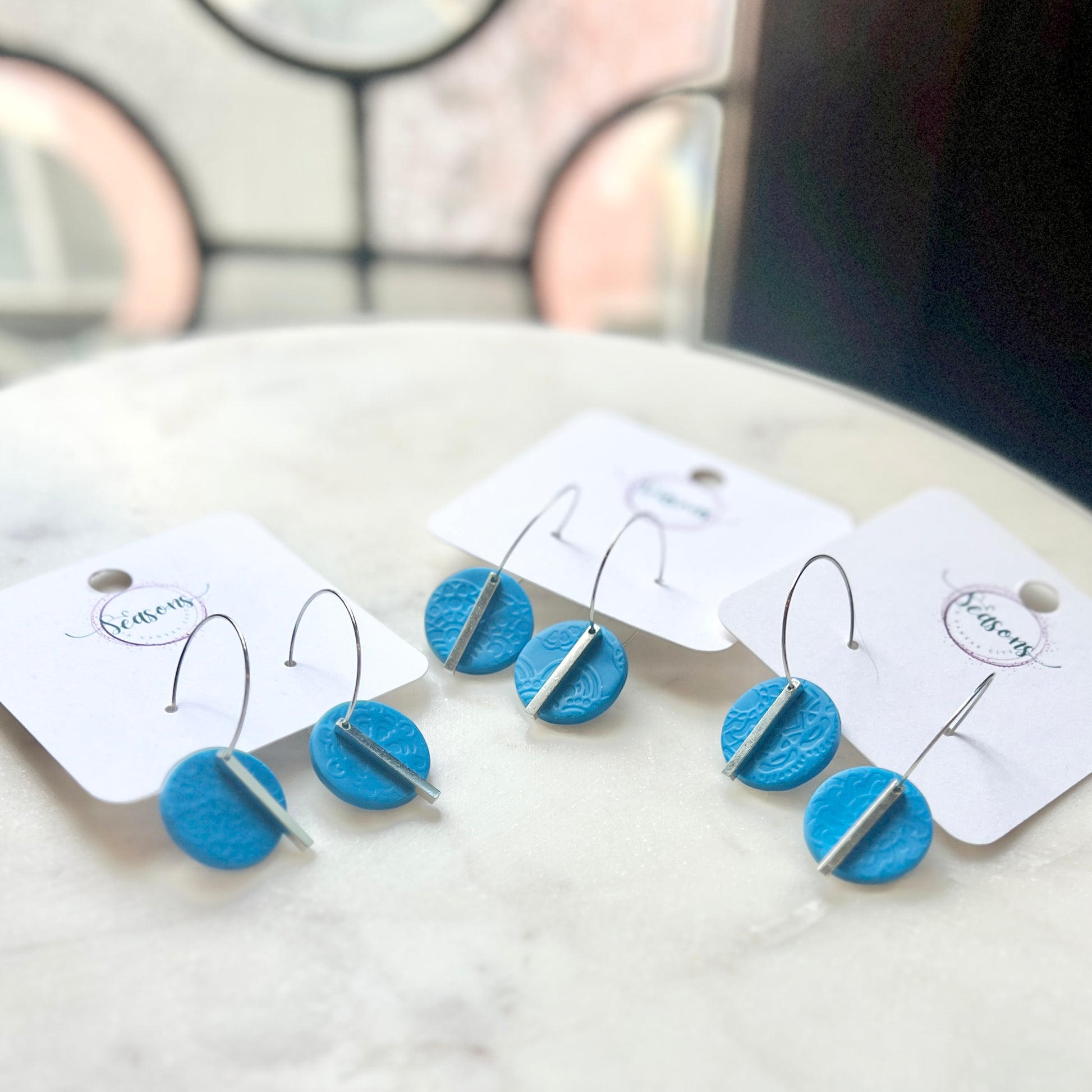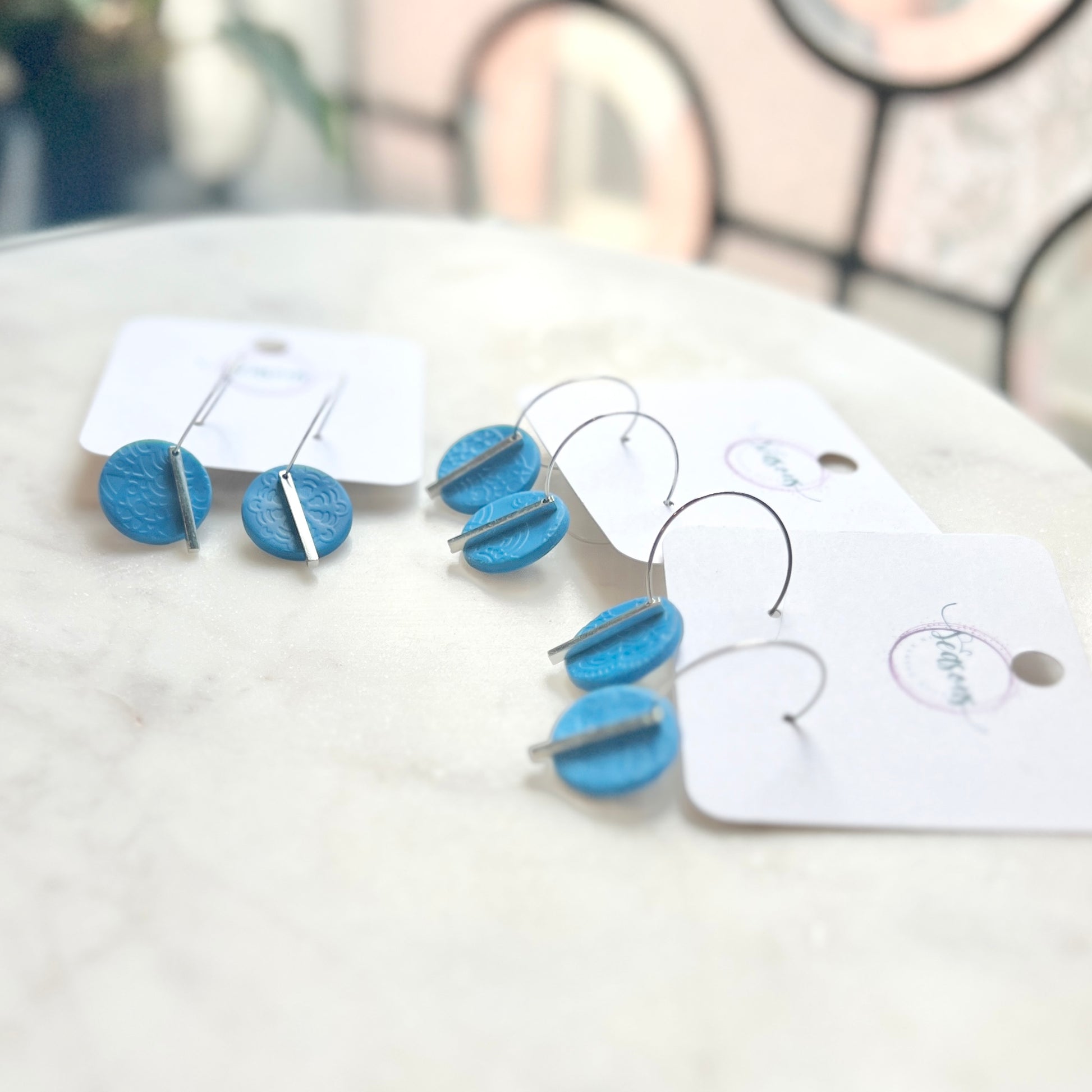 A round disk of turquoise blue clay is embossed before being finished with silver, stainless steel hardware.