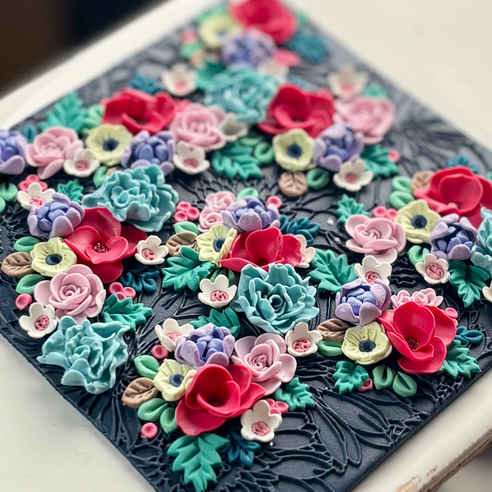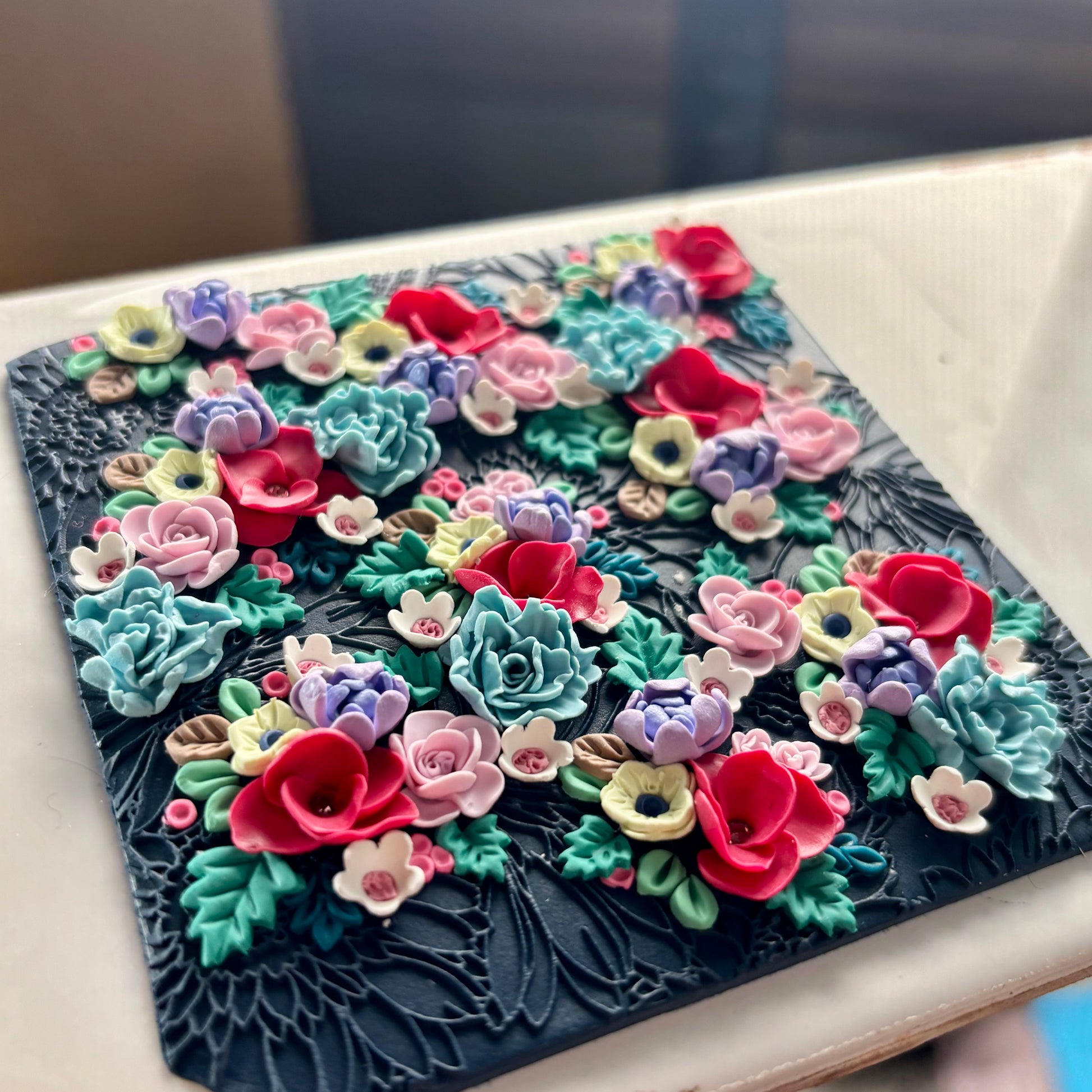 Adelaide is a collection using over a dozen of your seasons shades to create a garden slab of flowers. That slab is then cut into individual pieces, making each item a unique creation.