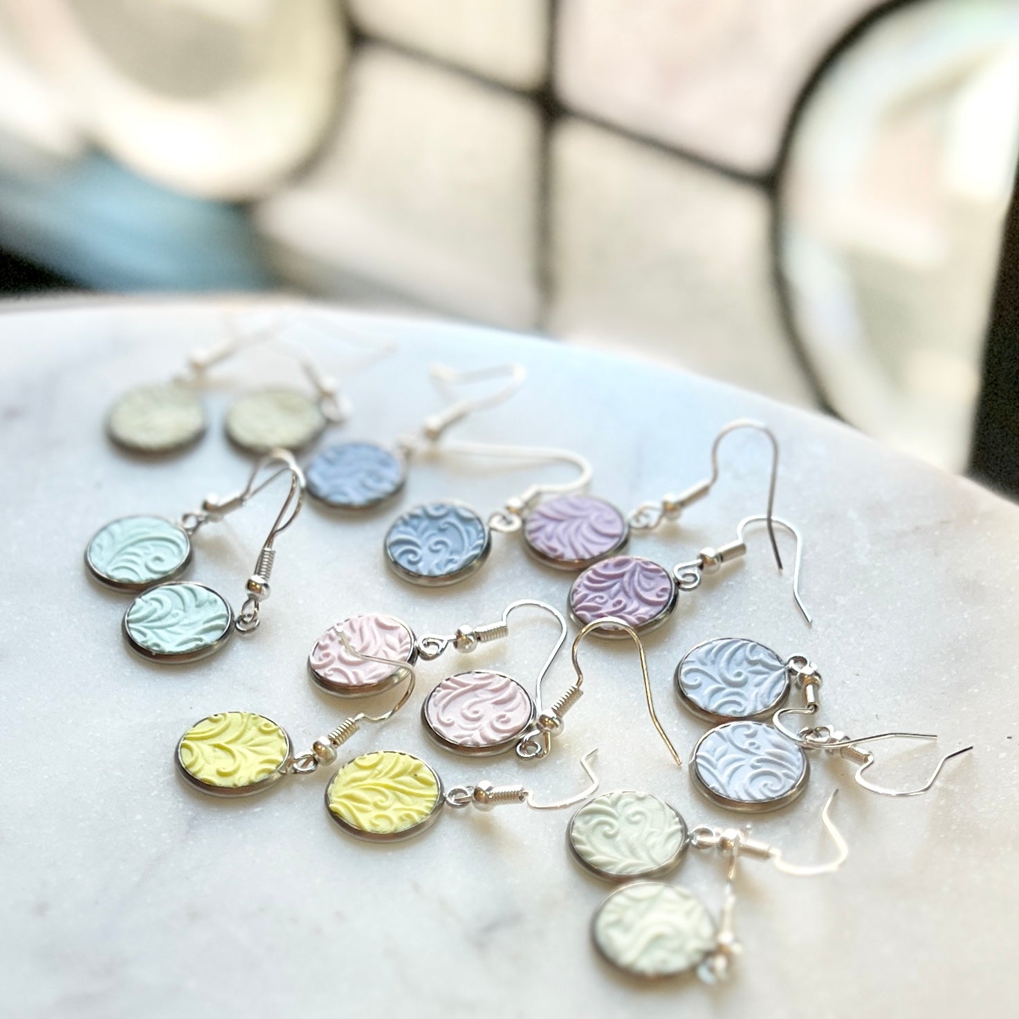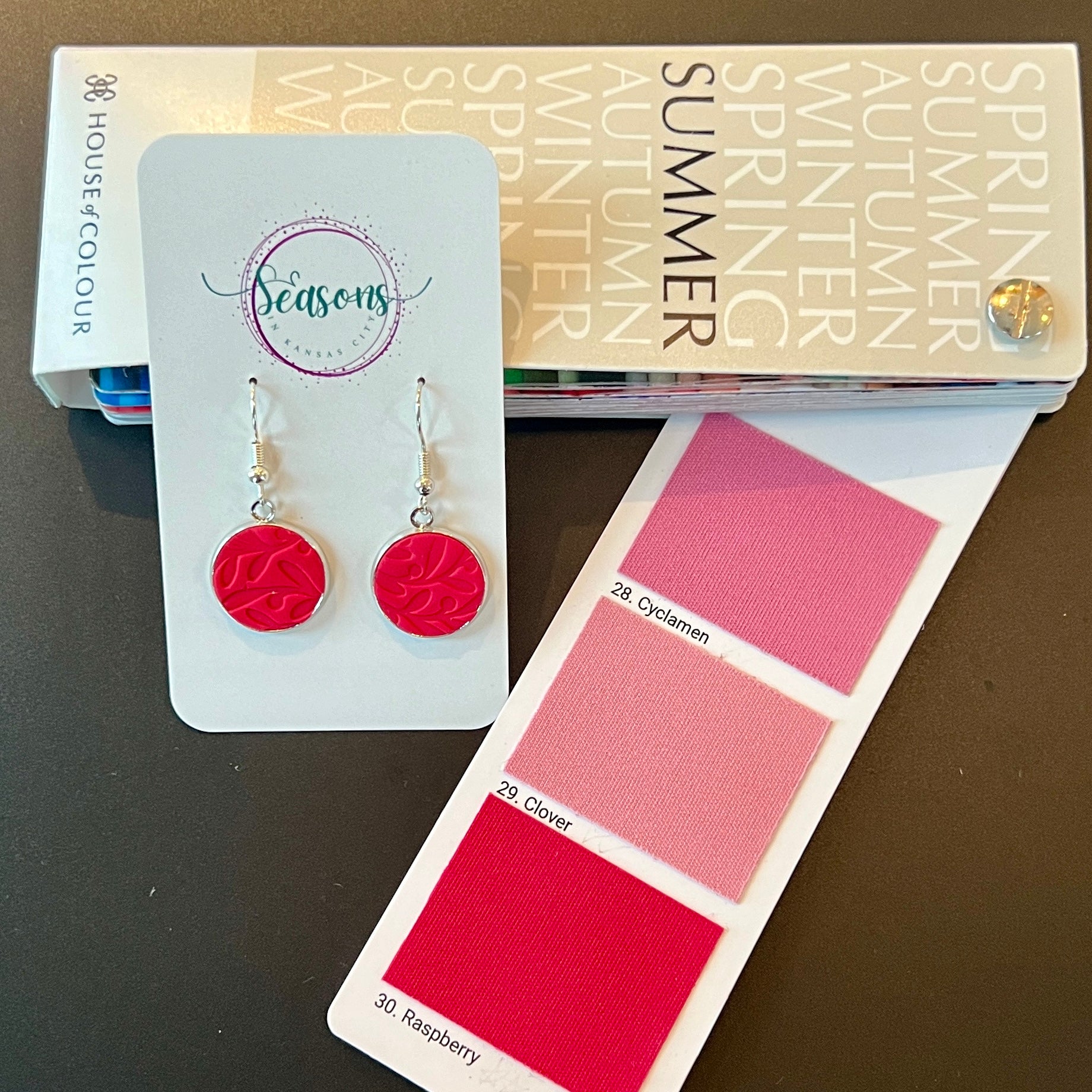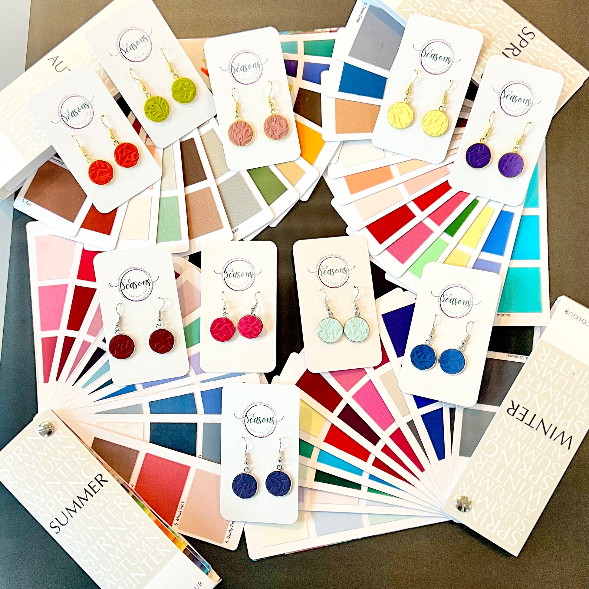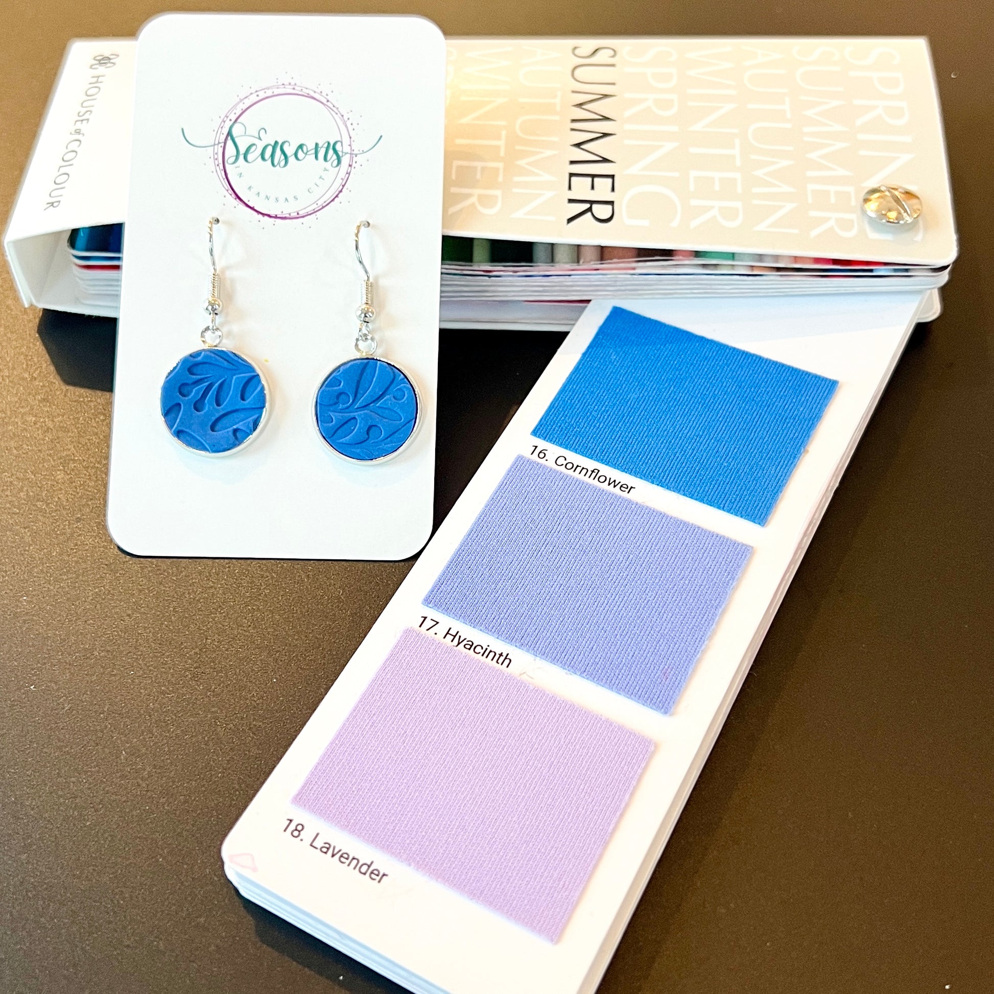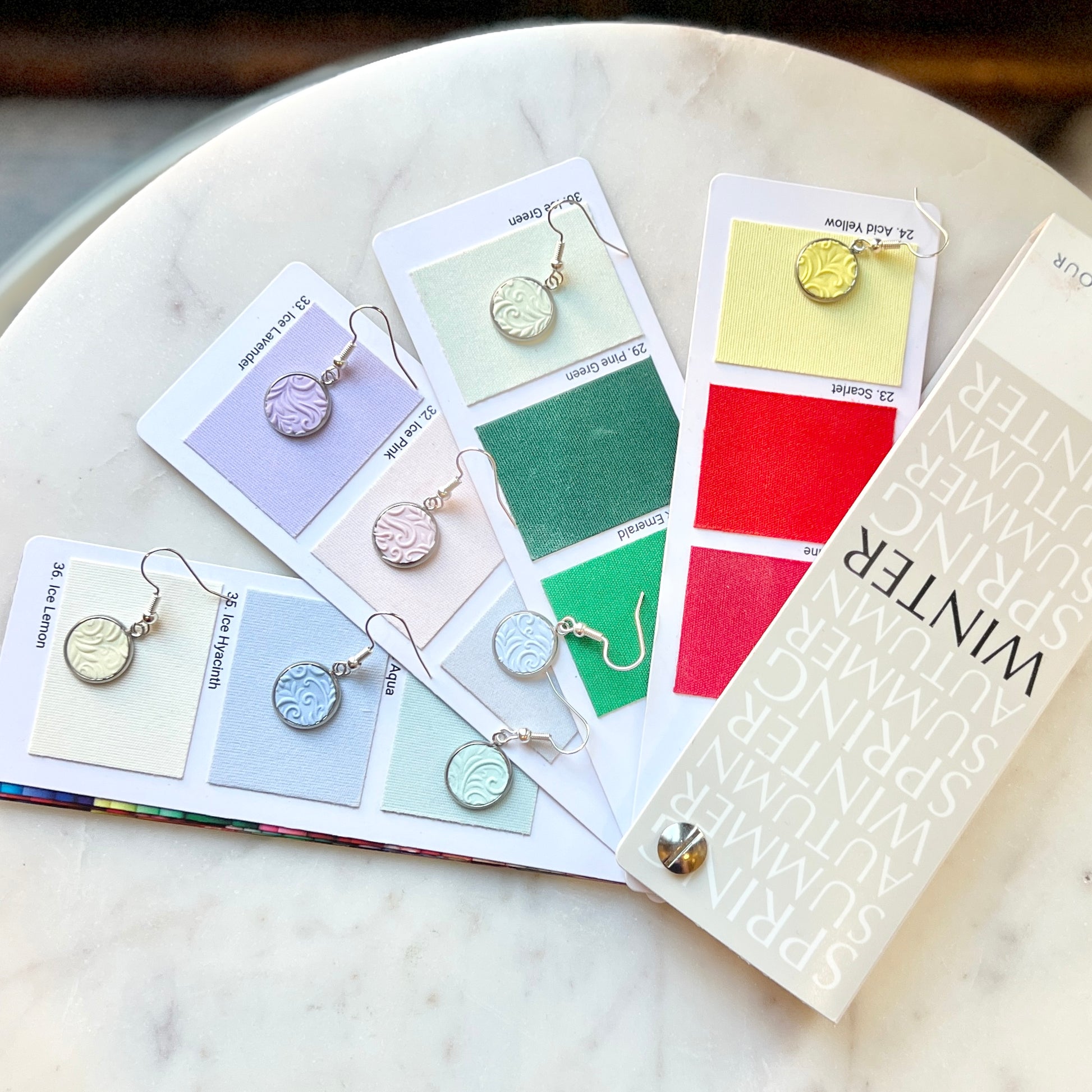 A 1/3" circular bevel is filled with clay to color match the House of Colour seasonal palettes. Earrings are finished with stainless steel, silver and gold plated.