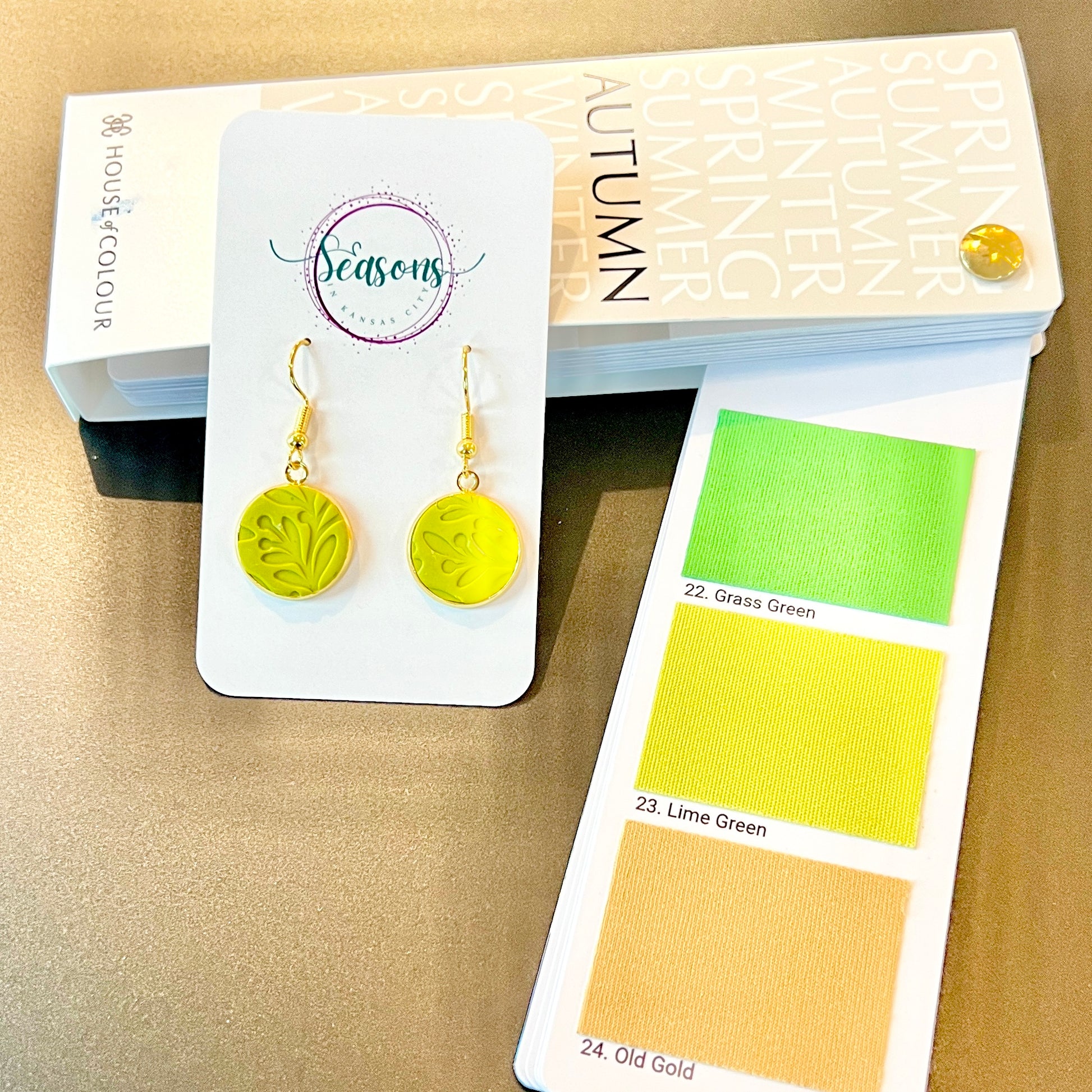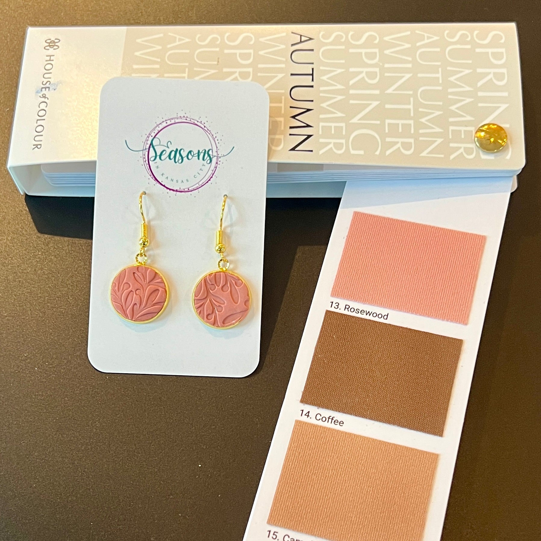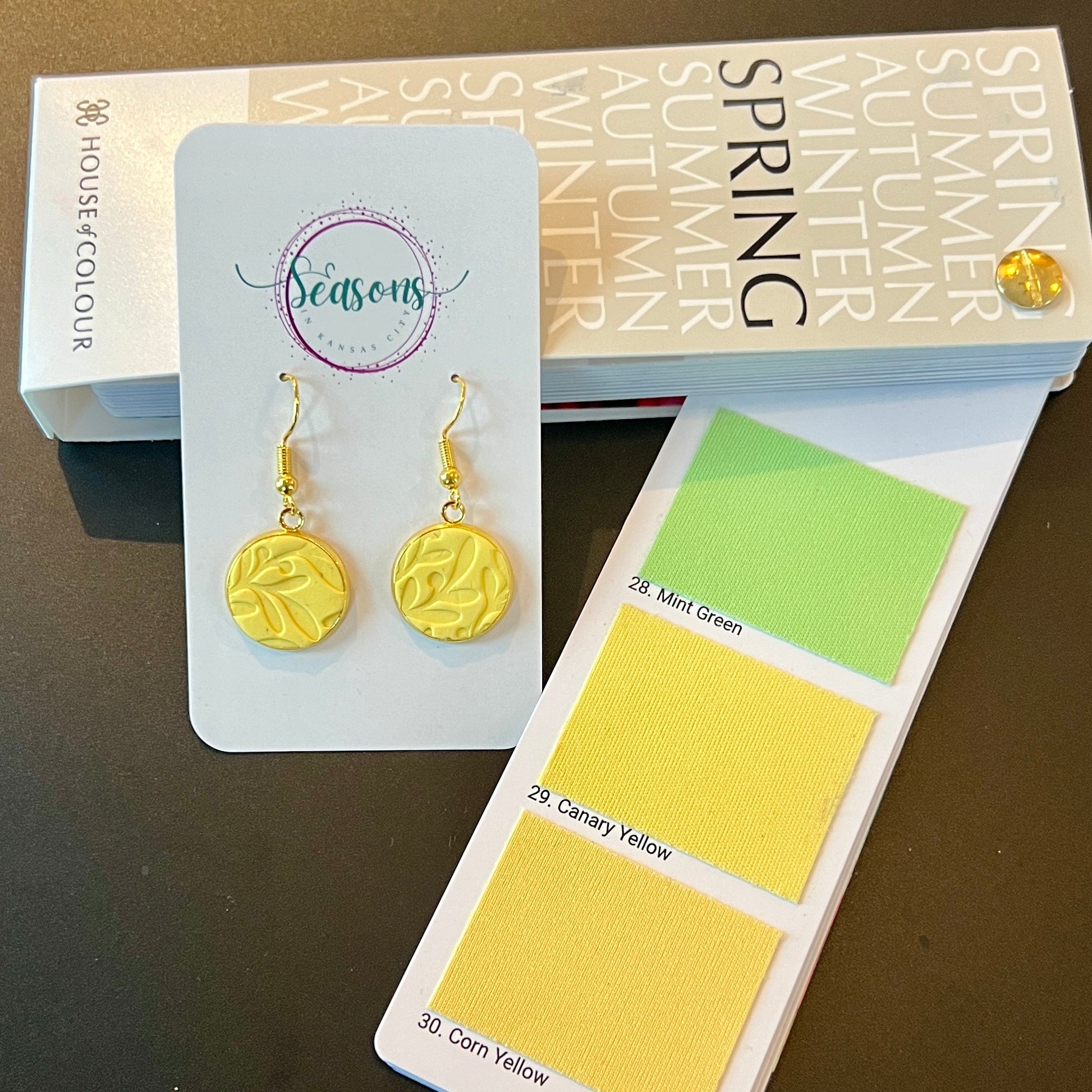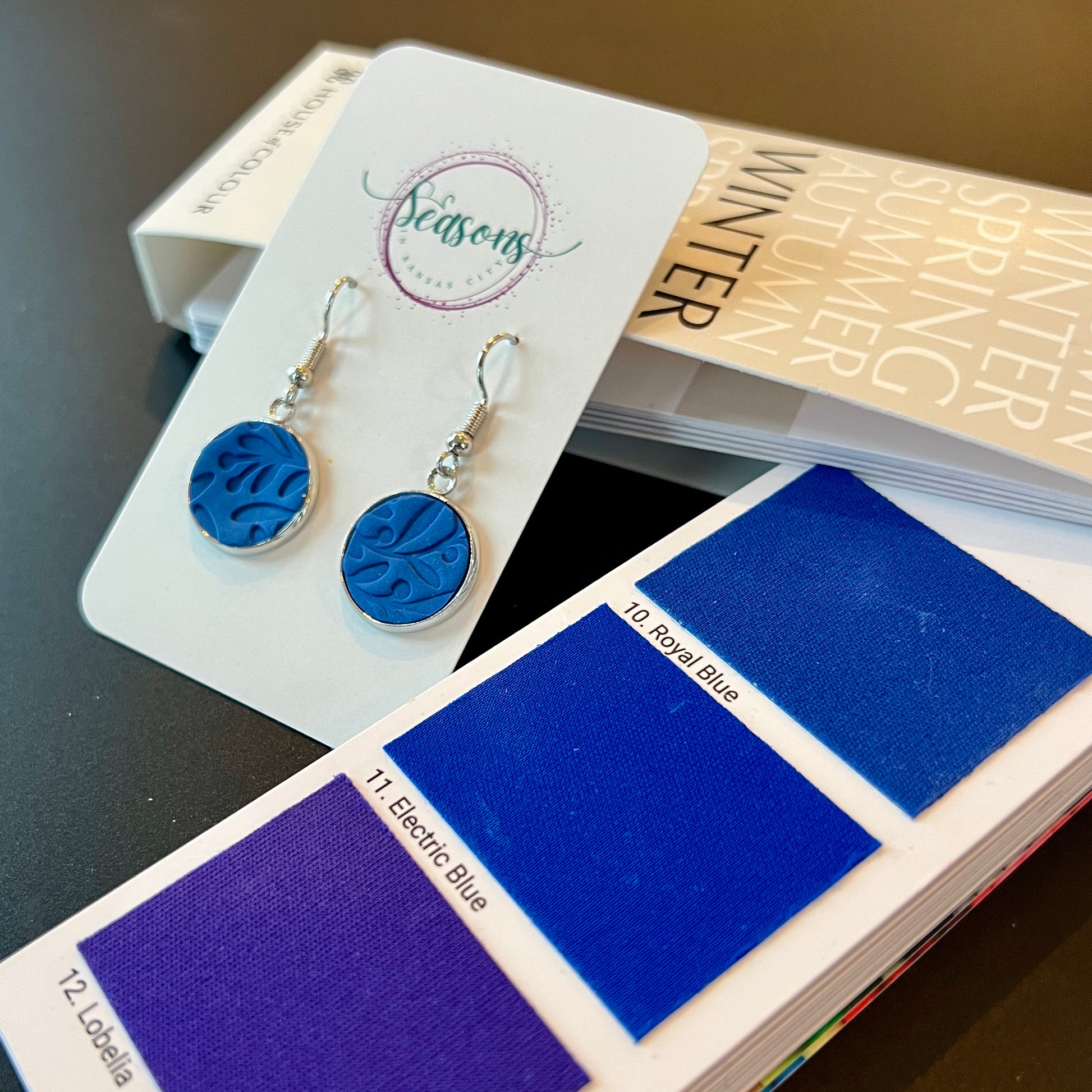A 1/3" circular bevel is filled with clay to color match the House of Colour seasonal palettes. Earrings are finished with stainless steel, silver and gold plated.