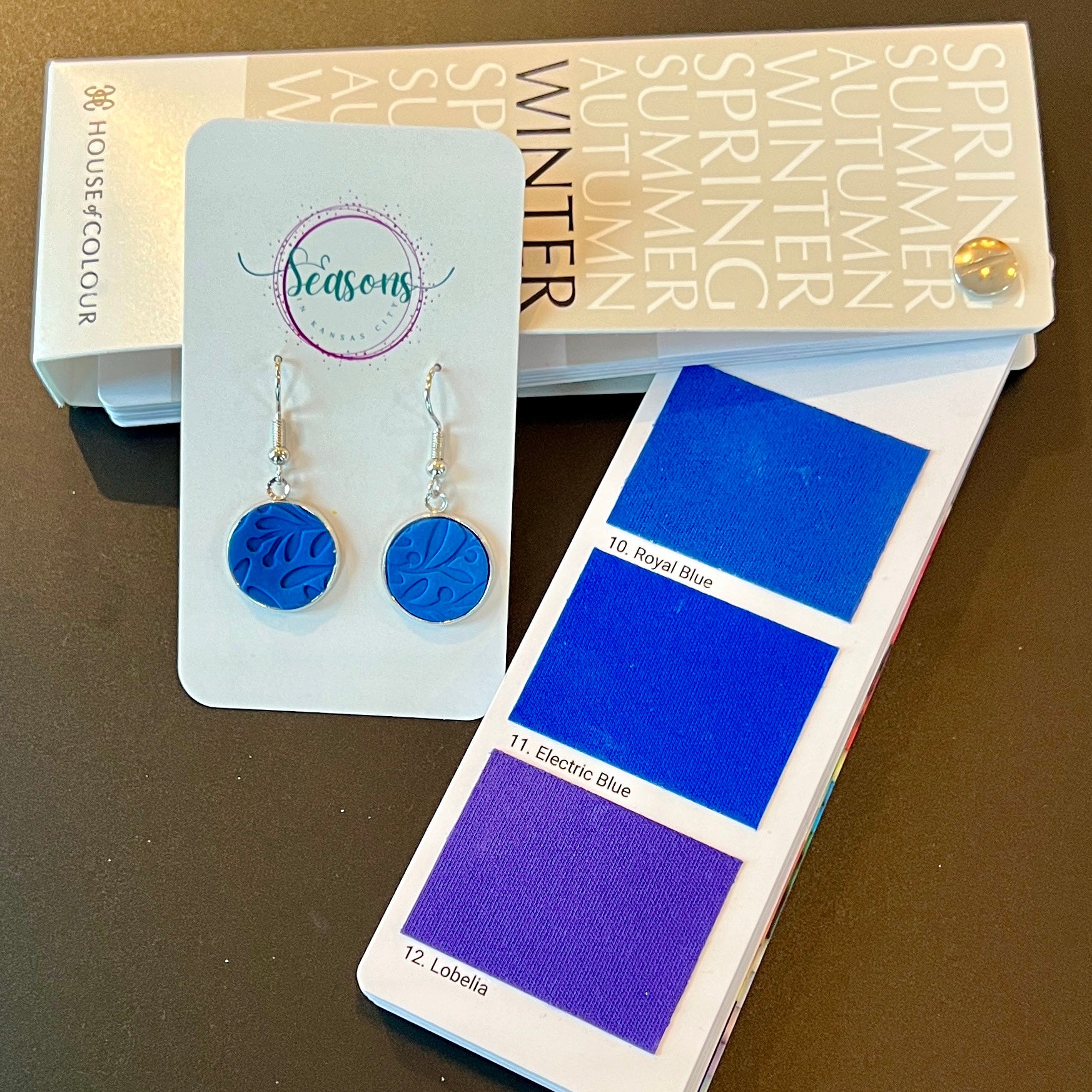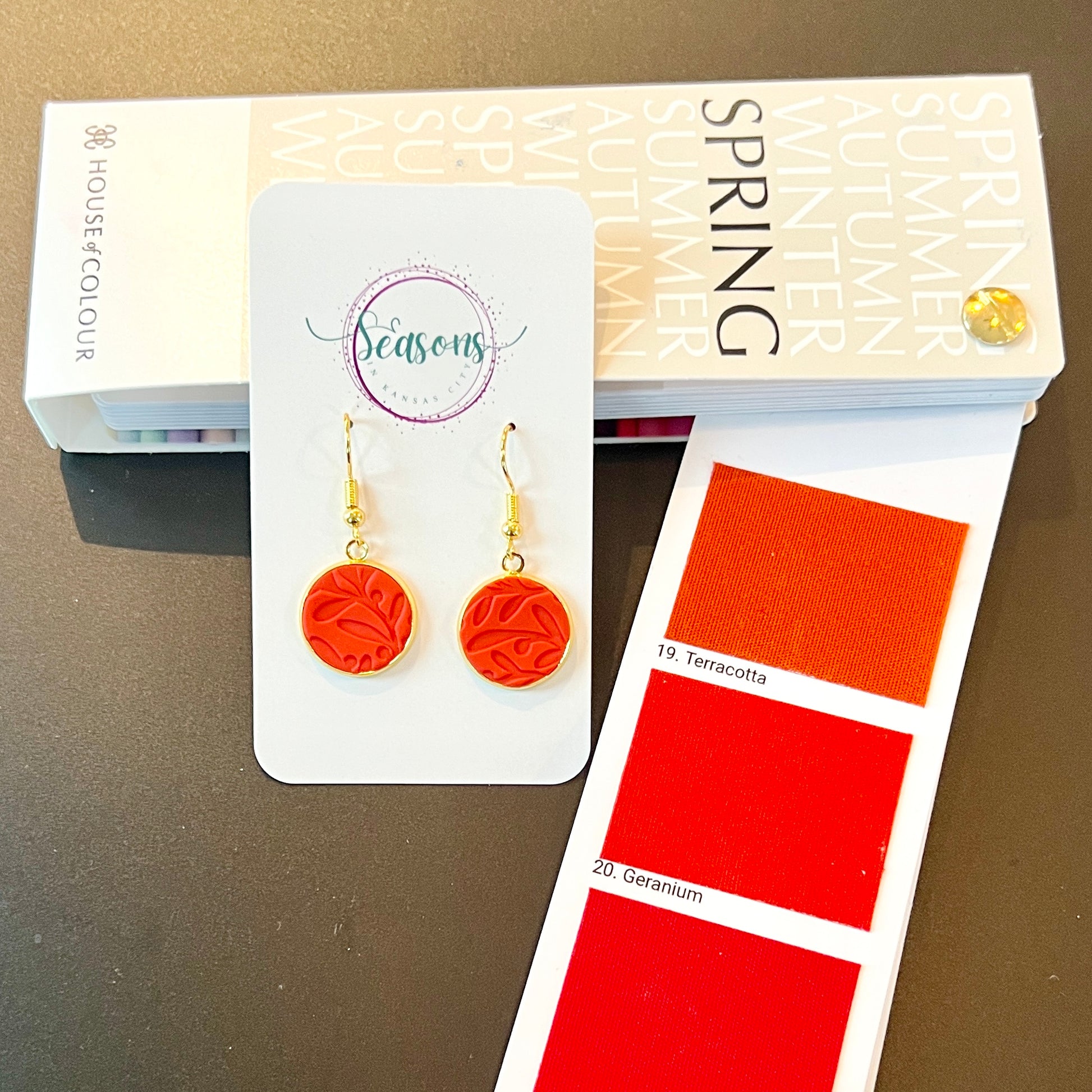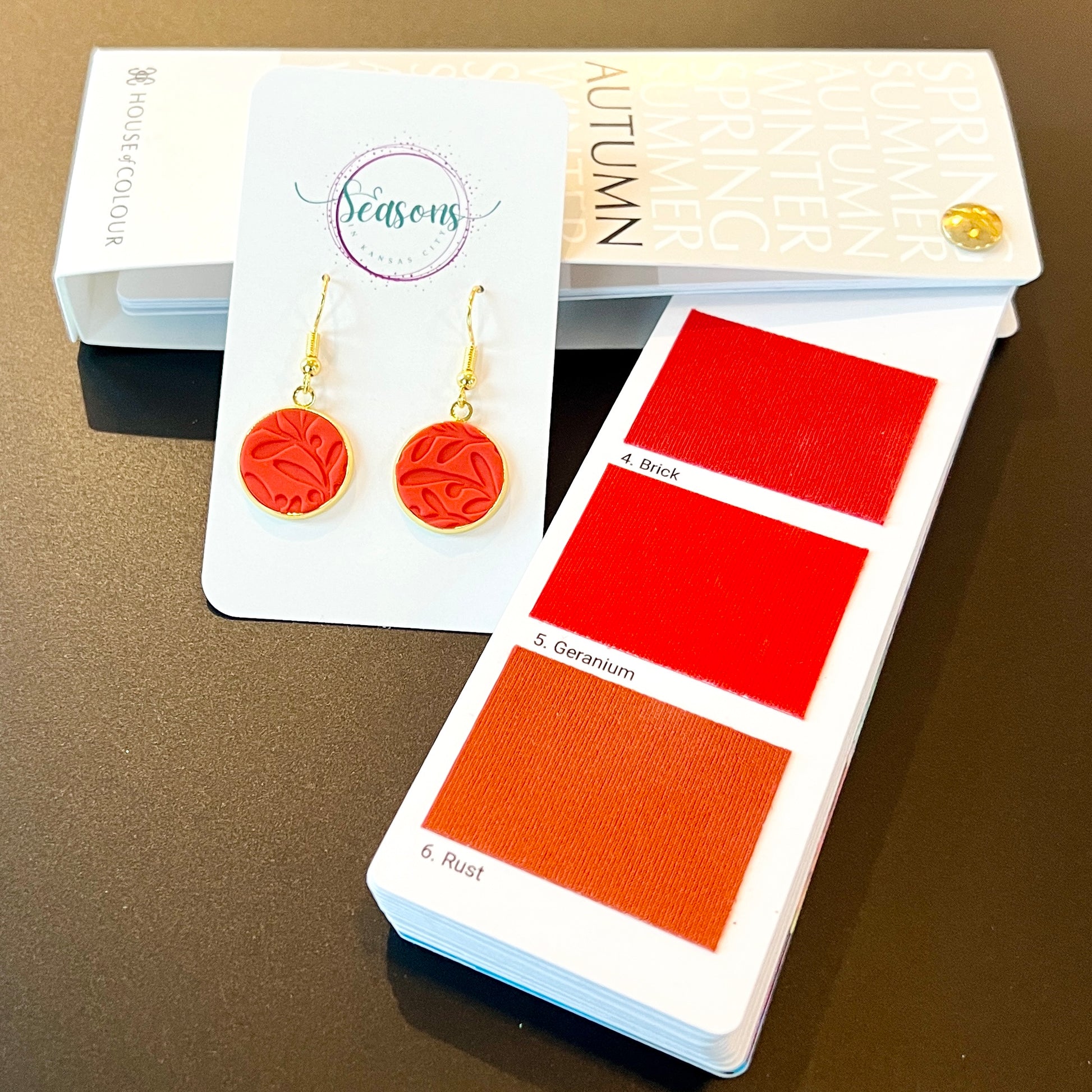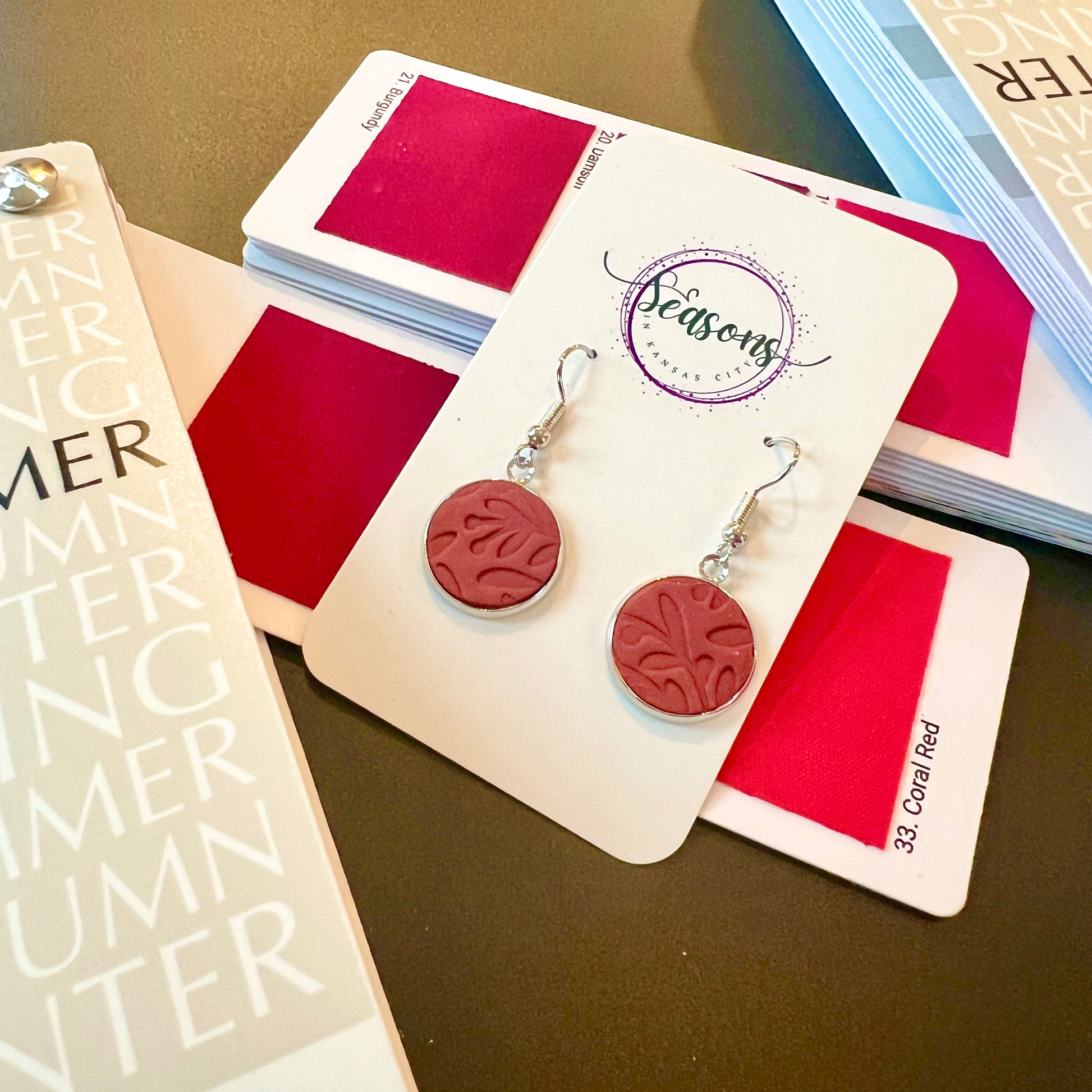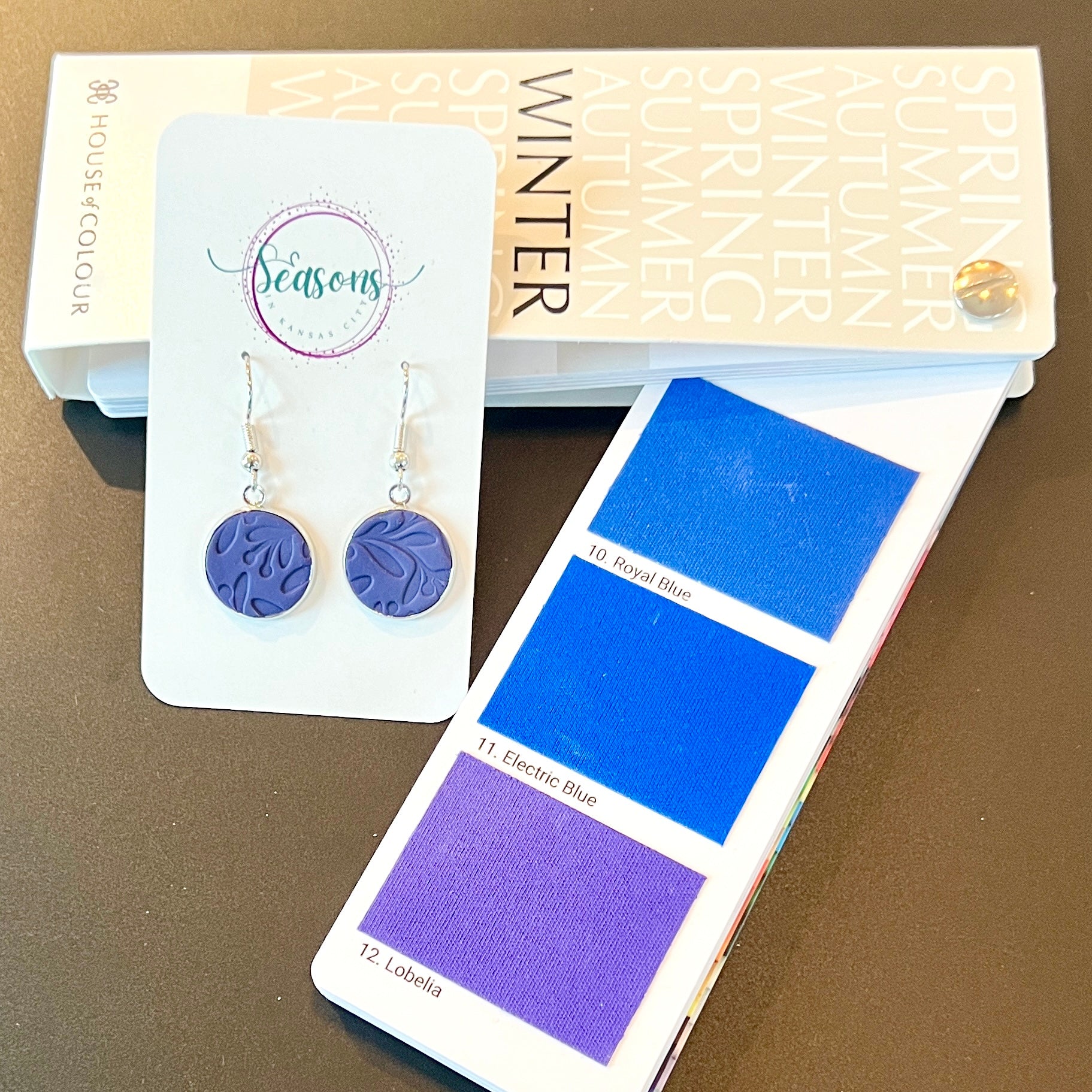 A 1/3" circular bevel is filled with clay to color match the House of Colour seasonal palettes. Earrings are finished with stainless steel, silver and gold plated.
