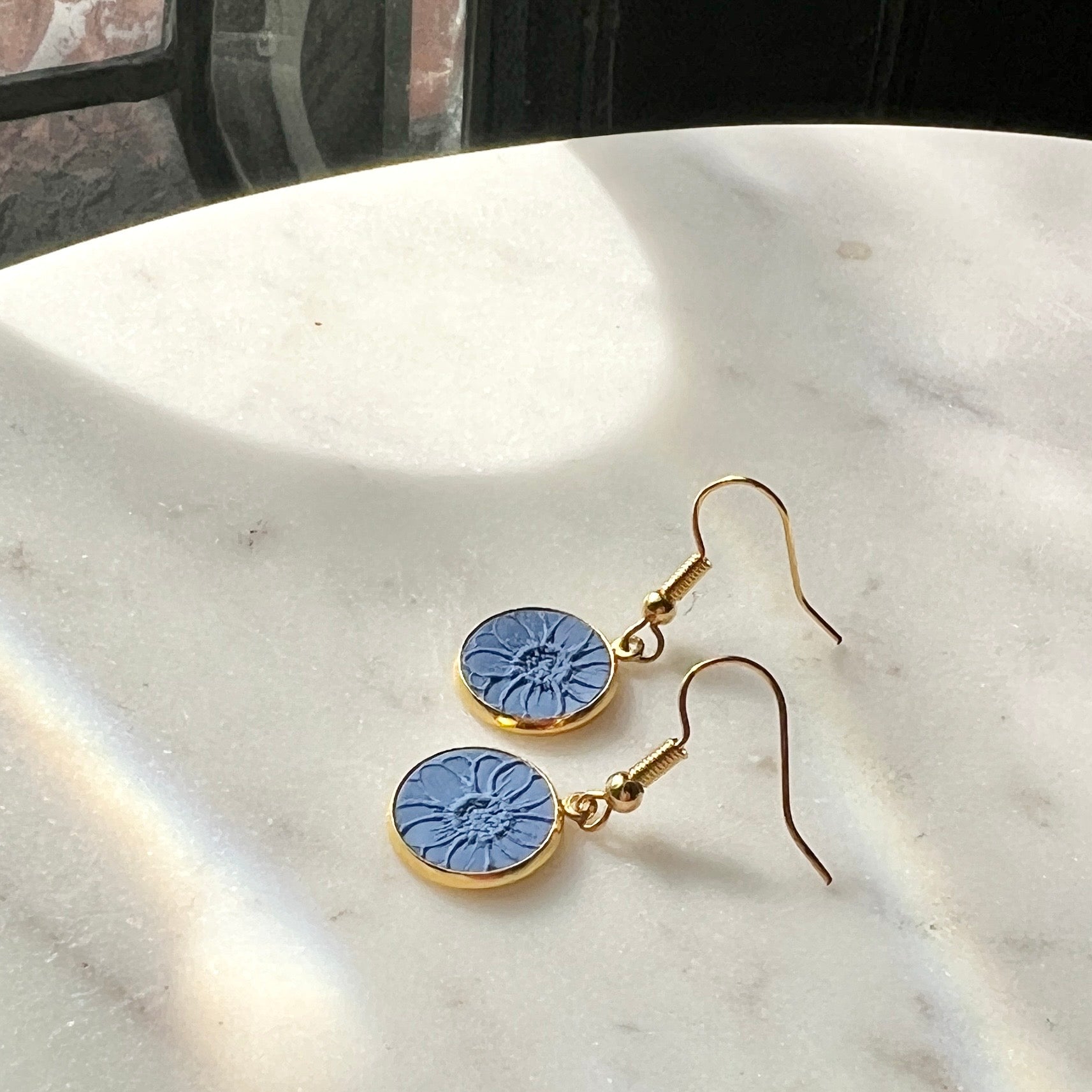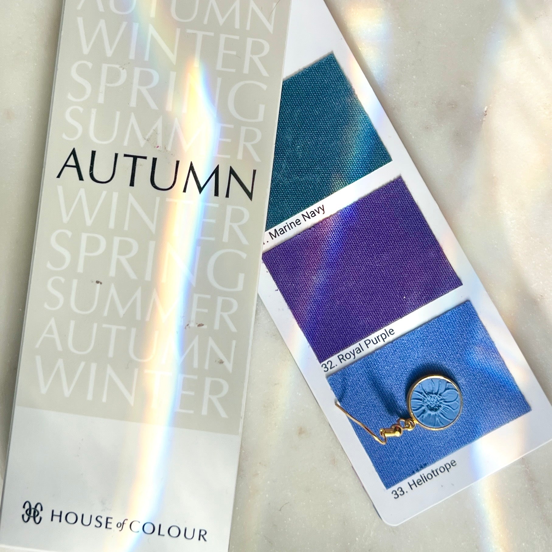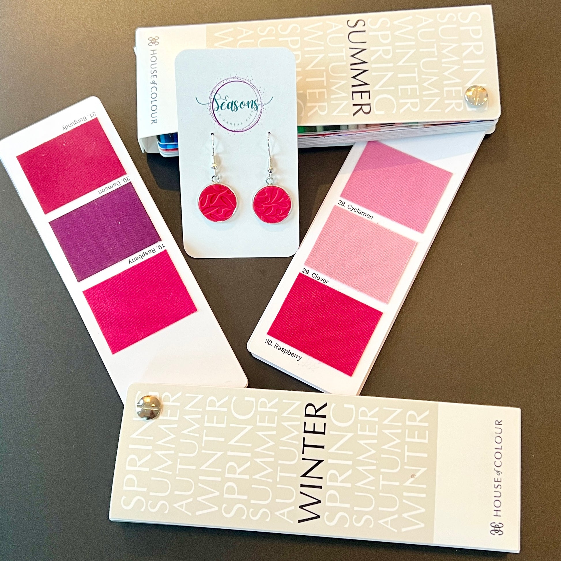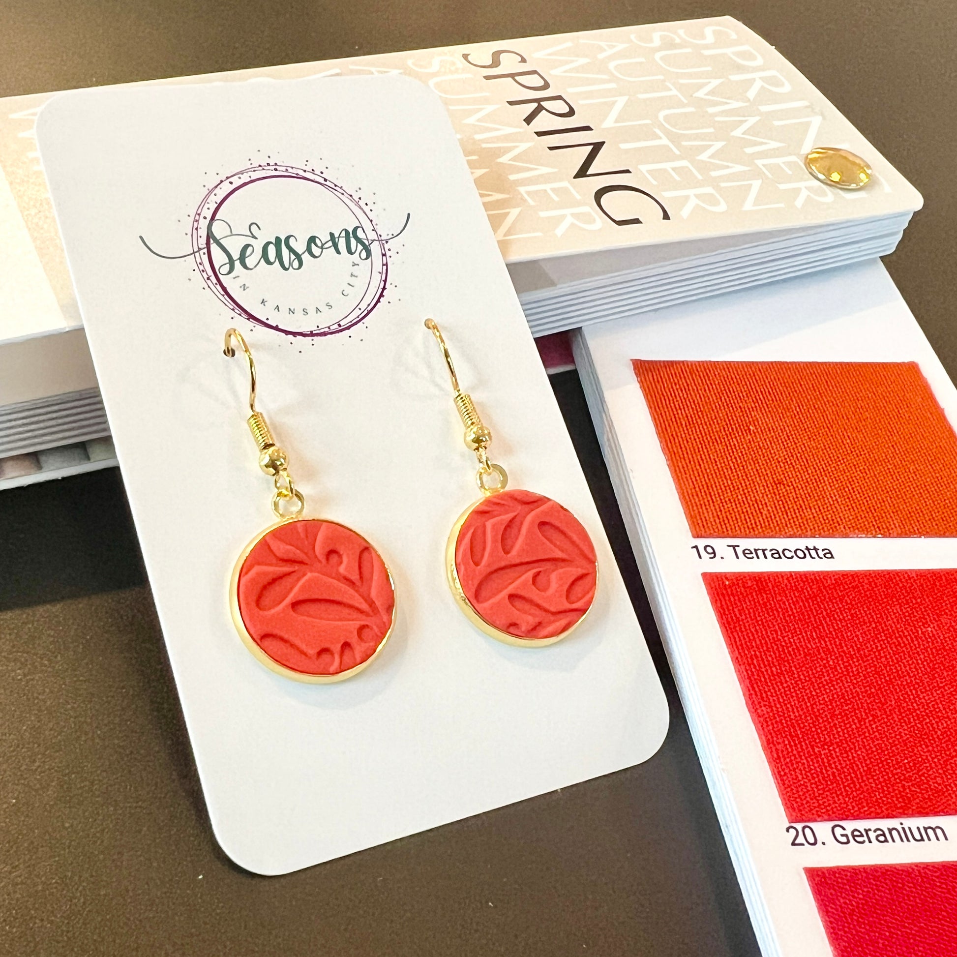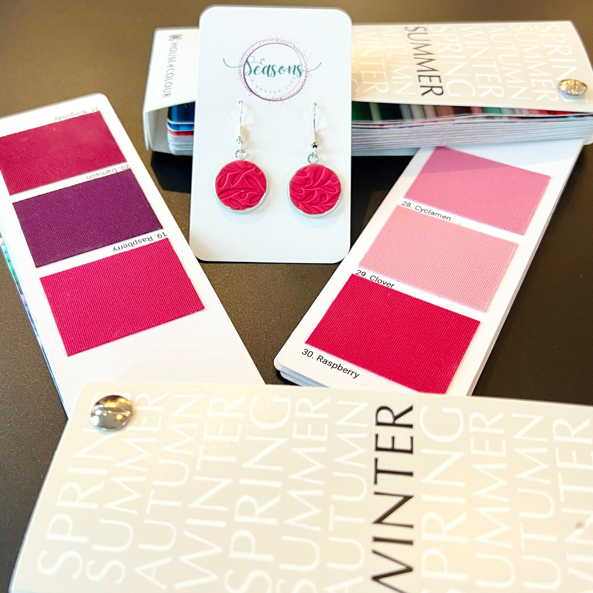 A 1/3" circular bevel is filled with clay to color match the House of Colour seasonal palettes. Earrings are finished with stainless steel, silver and gold plated.