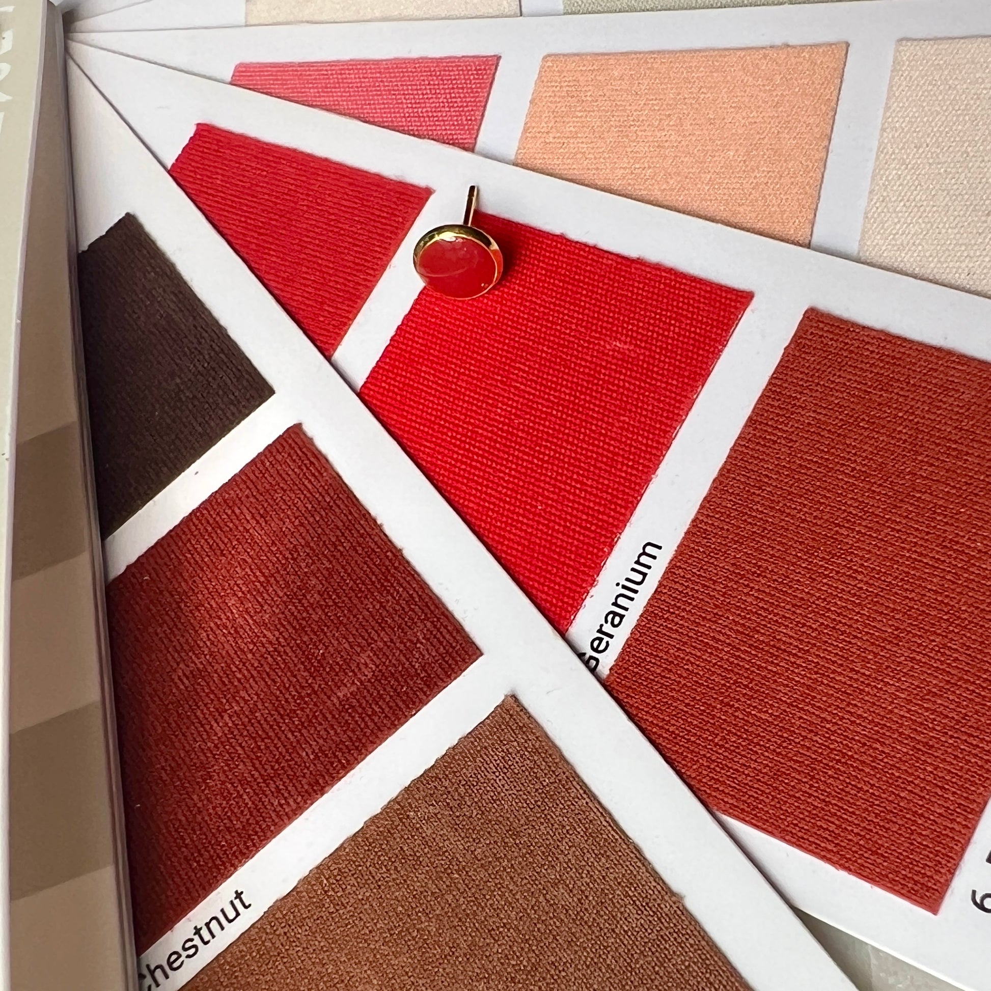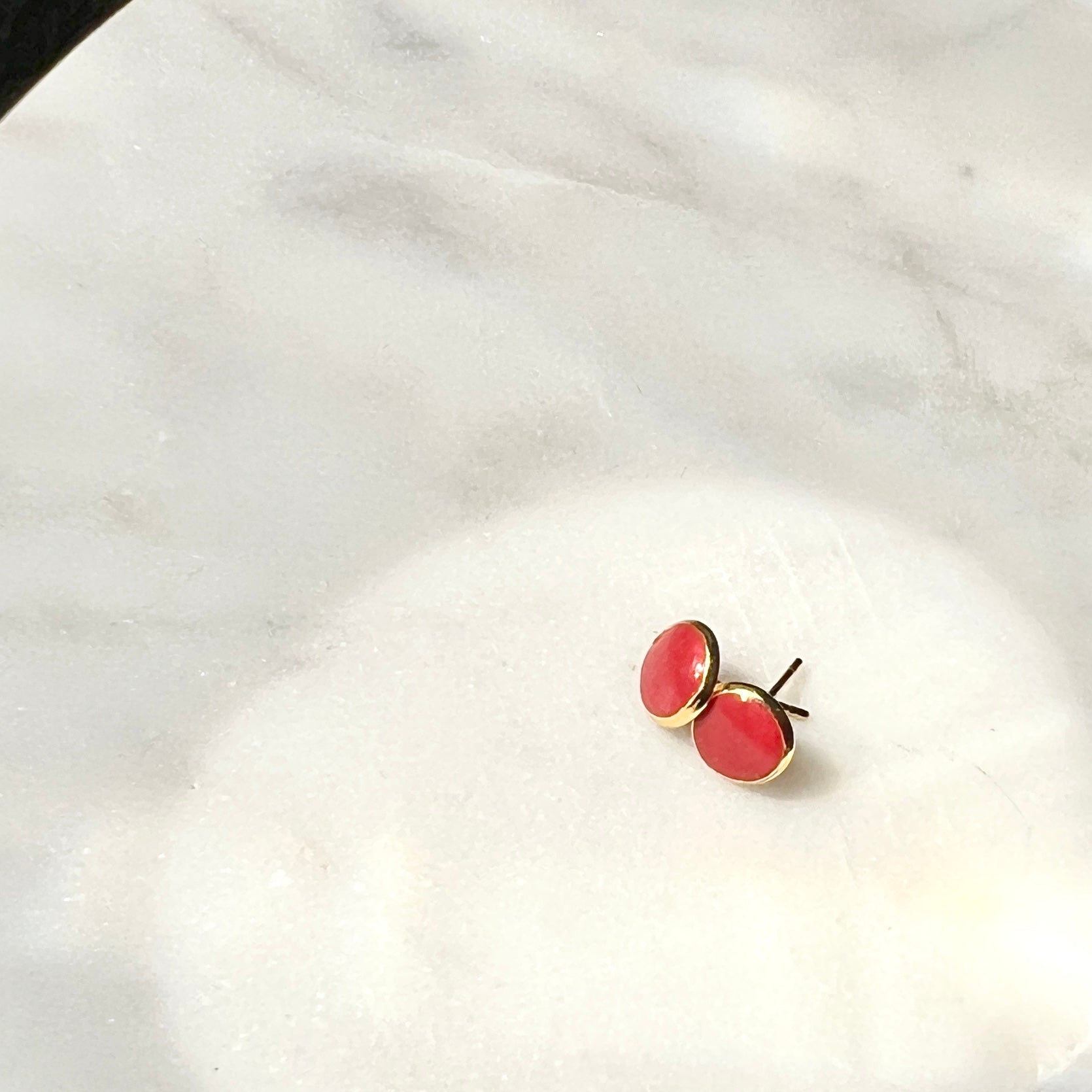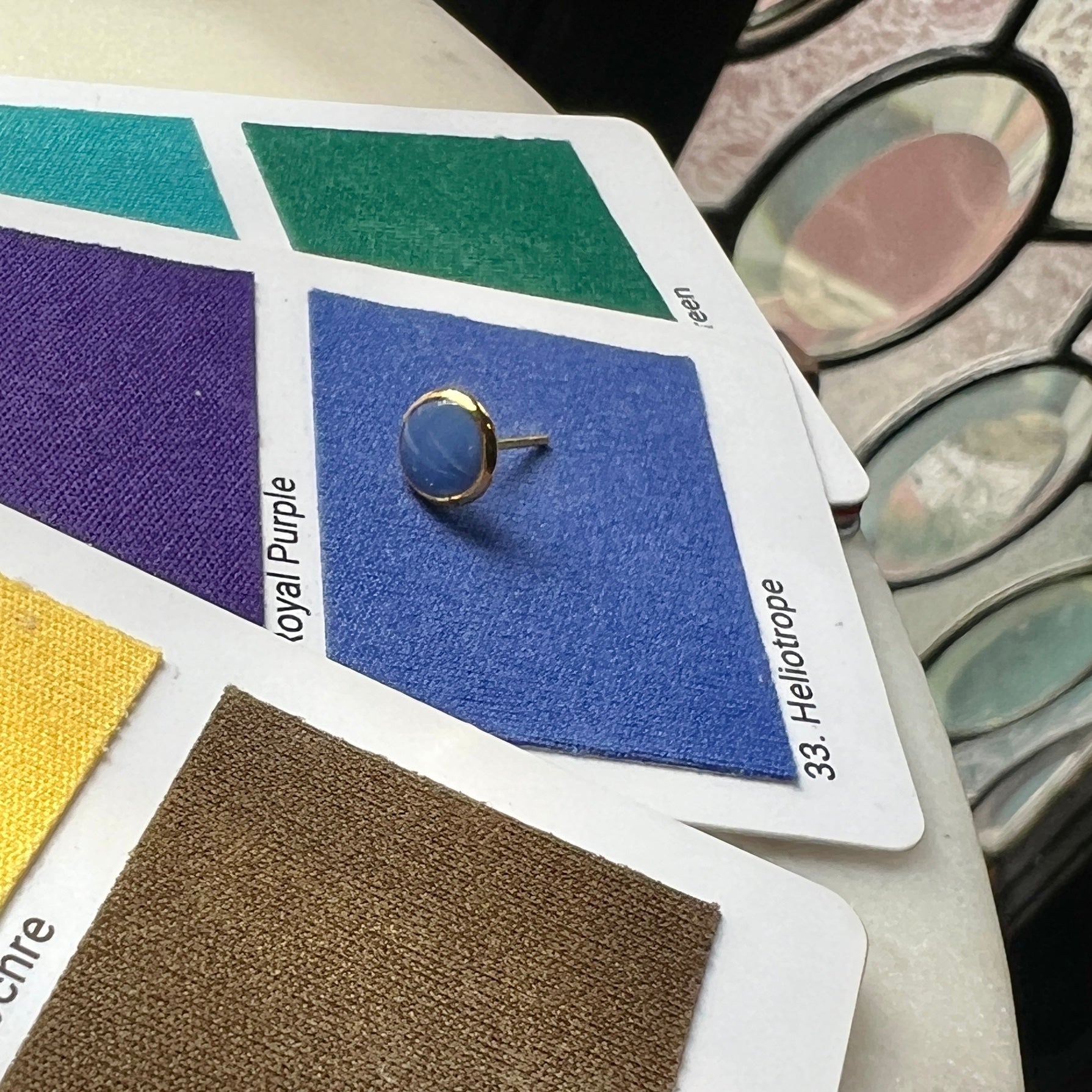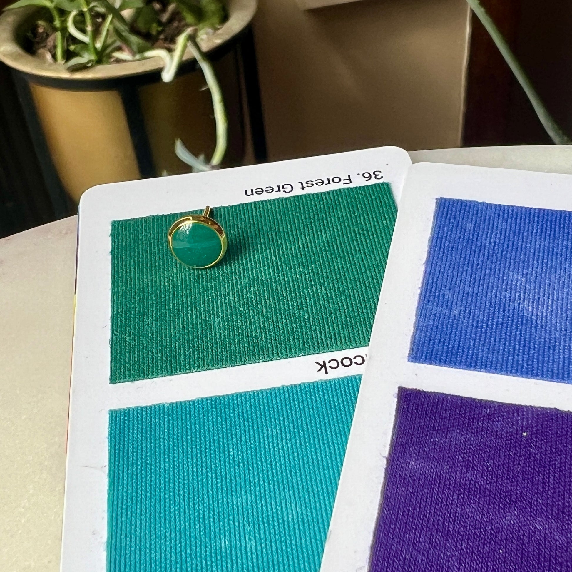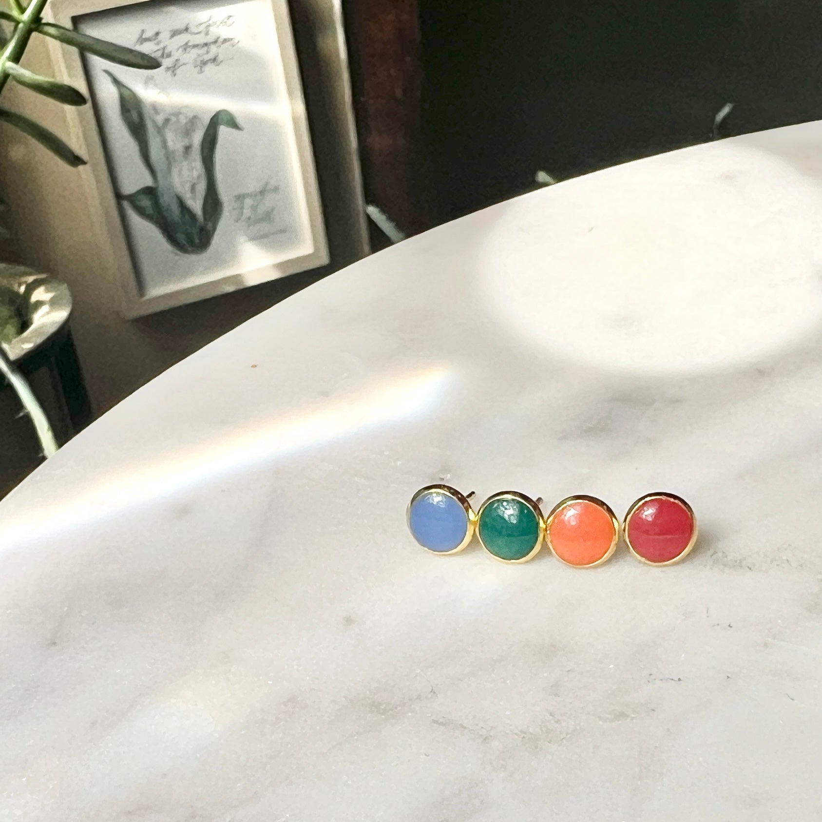 The Back to Basics small stud is a gold-plated, stainless steel setting filled with the color of your choice from the House of Colour autumn and spring palette. It is then finished with UV resin for shine and durability. The stud is 6 mm in diameter.