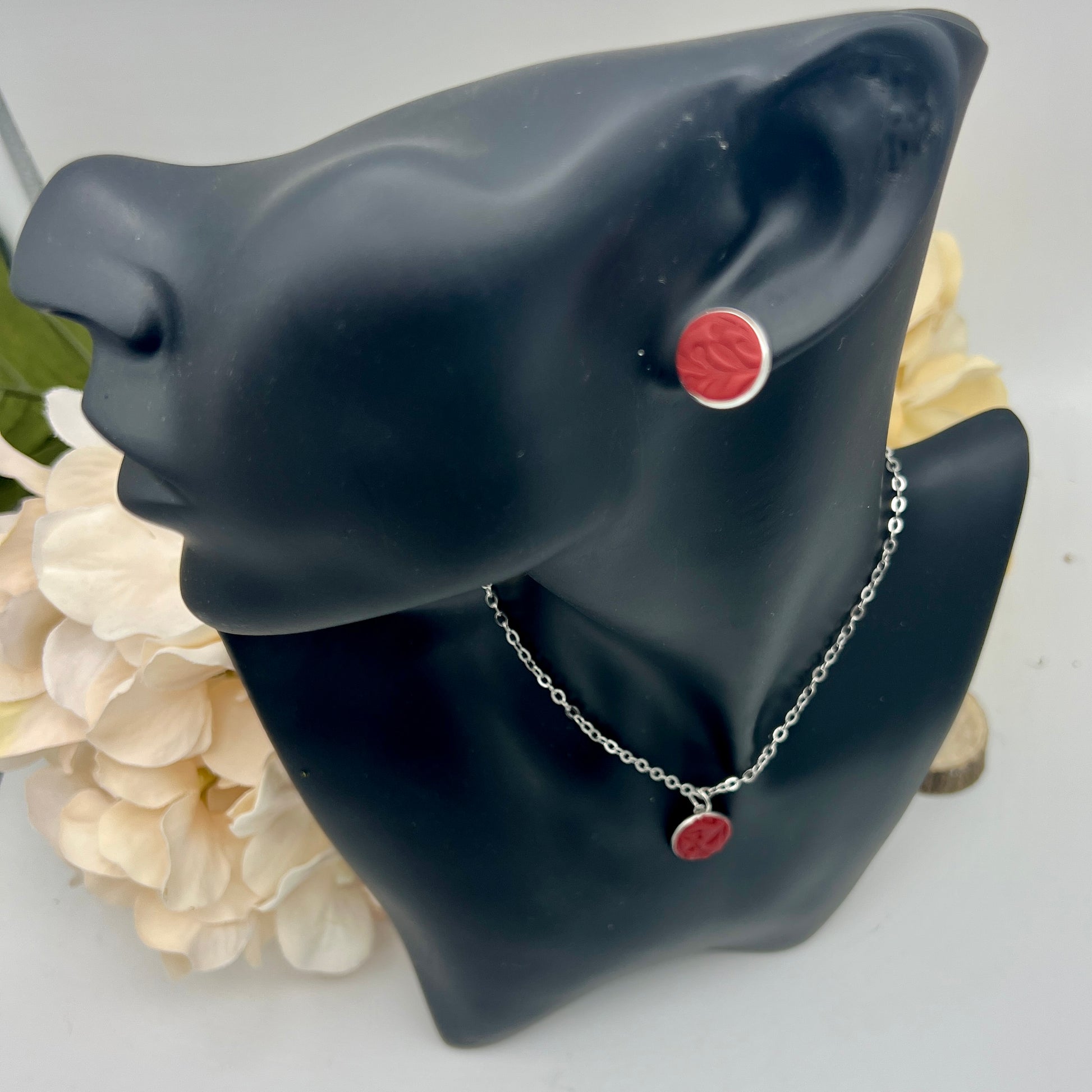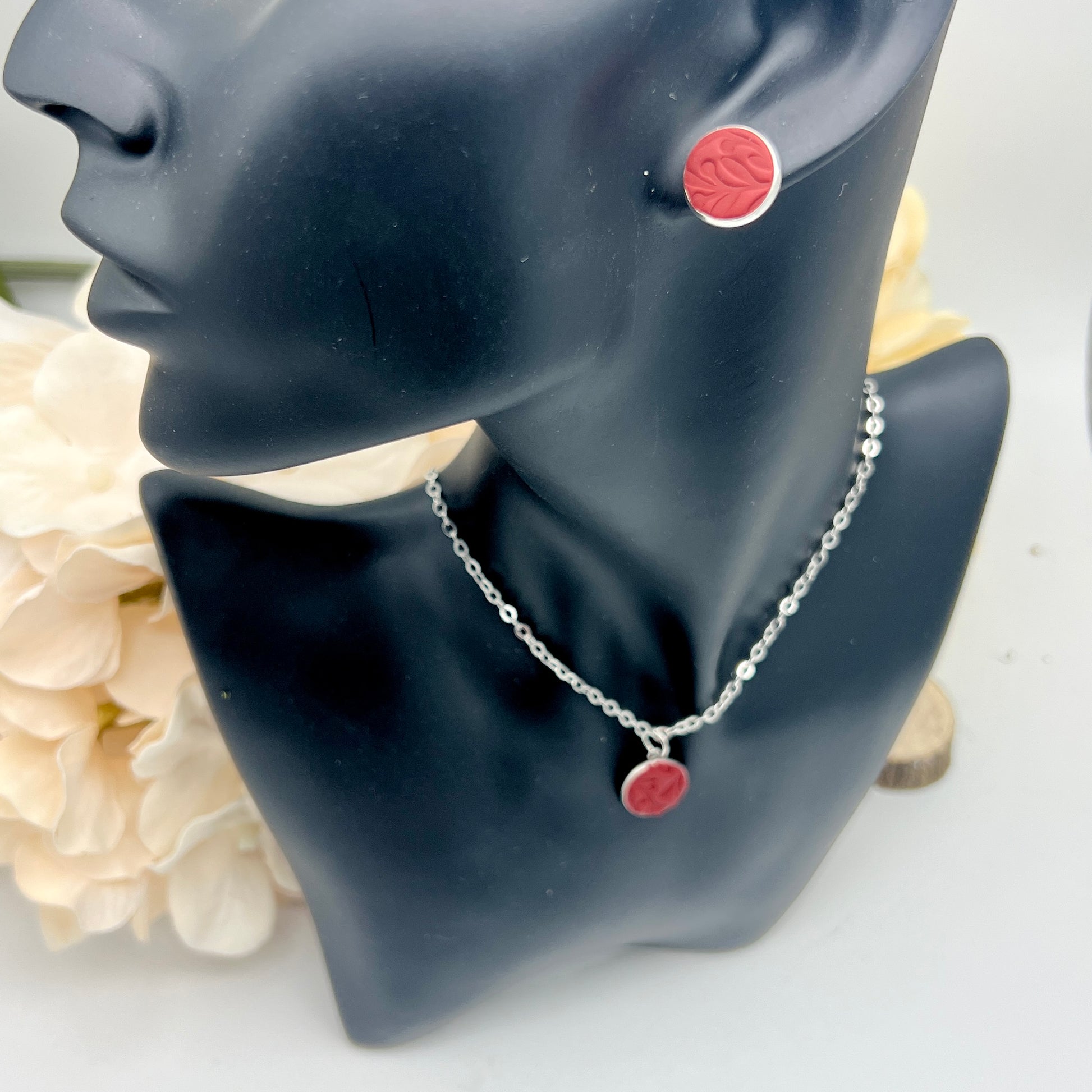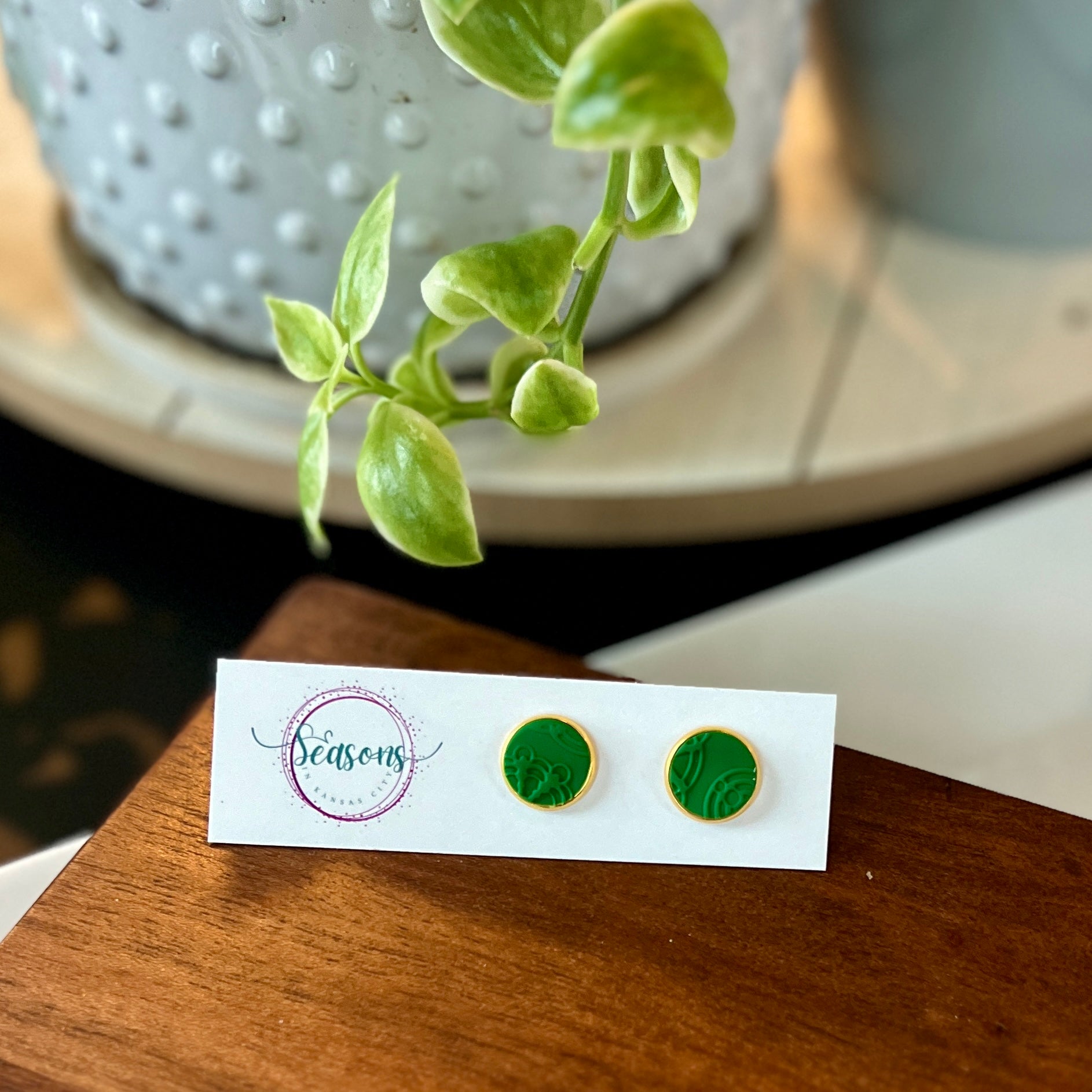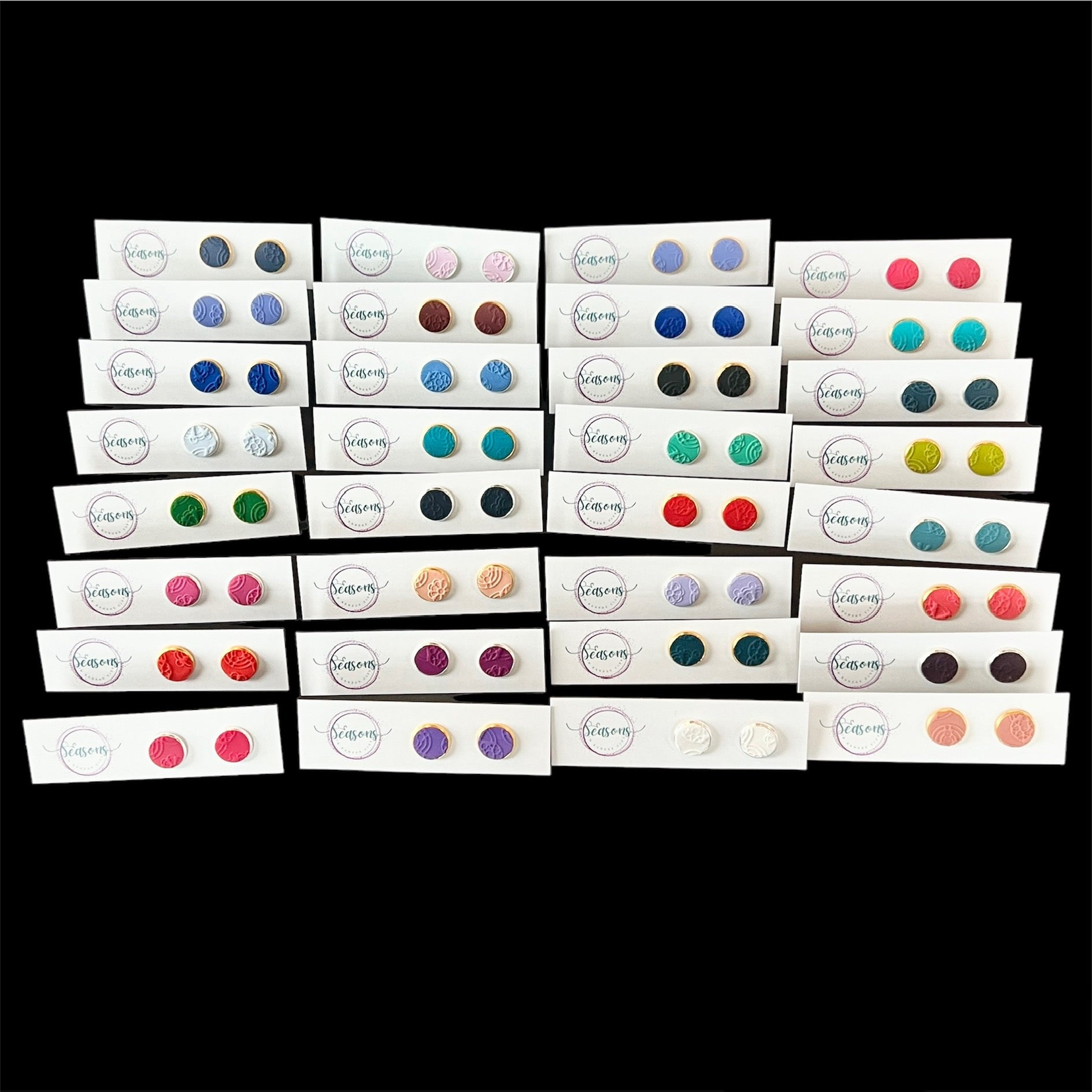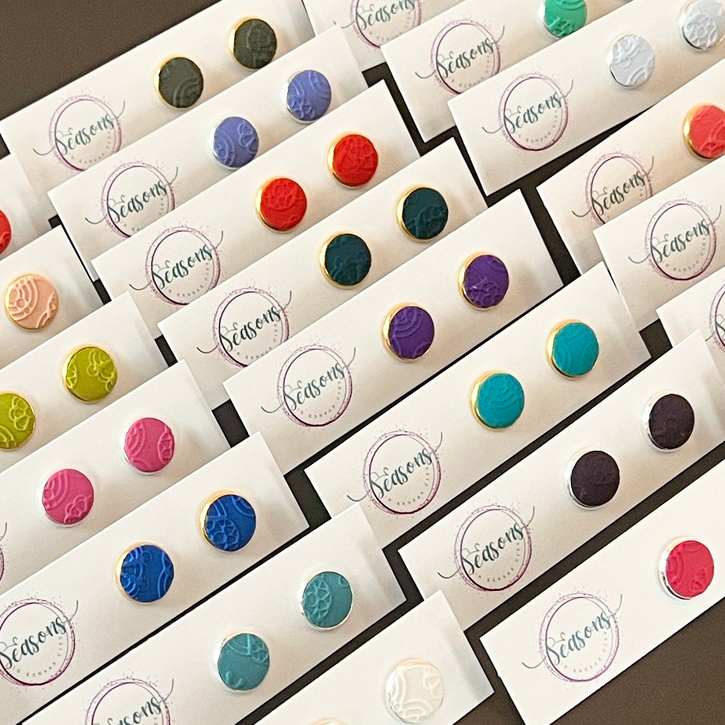 A stainless steel beveled base is filled with a solid color clay to match a variety of shades in all four season's palette. The clay is finished with a lace pattern embossed detail.