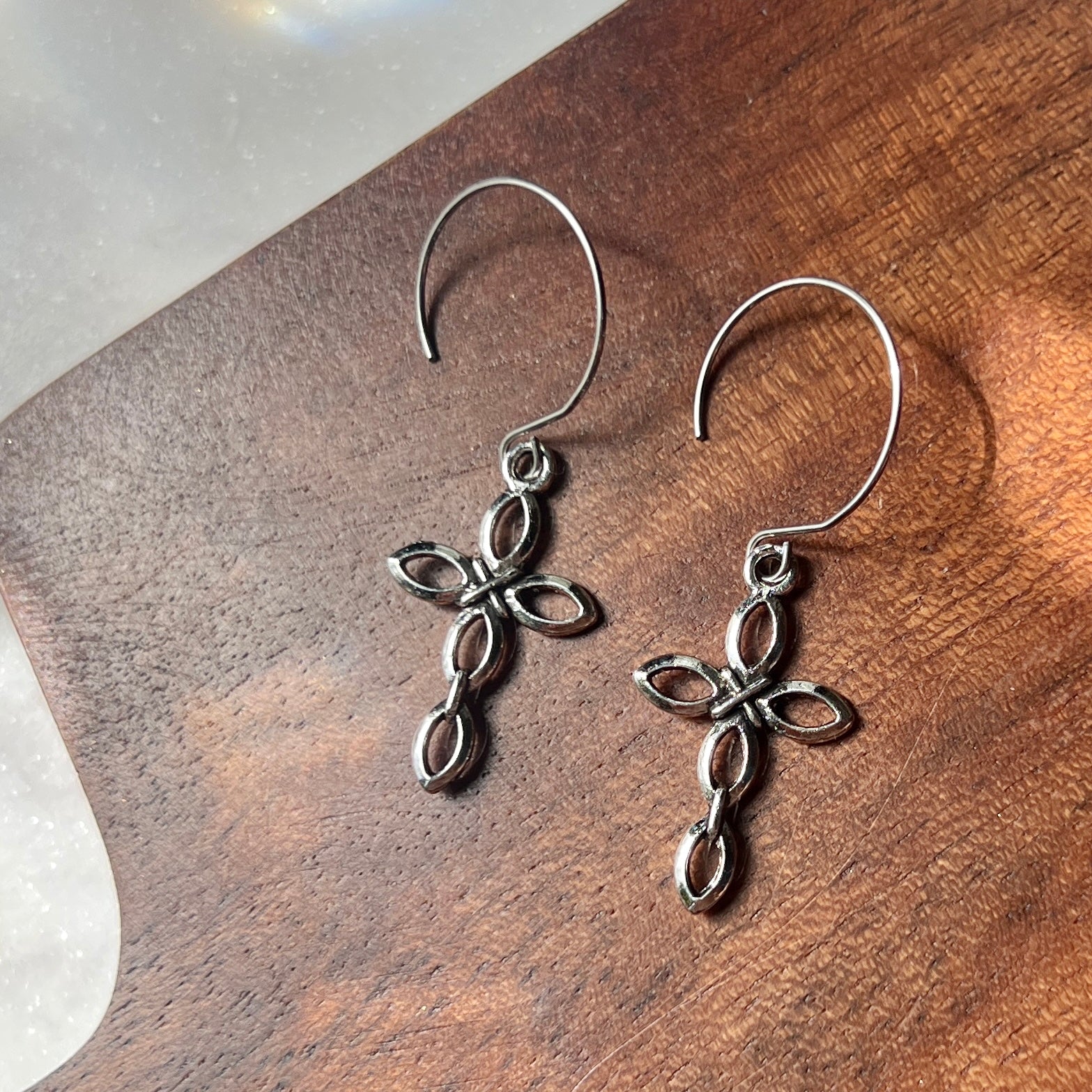 A silver, stainless steel plated cross dangles slightly over 1" from the earring hook.