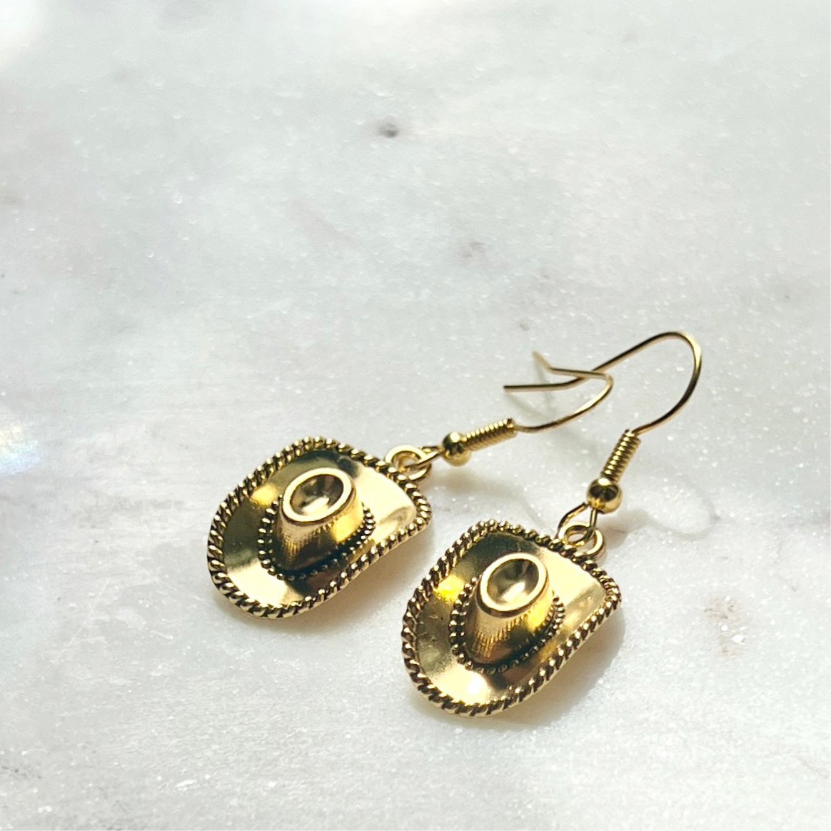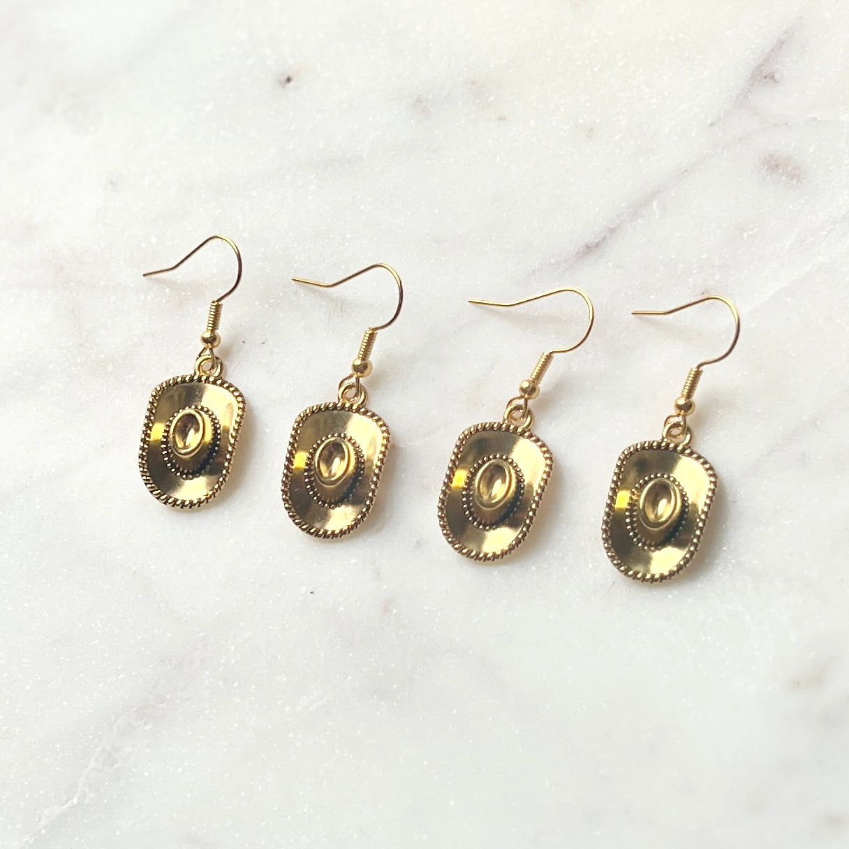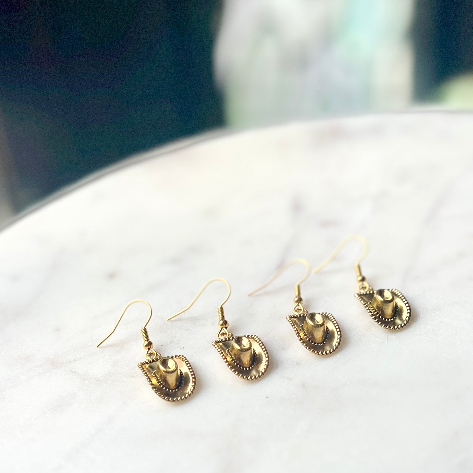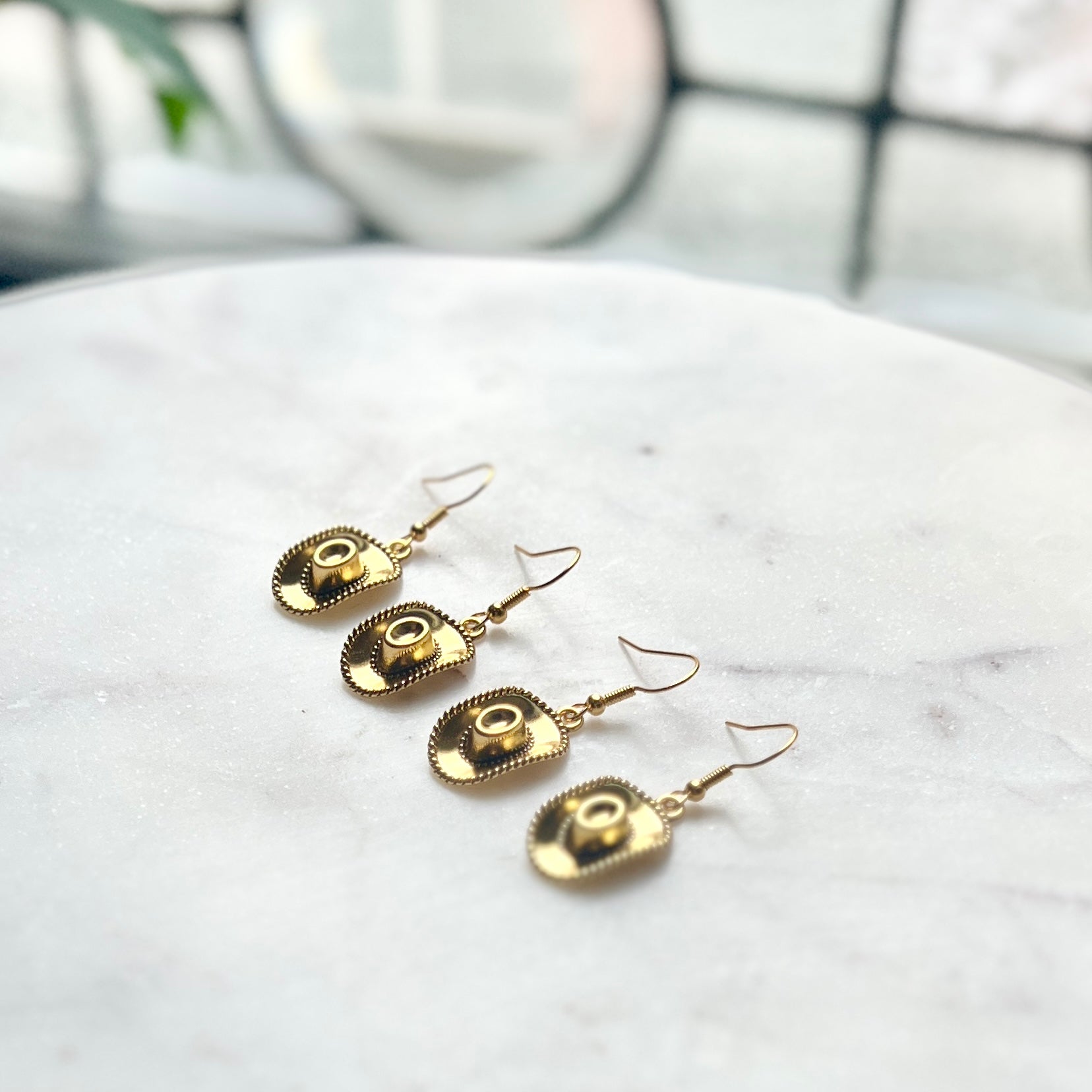 A gold plated, stainless steel, 3/4" long cowgirl hat dangles on an earring hook.