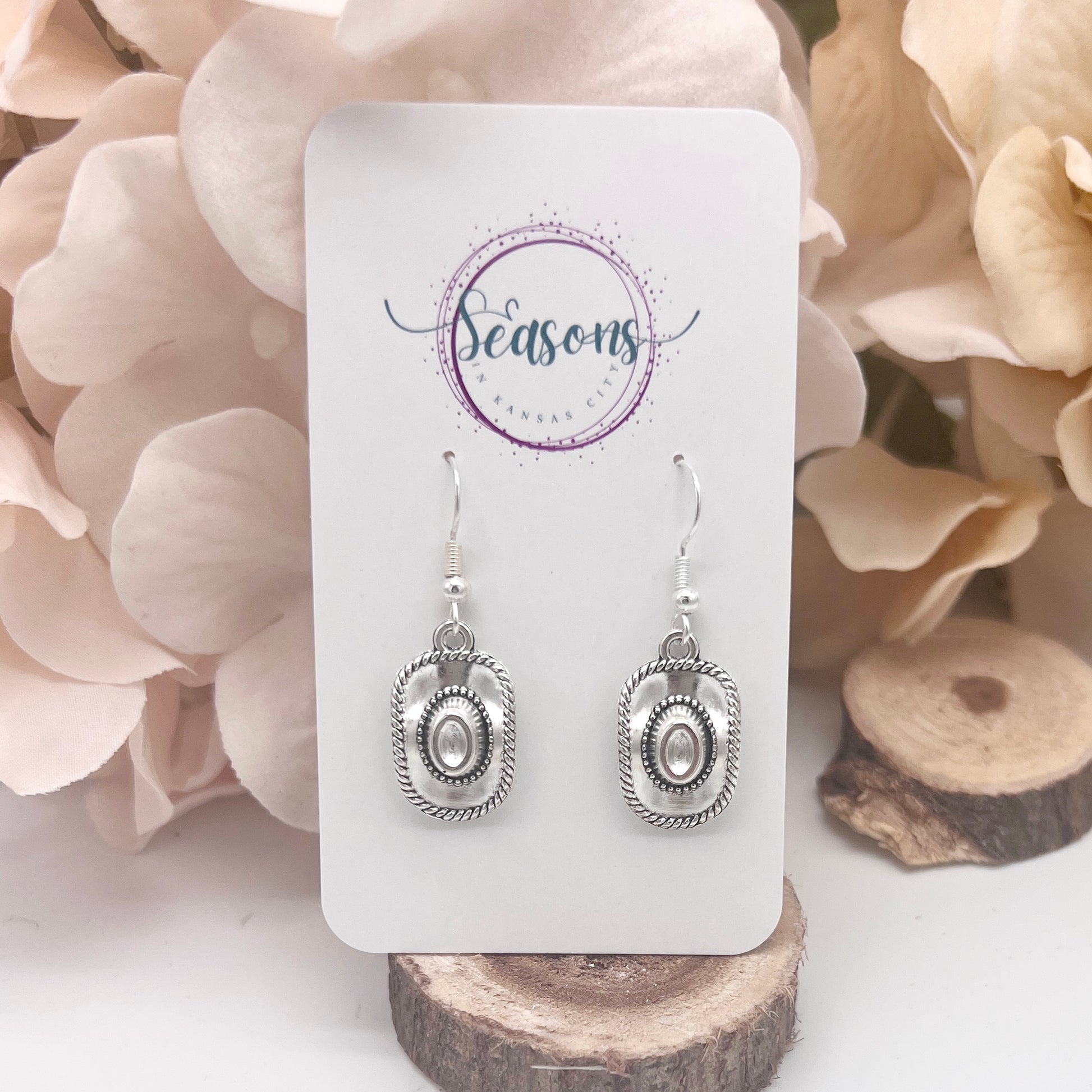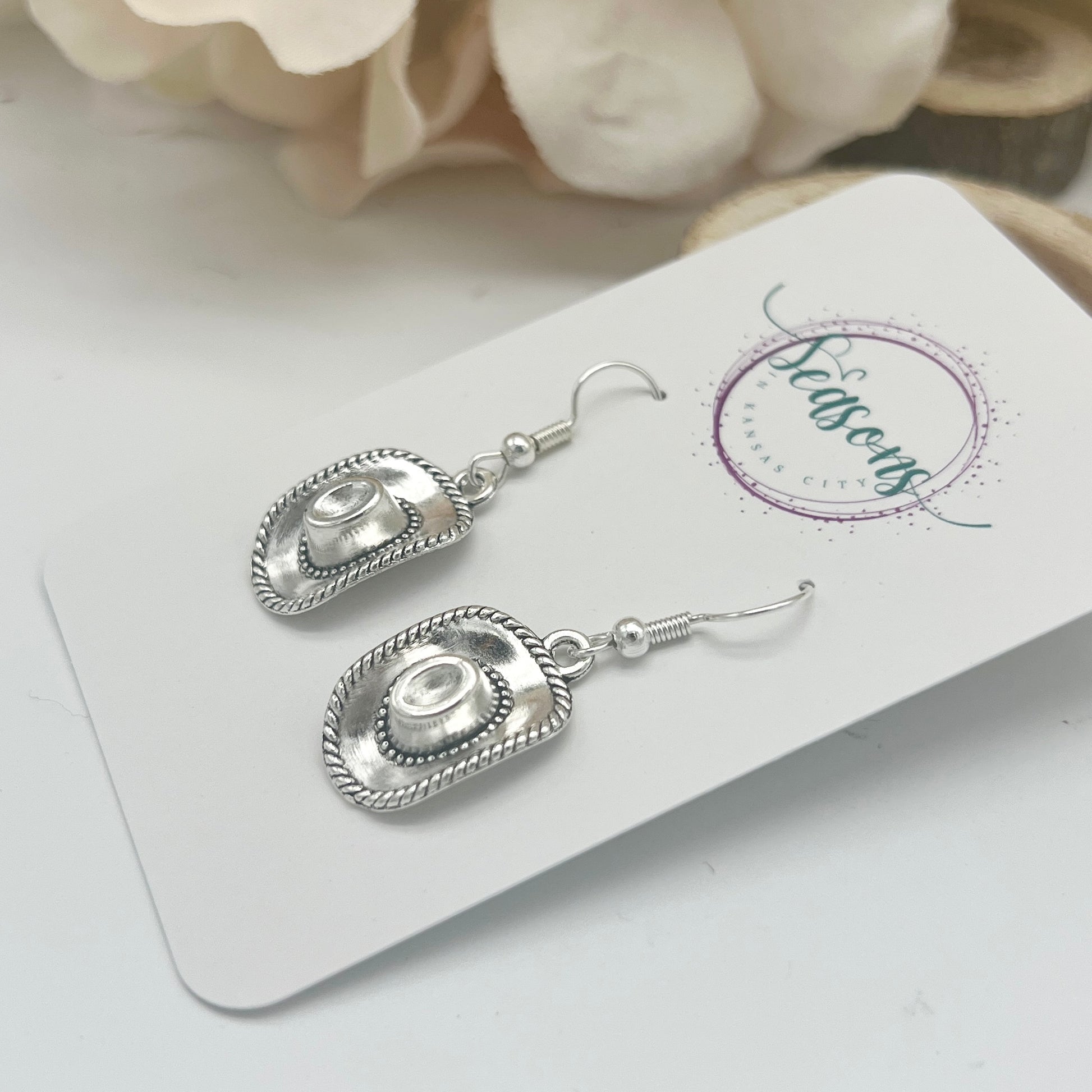 A silver, stainless steel plated, 3/4" long cowgirl hat dangles on an earring hook.