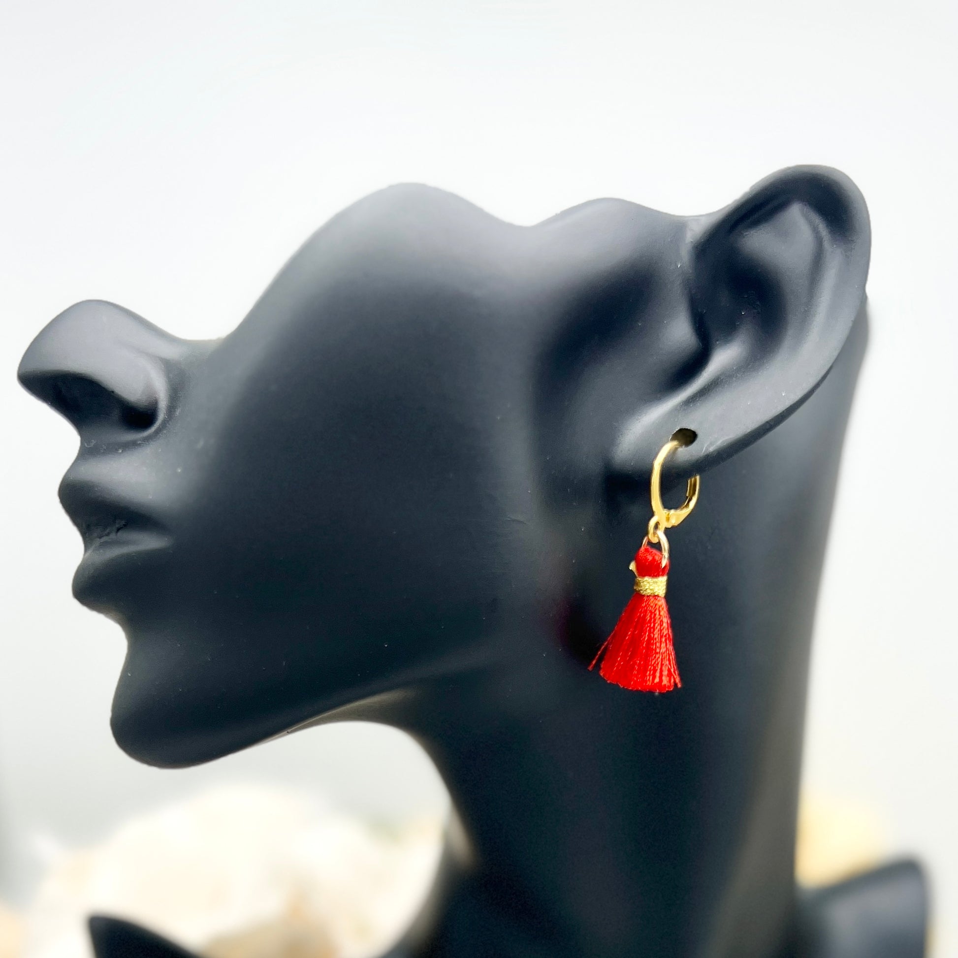 A geranium tassel measures 3/4" tall. It dangles from a stainless steel, gold plated huggie.