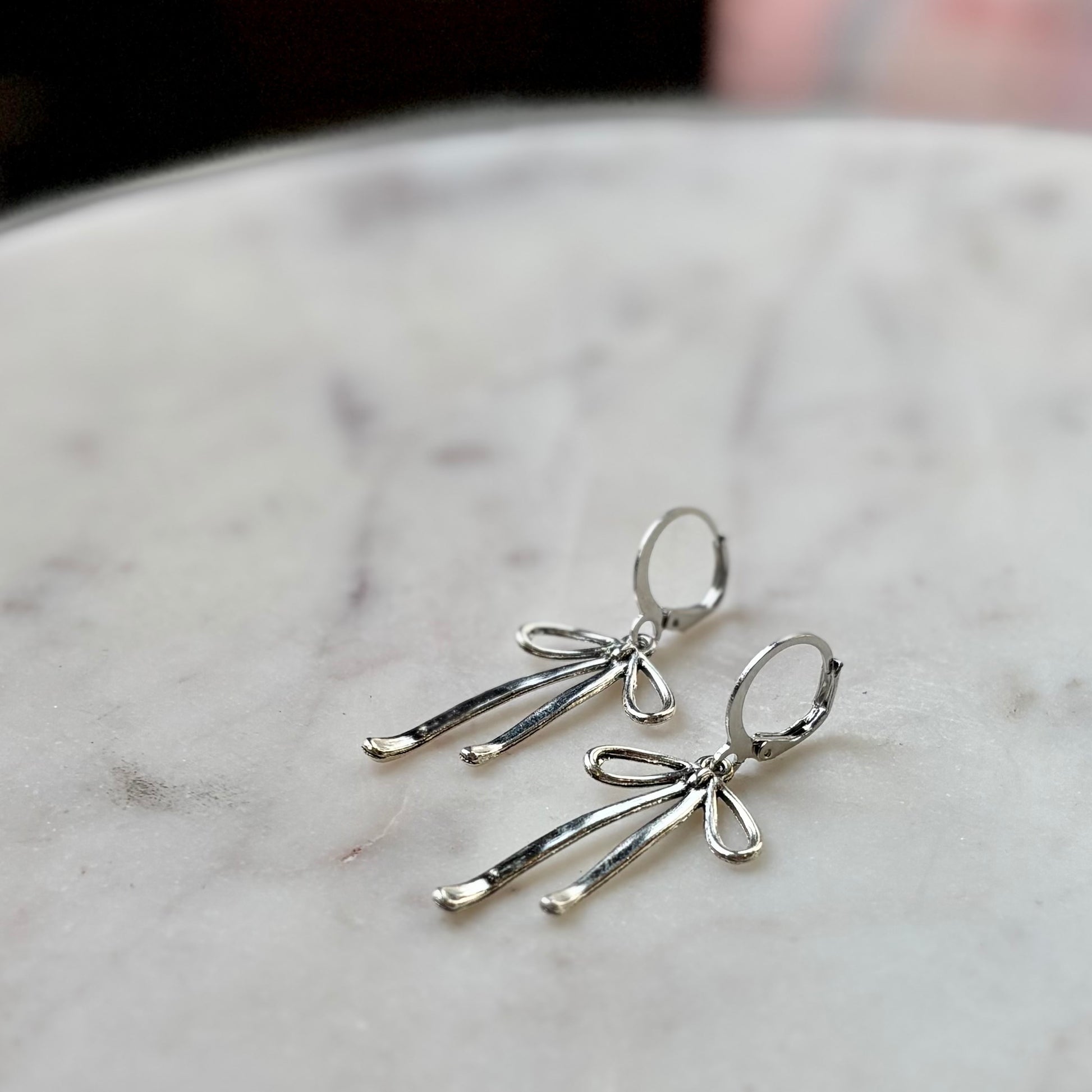A 1.25” long bow dangles from a stainless steel huggie.