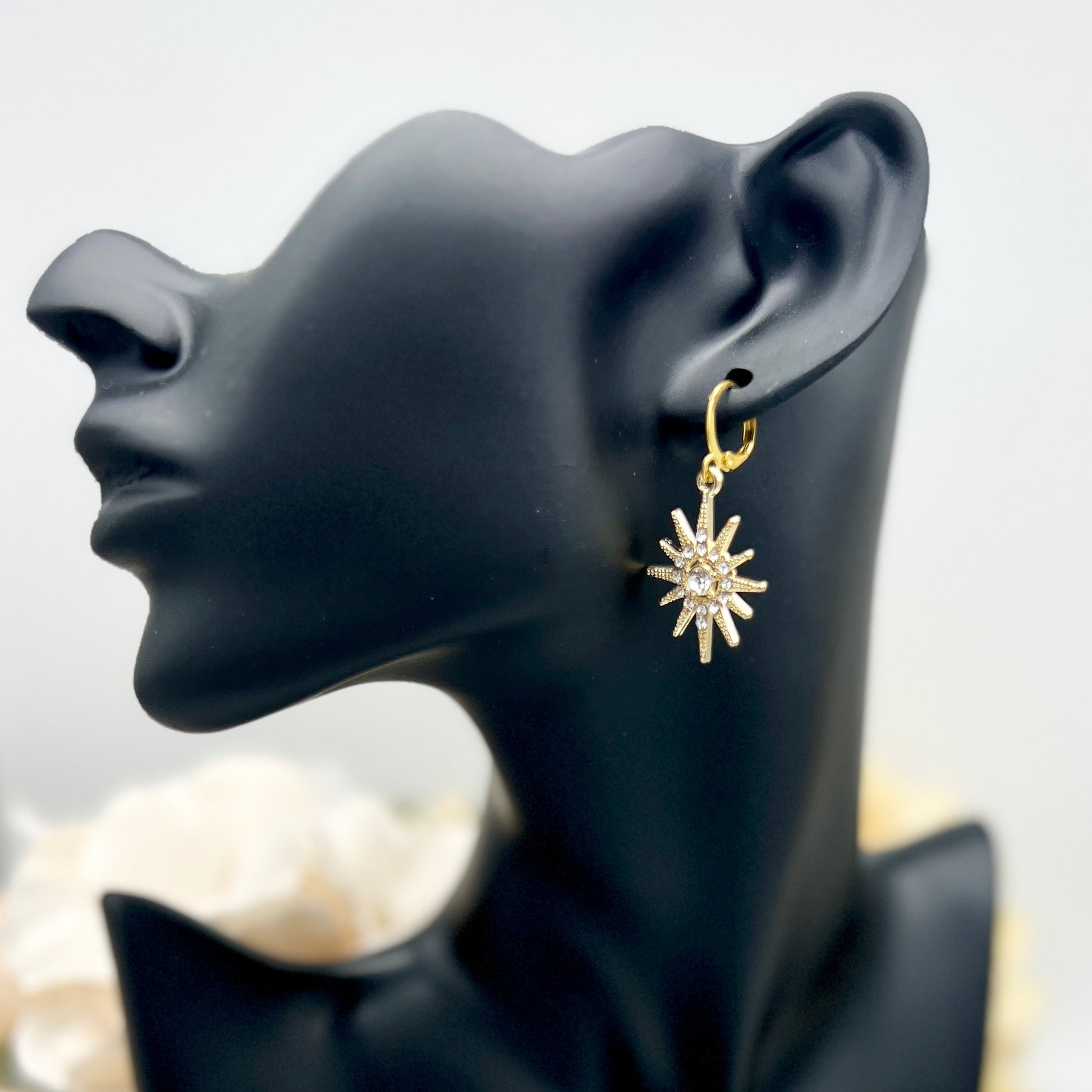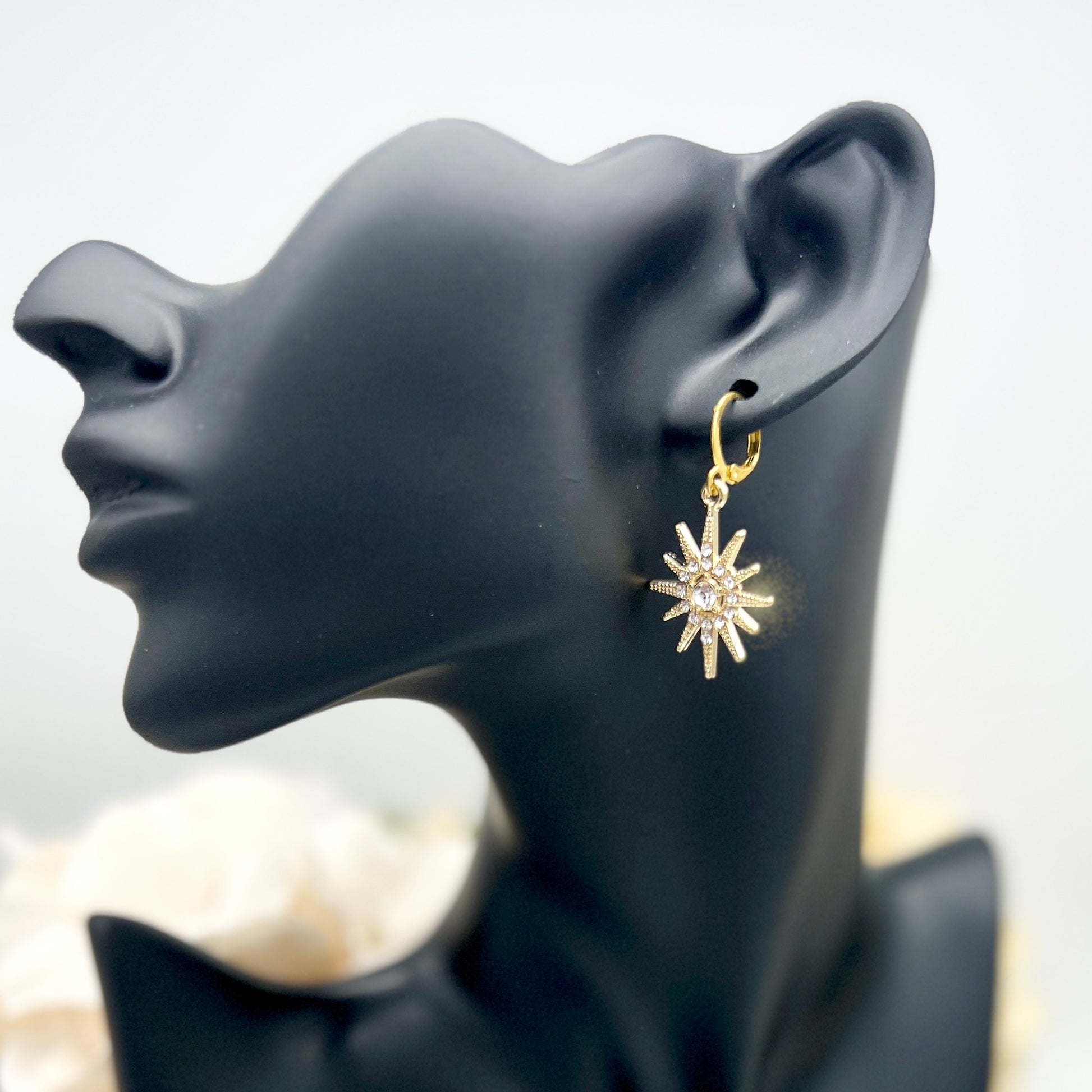 A gold plated starburst measures 3/4" wide and 1" tall. It dangles from a stainless steel, gold plated earring hook.