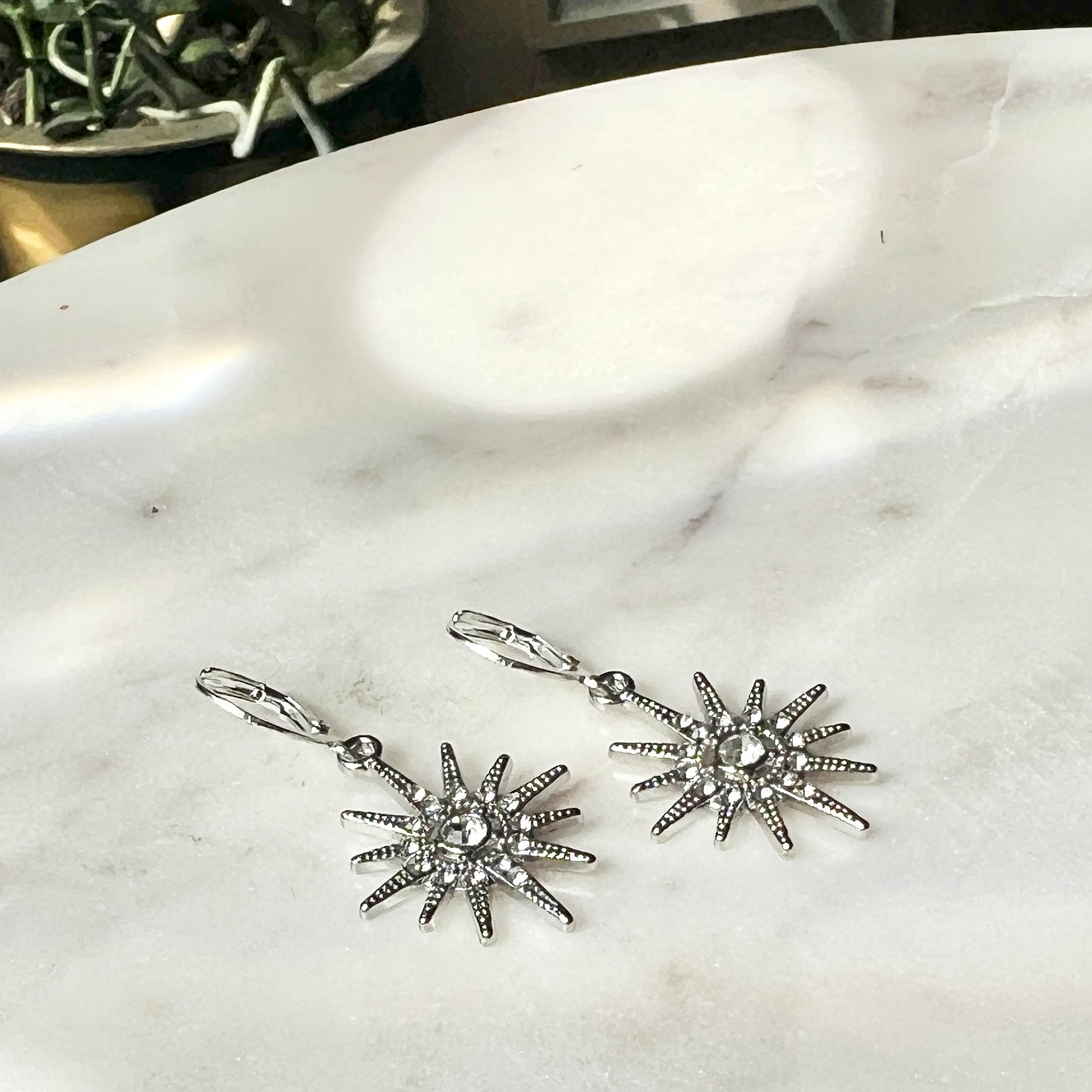 A gold plated starburst measures 3/4" wide and 1" tall. It dangles from a stainless steel, gold plated earring hook.