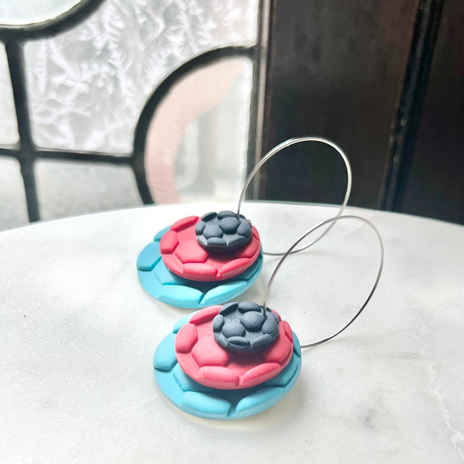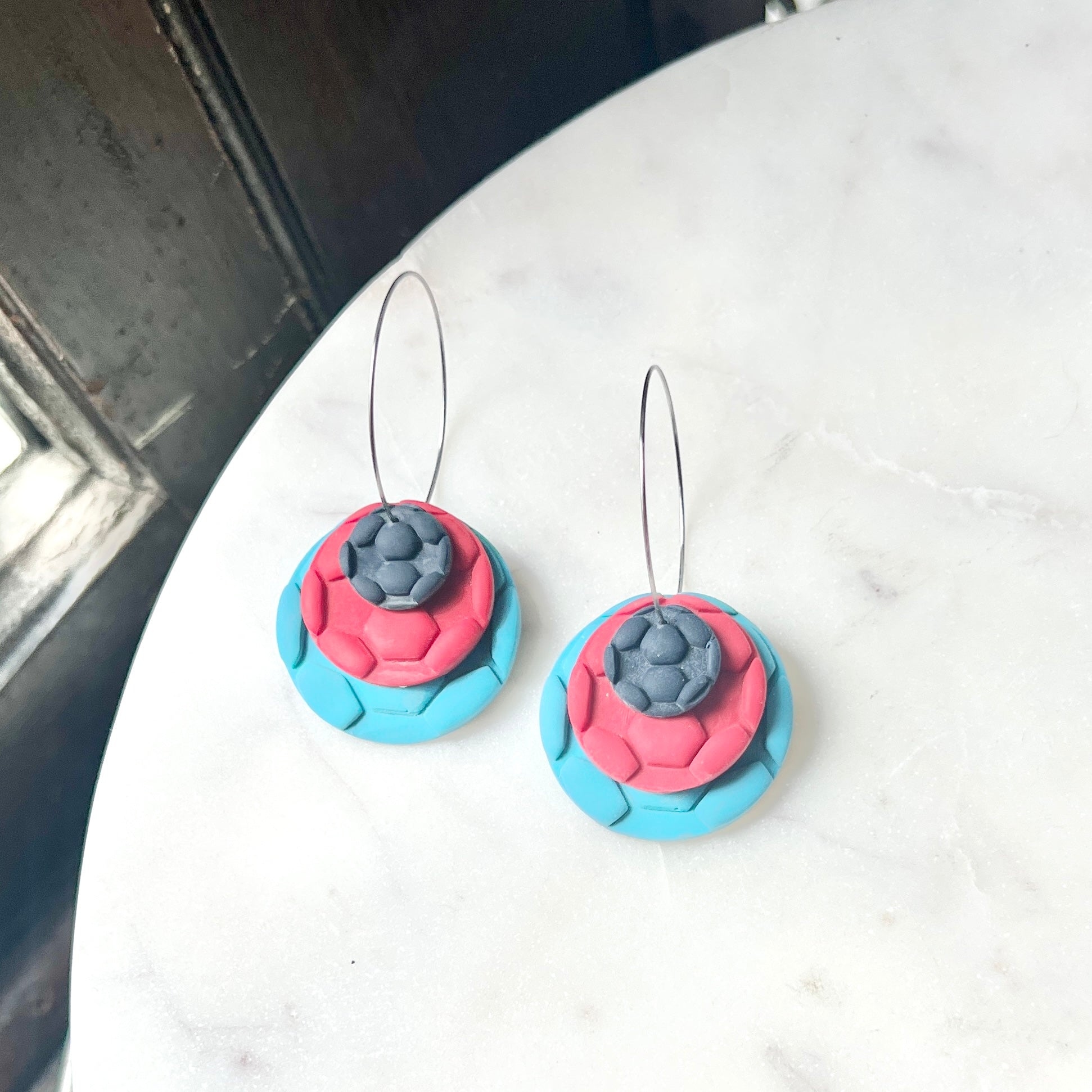 This large scale trio is made from teal, red, and navy to coordinate with the KC Current women’s soccer team colors. The largest soccer ball is approximately 4 cm across. They are finished with stainless steel hardware.