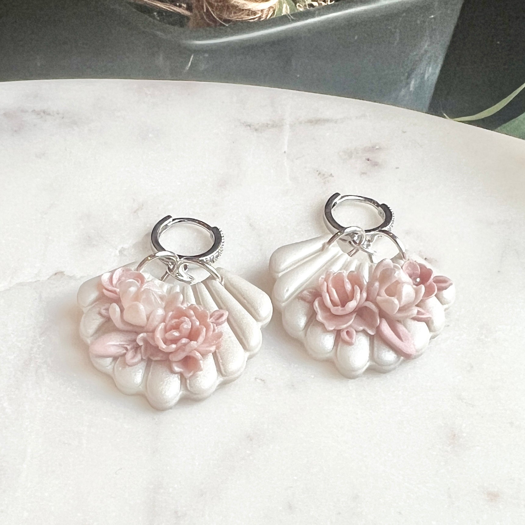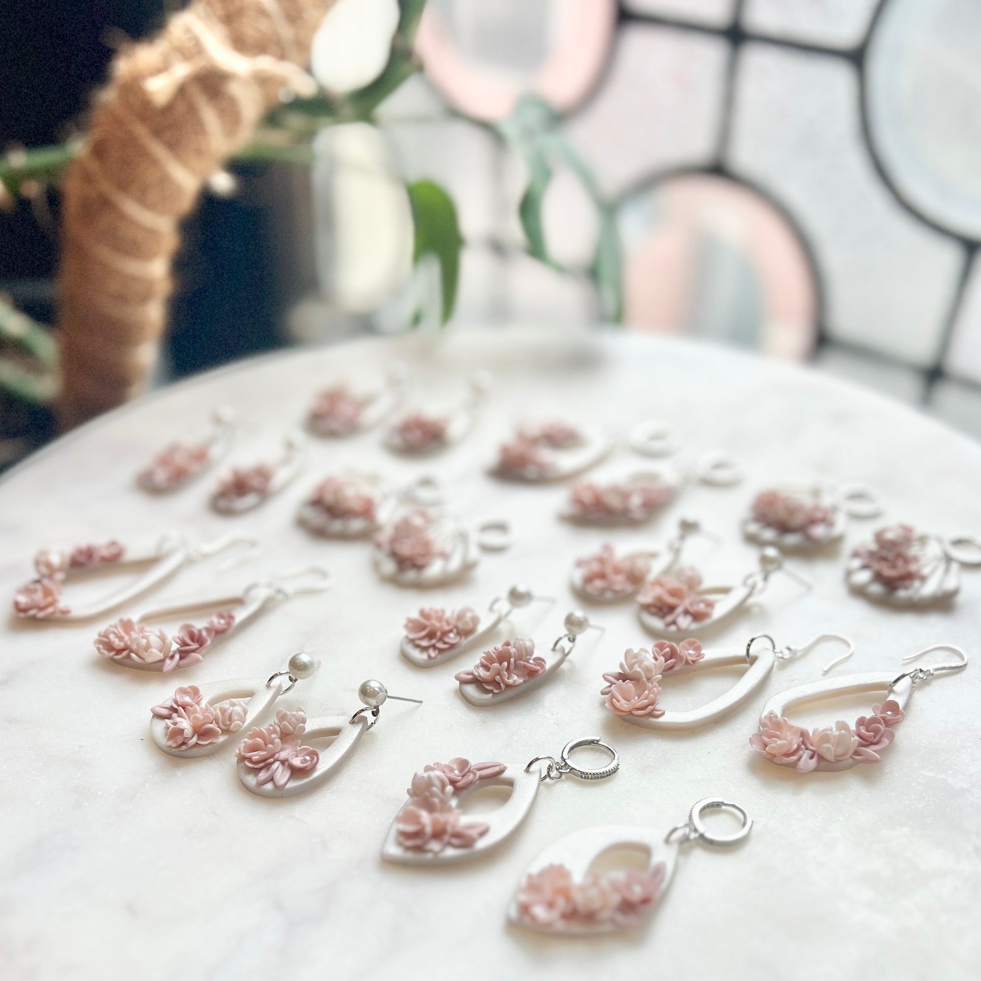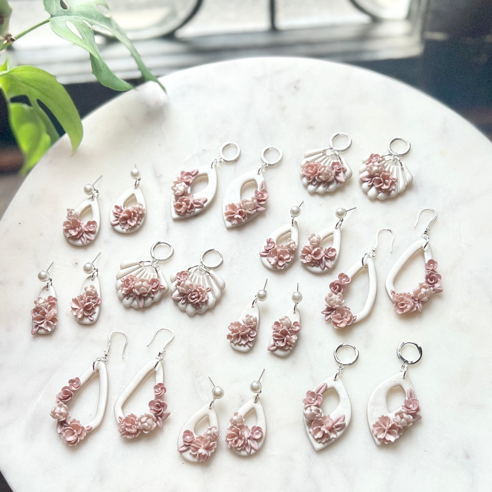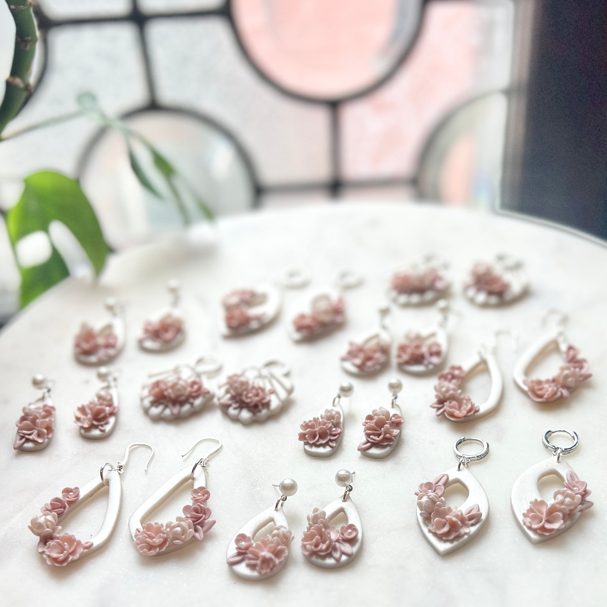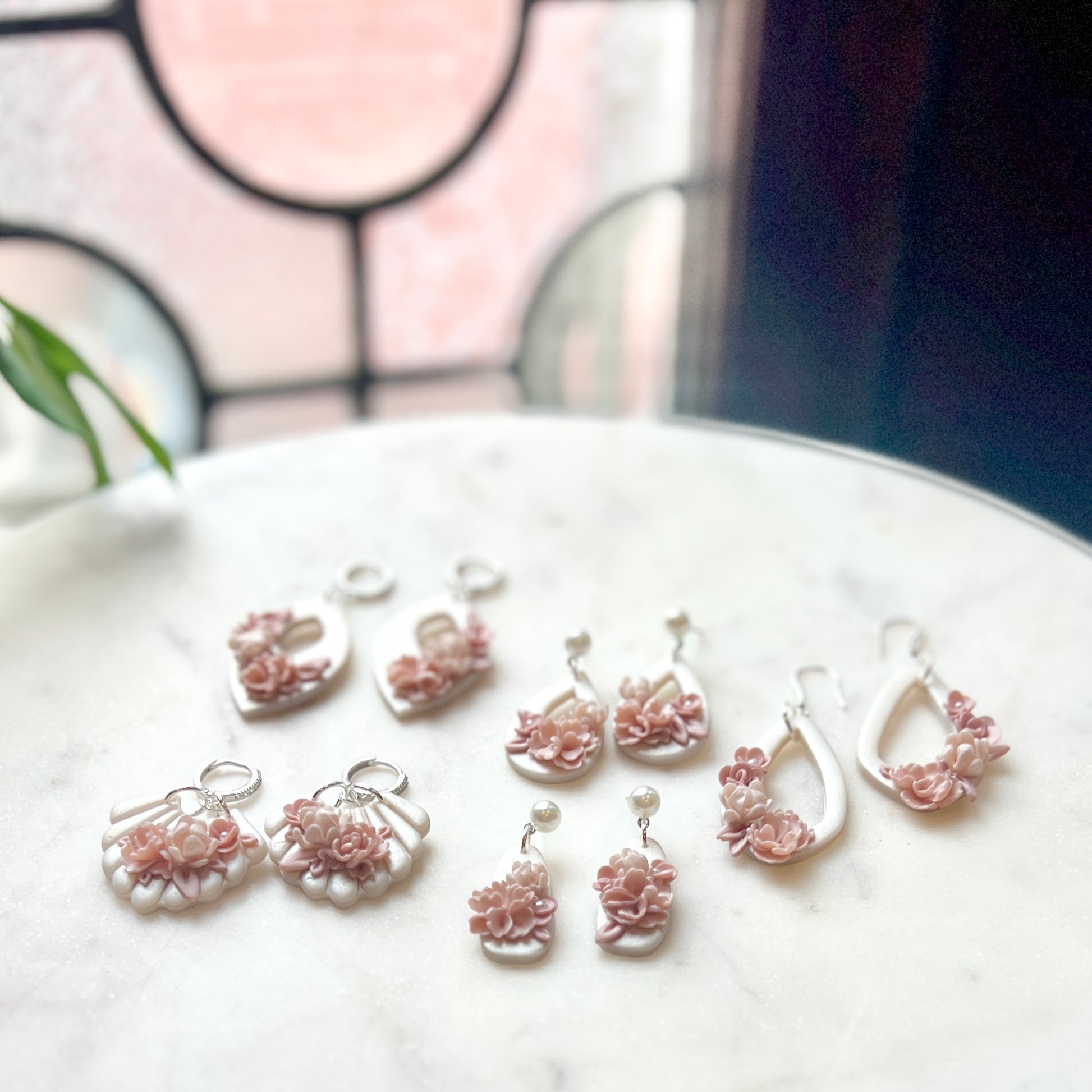 Elaina is an opalescent collection with just the perfect amount of shimmer. Each hand crafted flower is in a shade of pink to coordinate with the House of Colour summer palette. Hardware is stainless steel with either pearl or gem detailing.