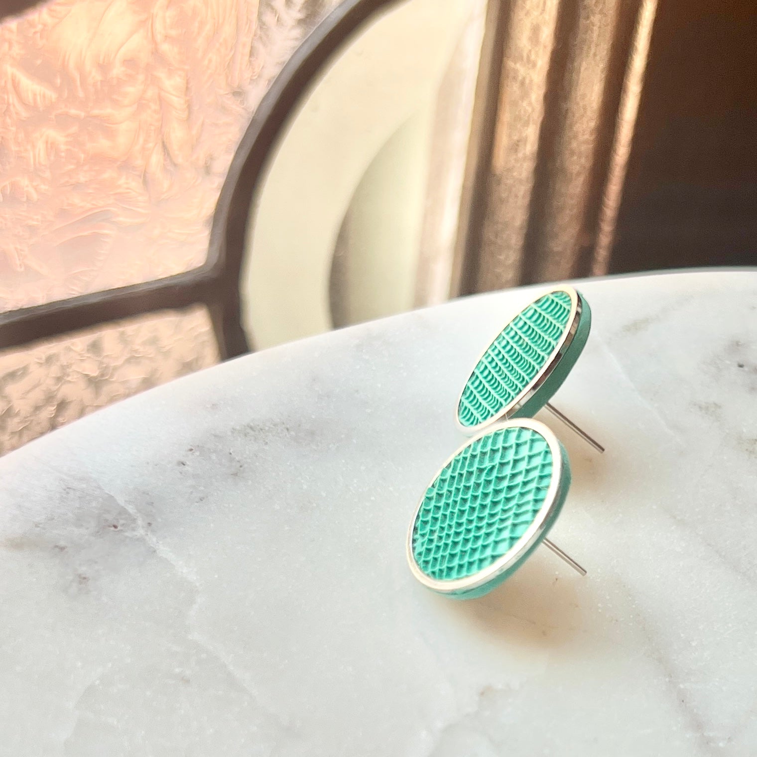 A cool green that coordinates with both the summer and winter palette is given a geometric embossed pattern and finished with silver, stainless steel hardware.