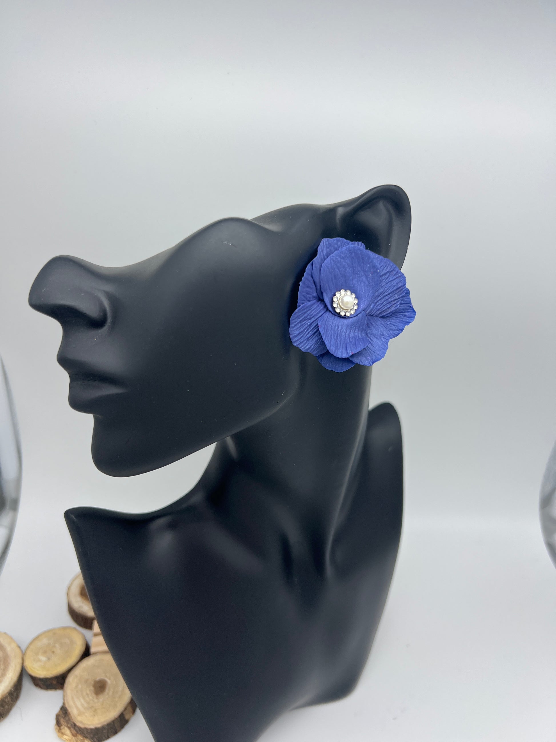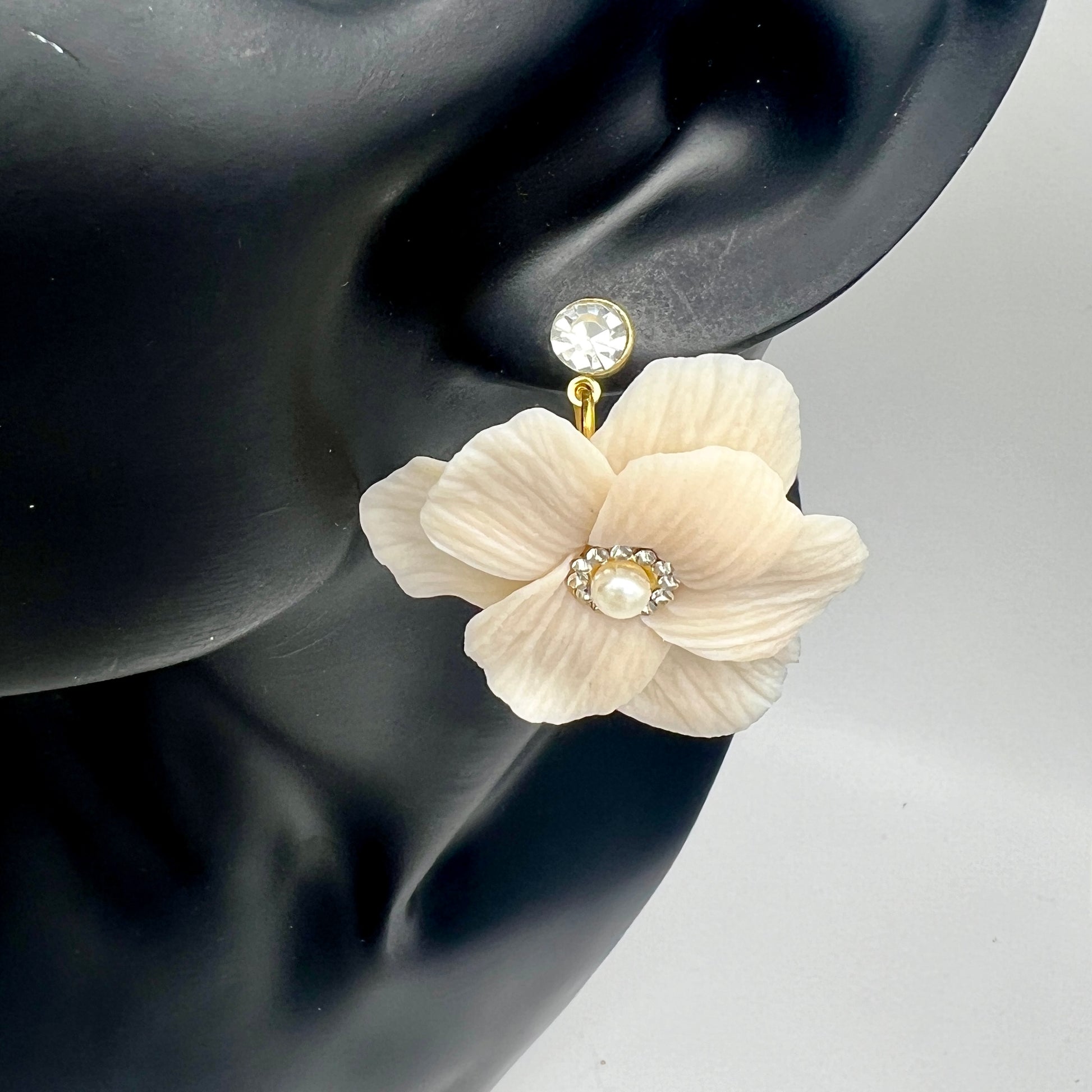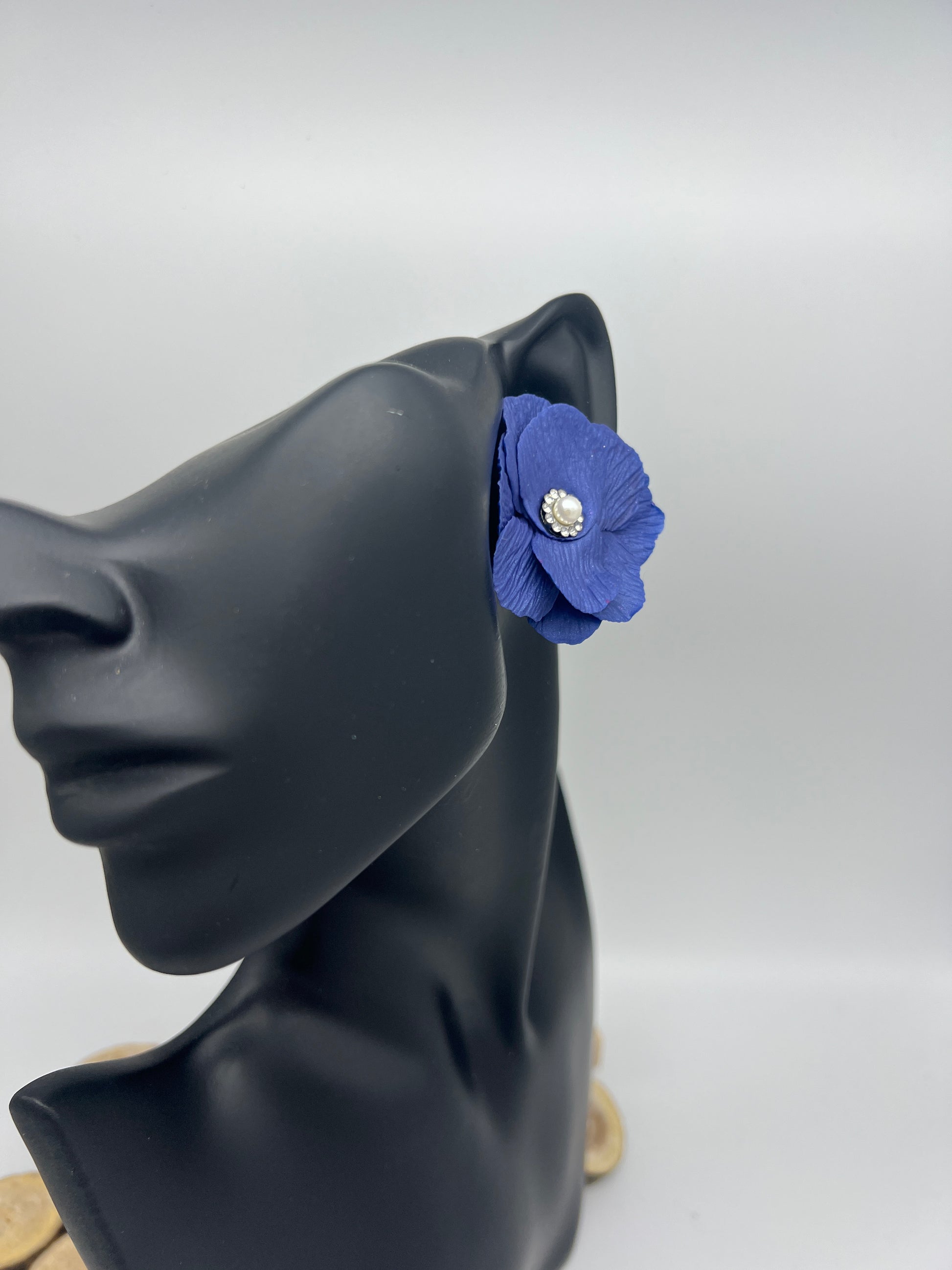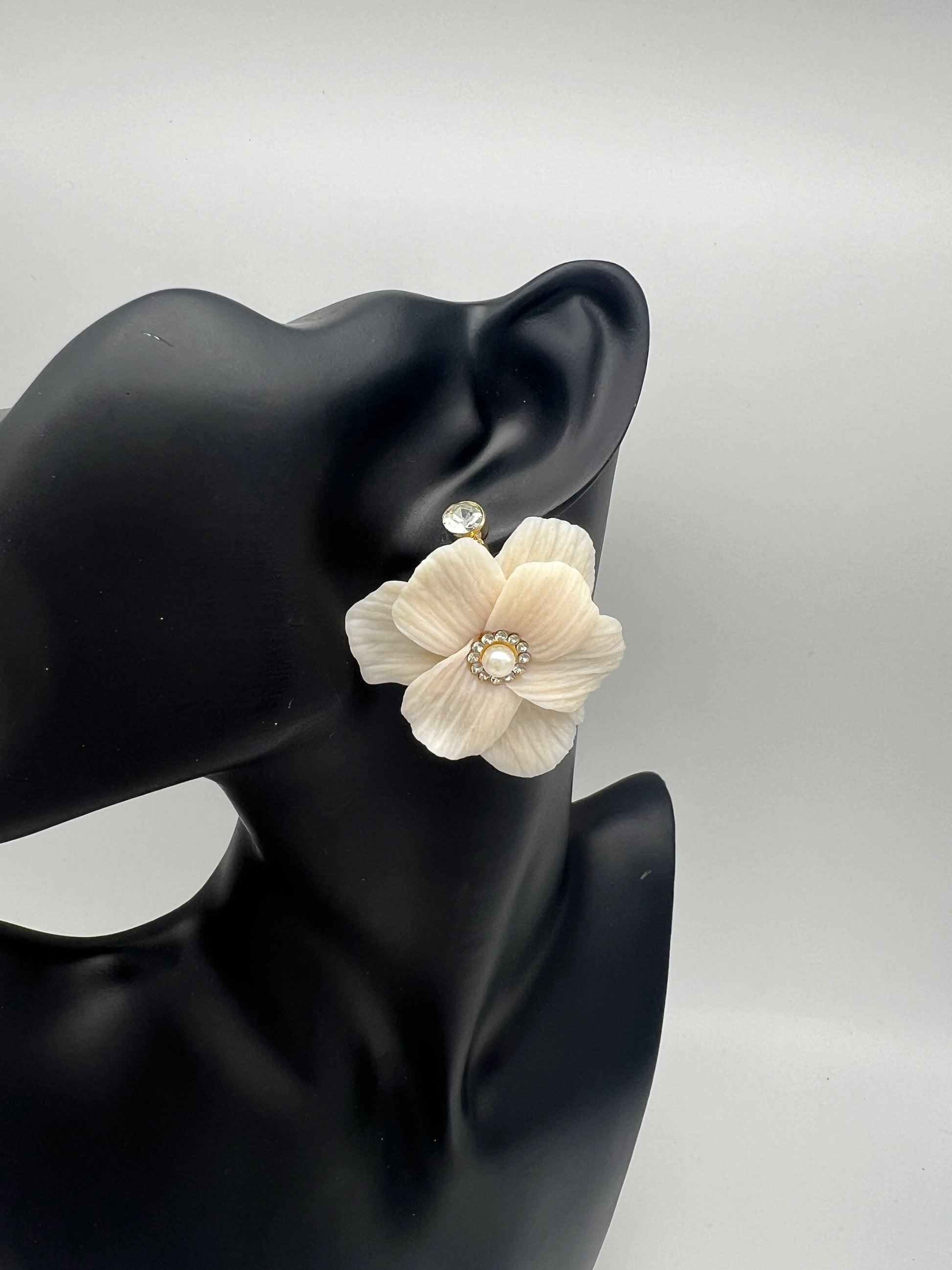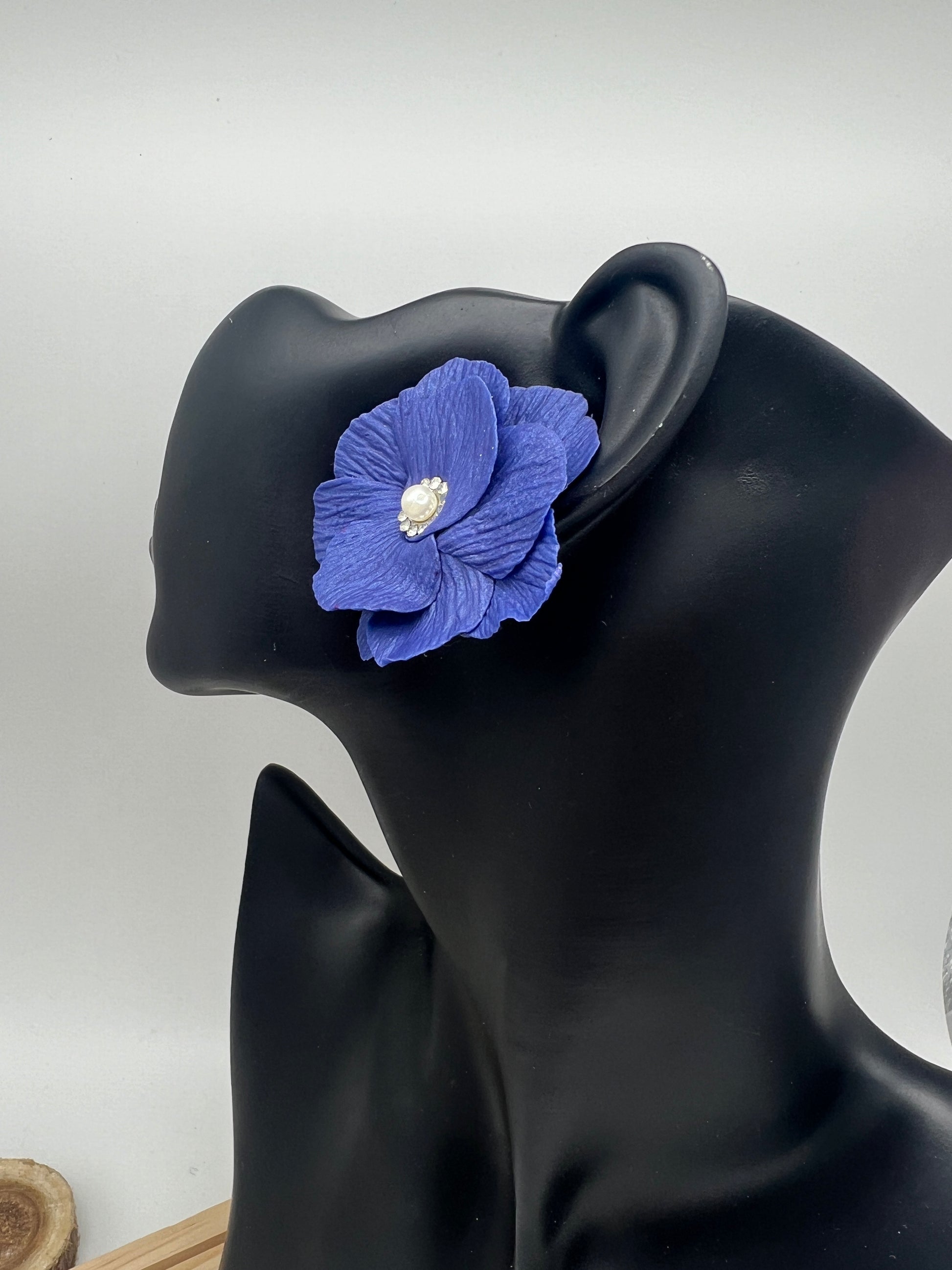 The Juliette custom color flower can be made in any color of your choosing and in iridescent or matte. It is finished with a pearl center surrounded by cubic zirconia with either silver or gold metal. It can be made as a large scale stud or dangle with cubic zirconia stud.