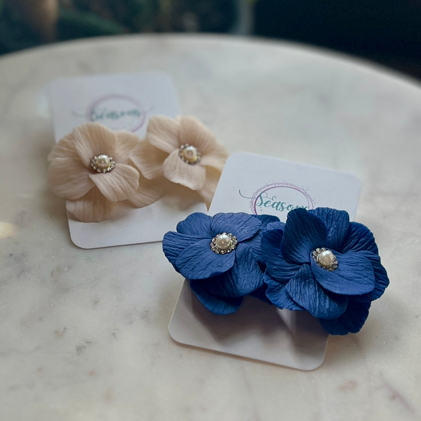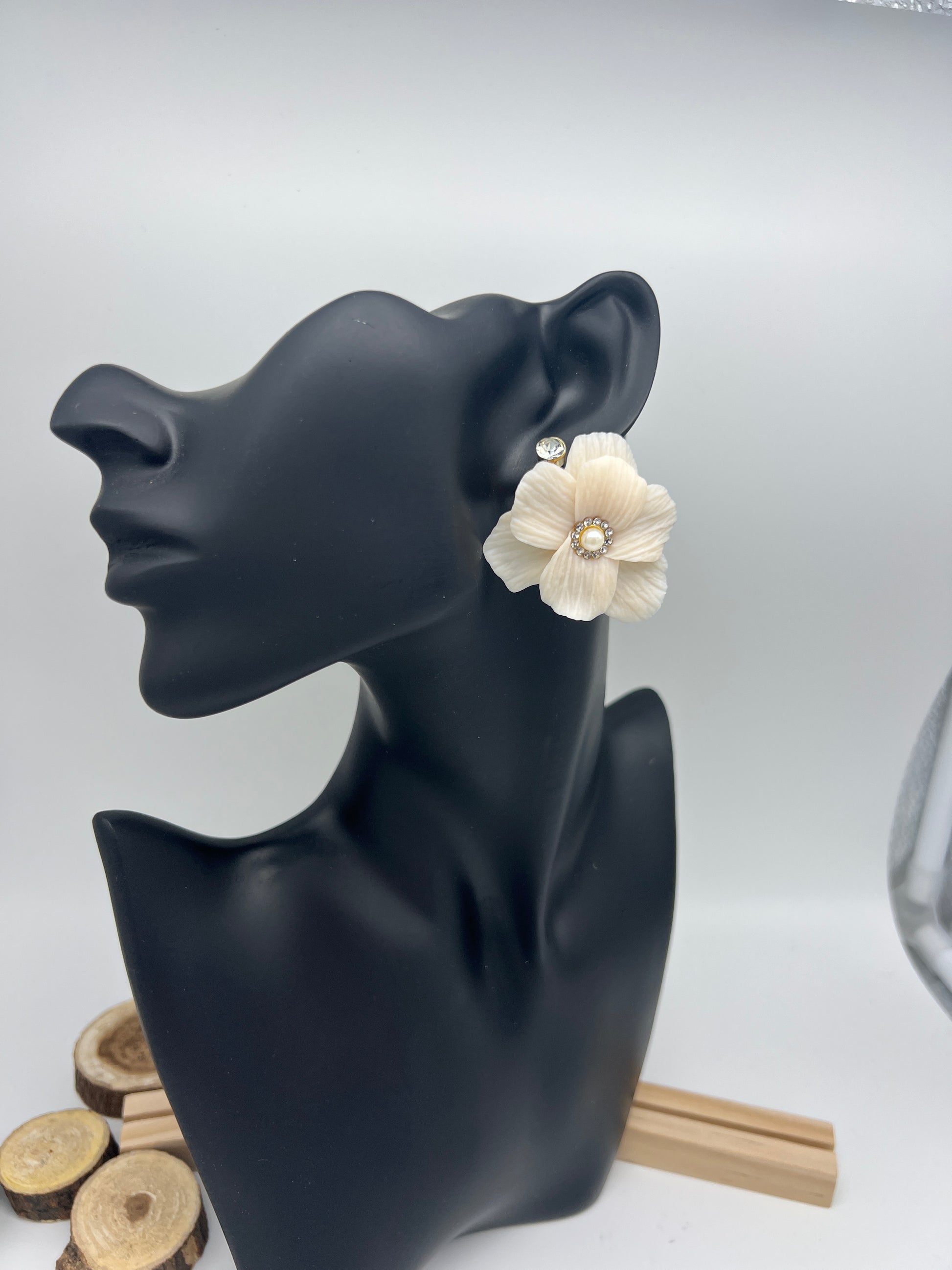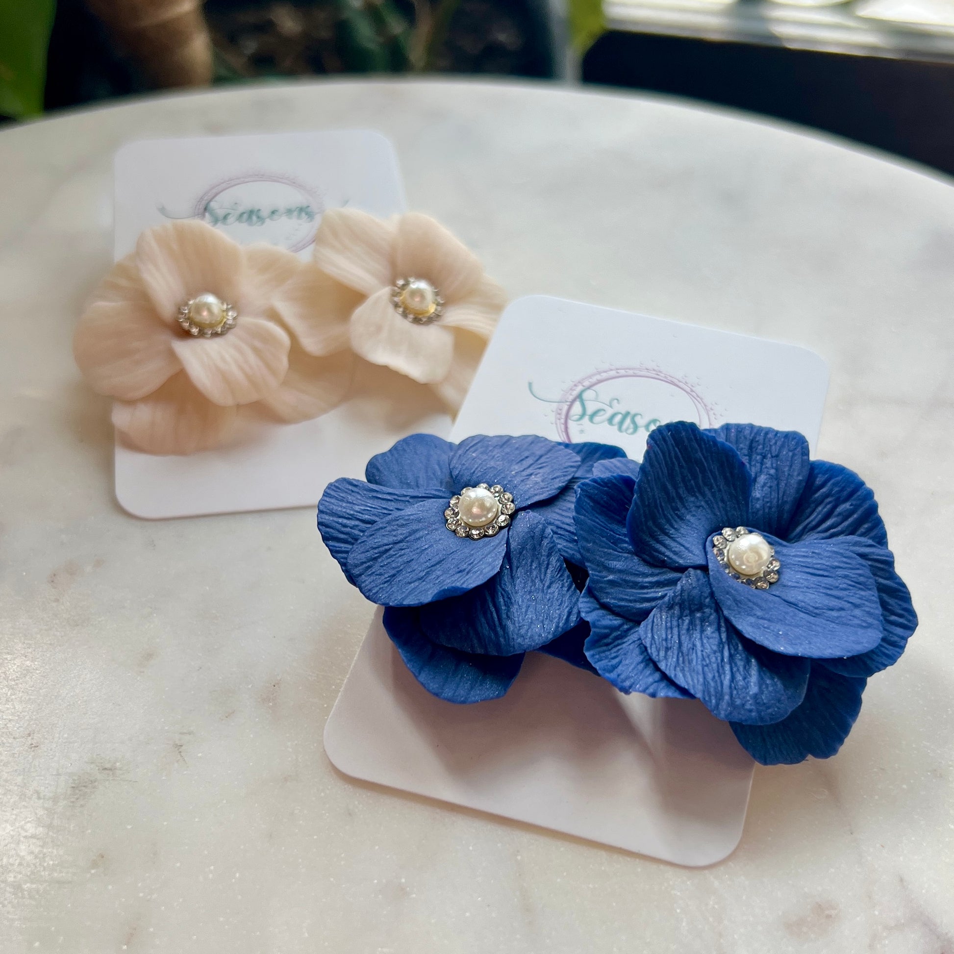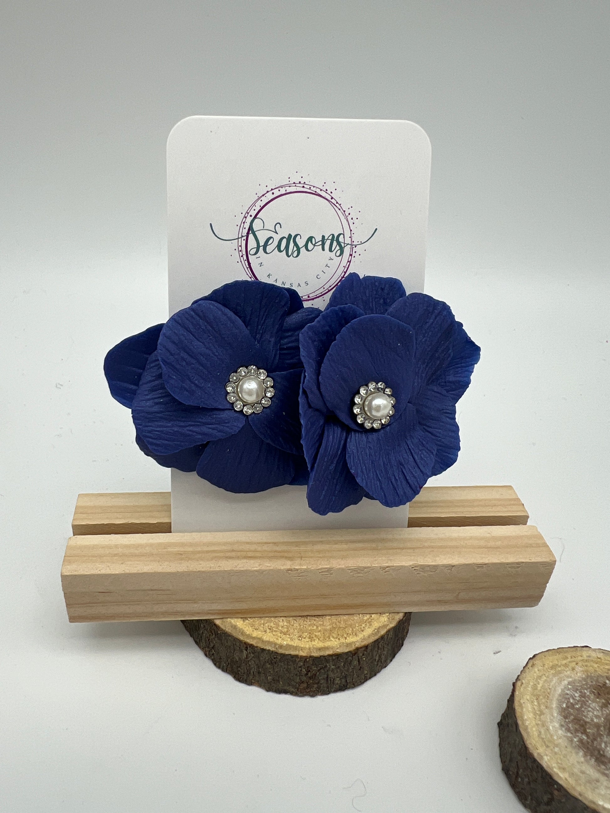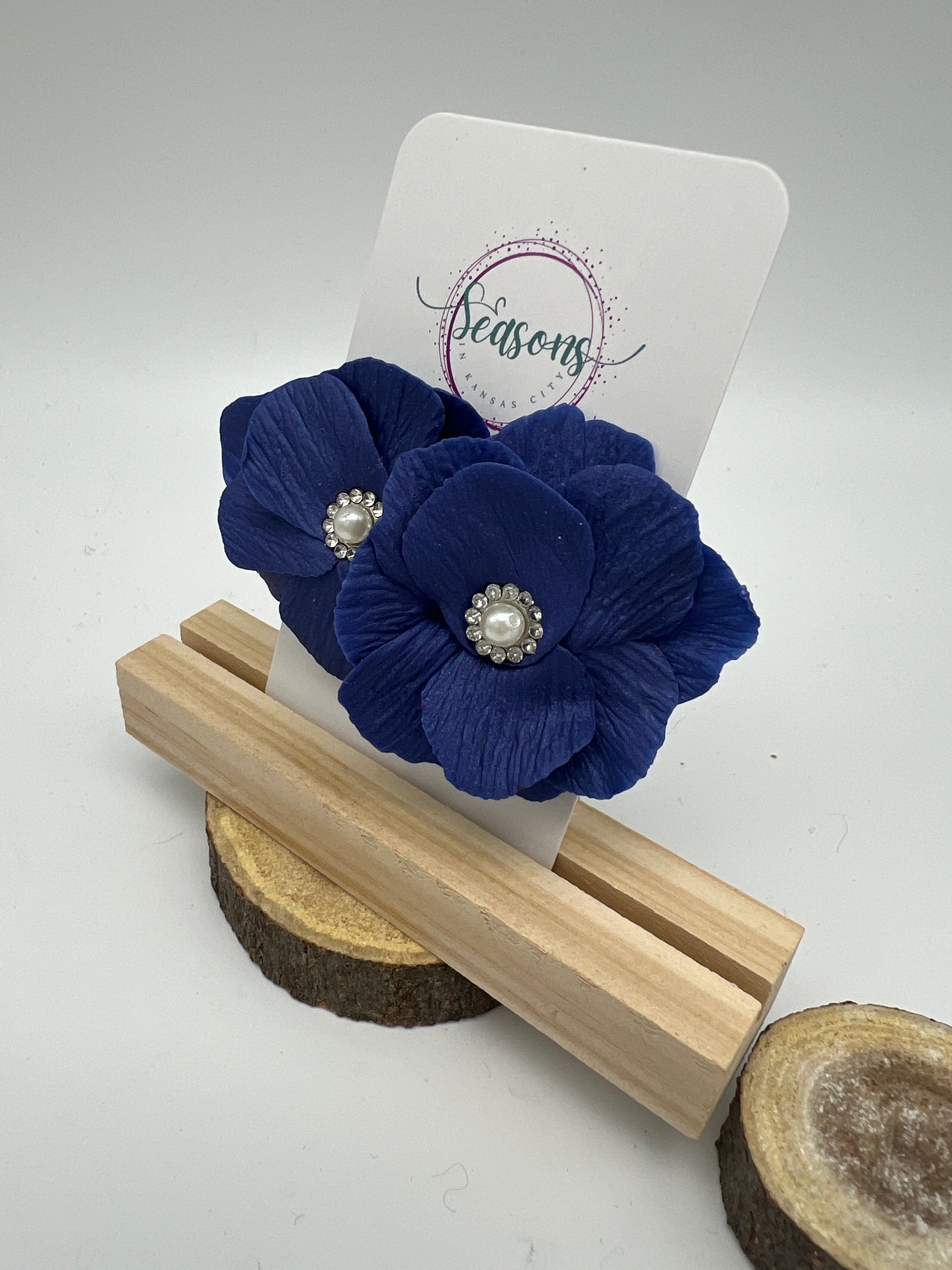 The Juliette custom color flower can be made in any color of your choosing and in iridescent or matte. It is finished with a pearl center surrounded by cubic zirconia with either silver or gold metal. It can be made as a large scale stud or dangle with cubic zirconia stud.