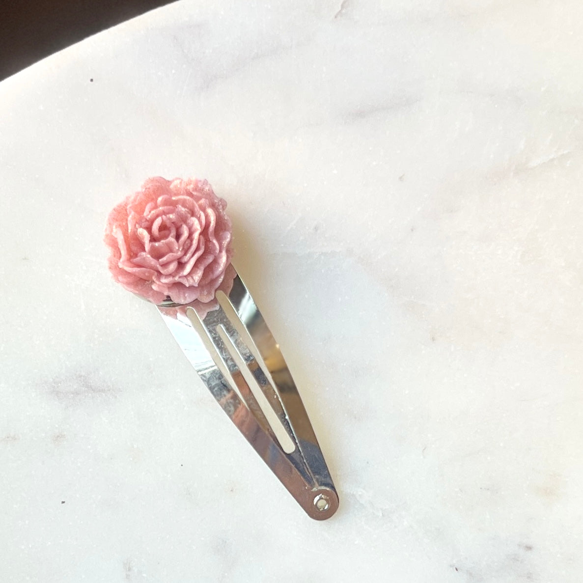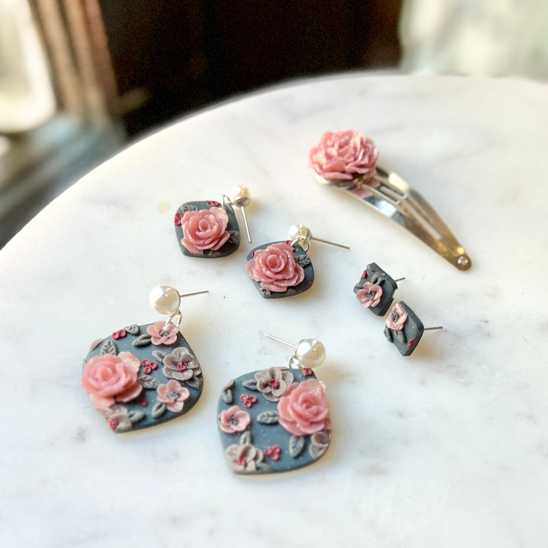 A shimmering dark blue grey background is topped with rose gold, grey, and burgundy flowers. Finished with a faux pearl stud and stainless steel hardware.