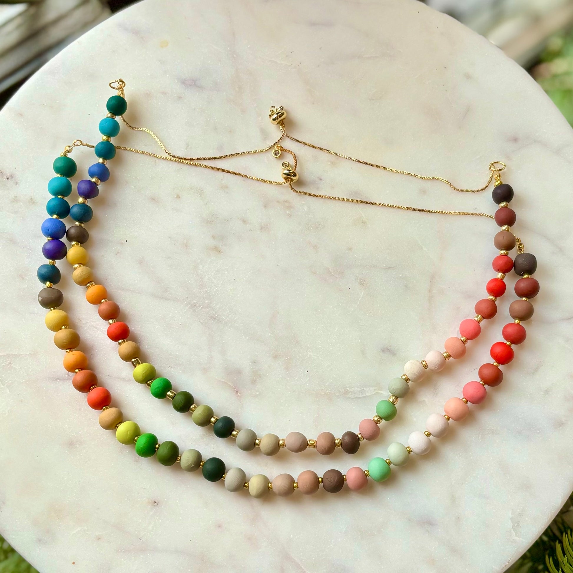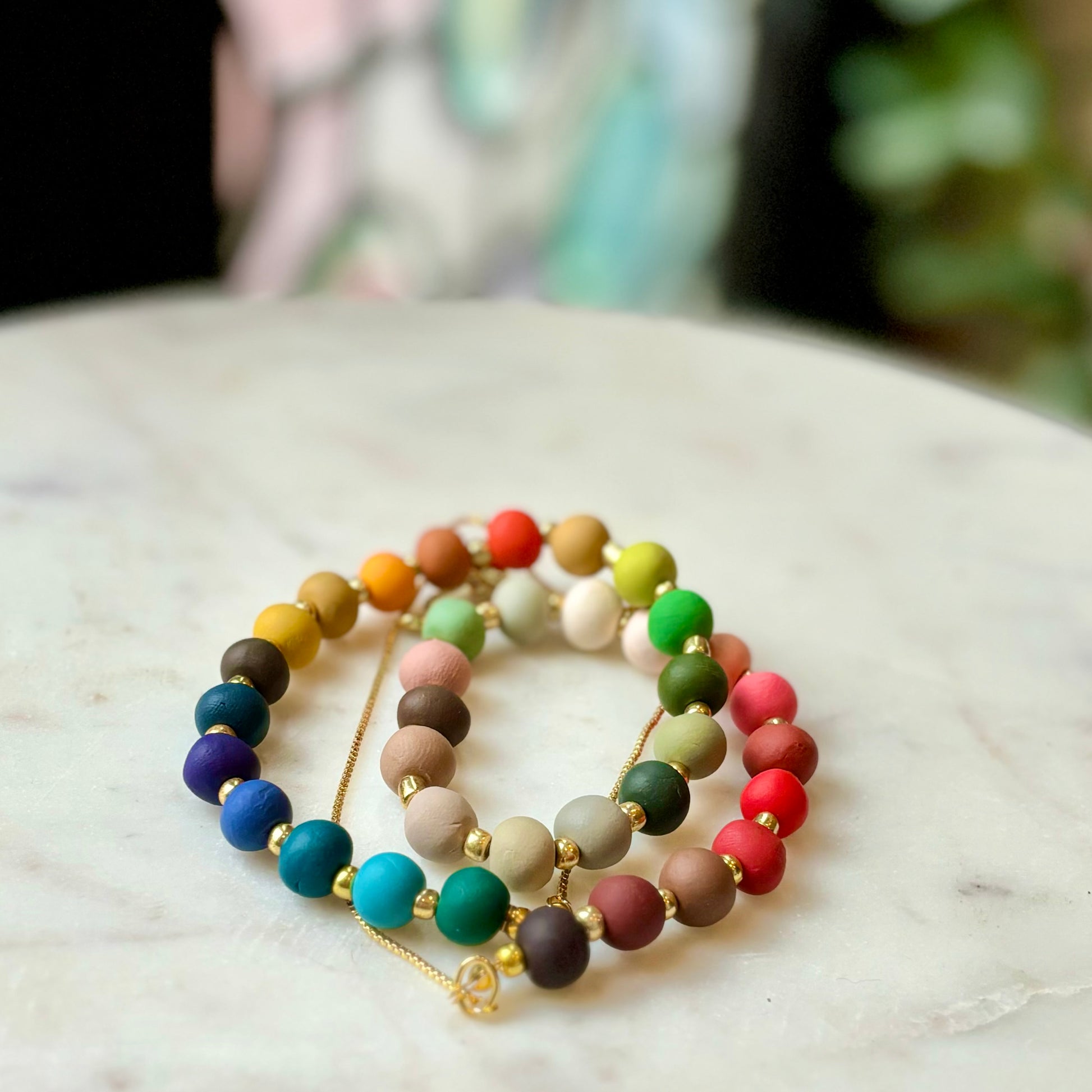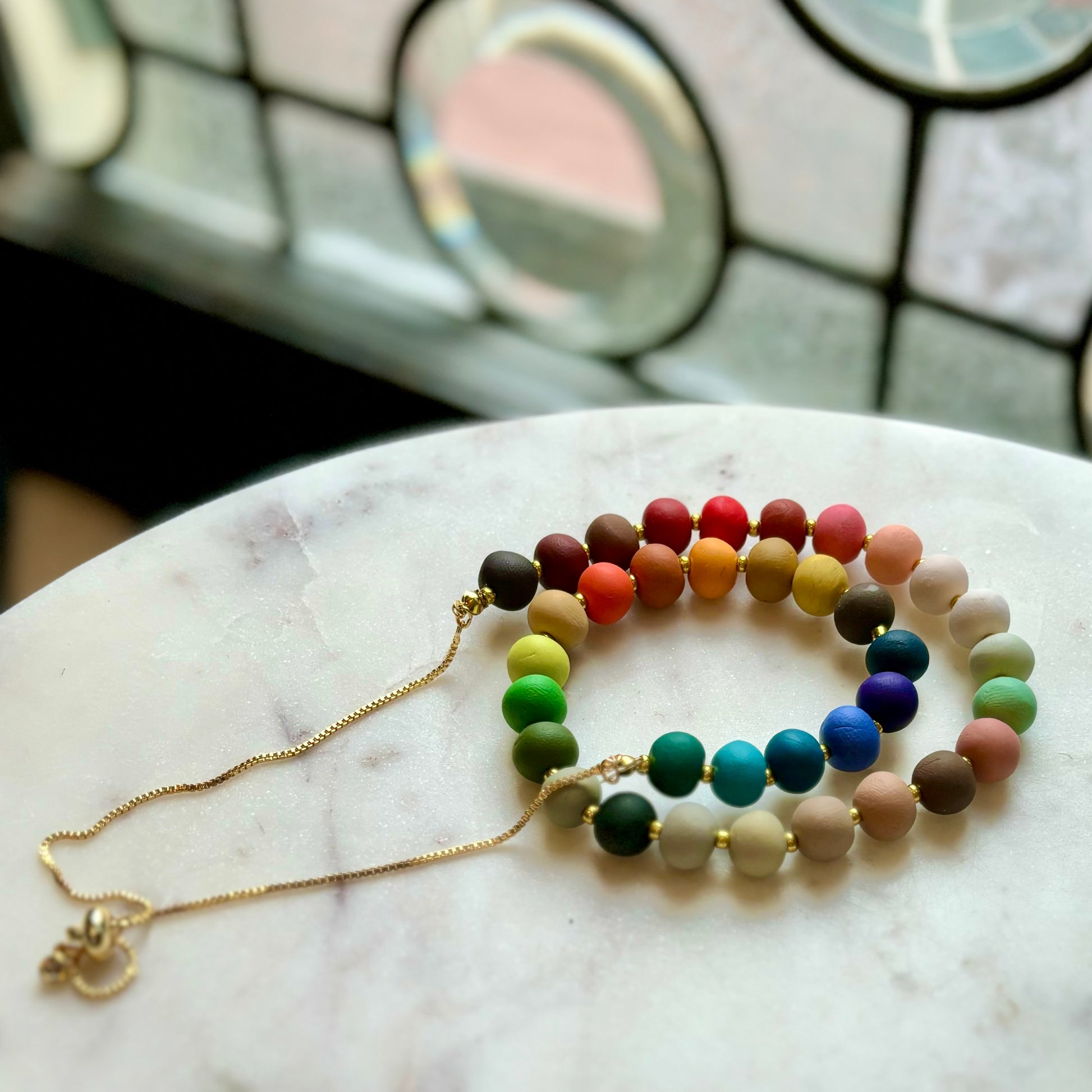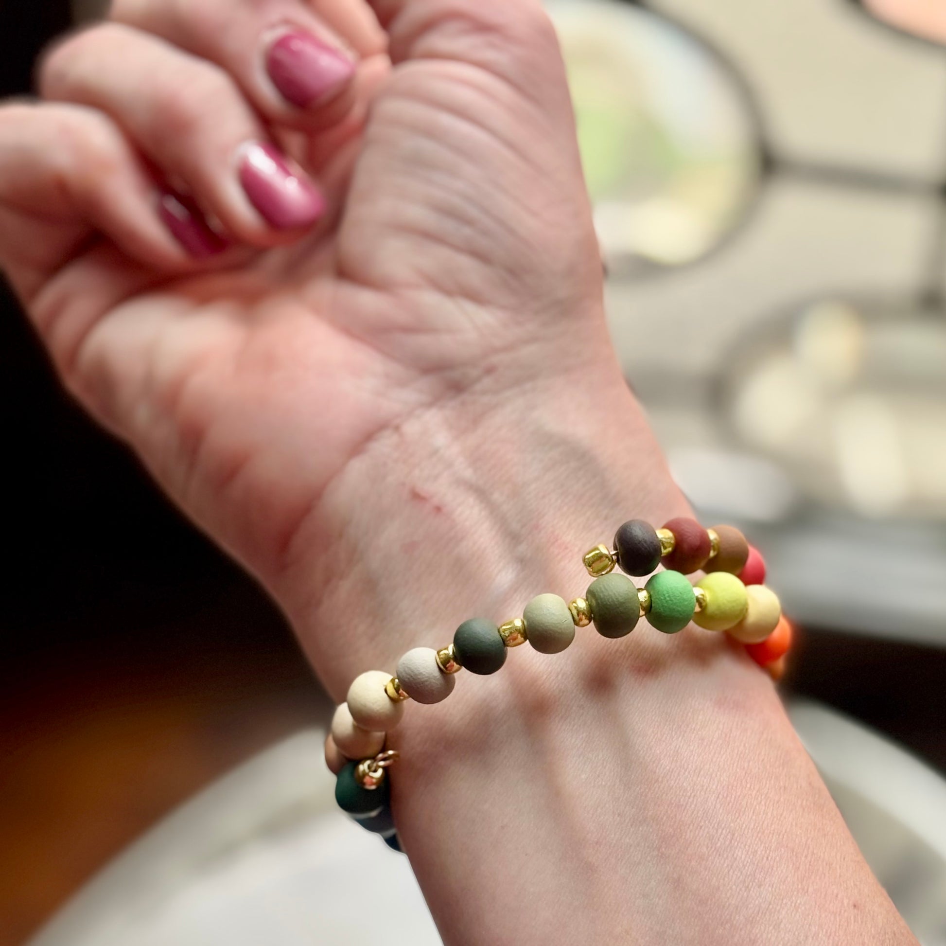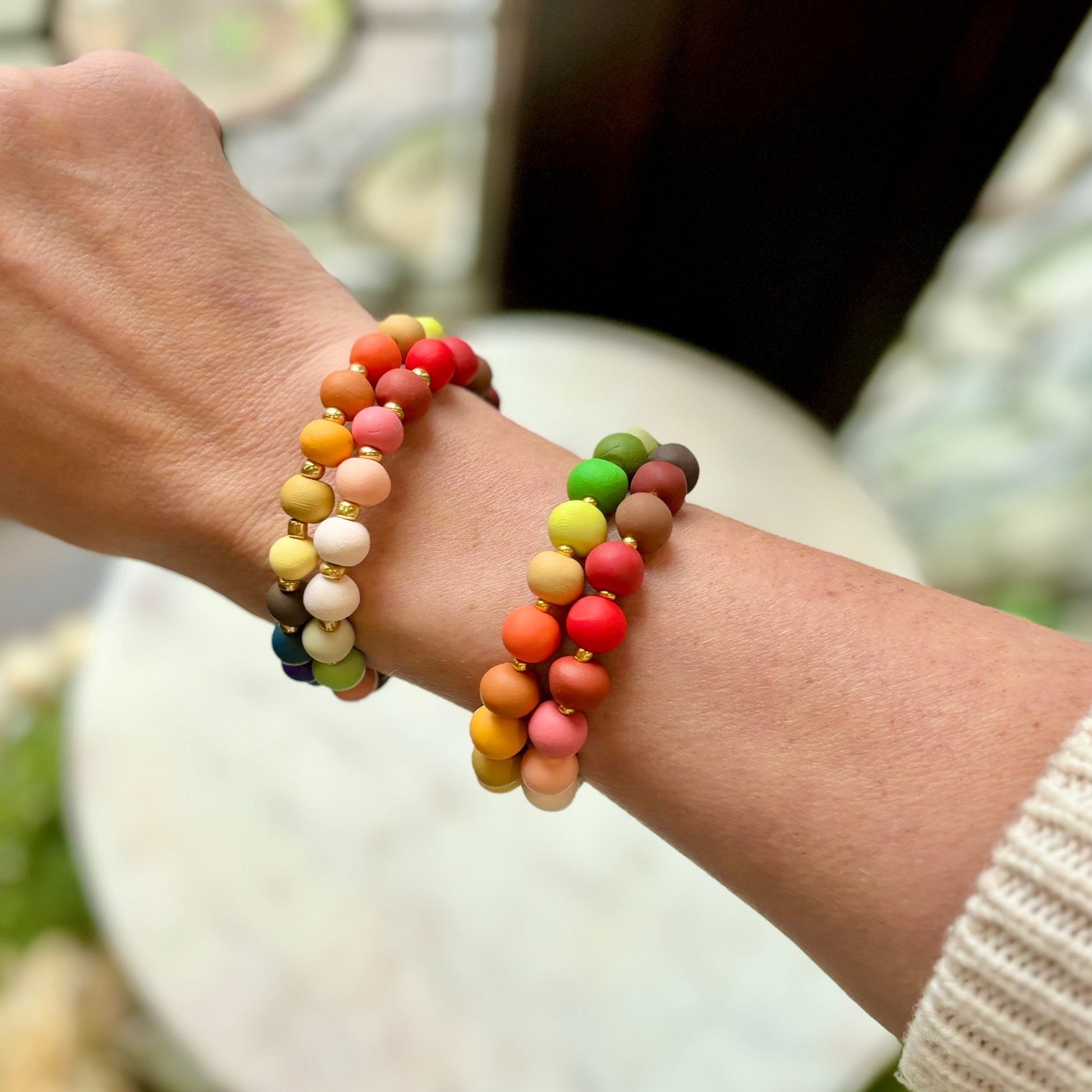 Palette Wearable bracelets include a bead in a custom matched color to each of the 36 House of Colour colors from the autumn palette. Each bead is hand rolled and finished after being color matched. They are placed on a bracelet with gold spacers.