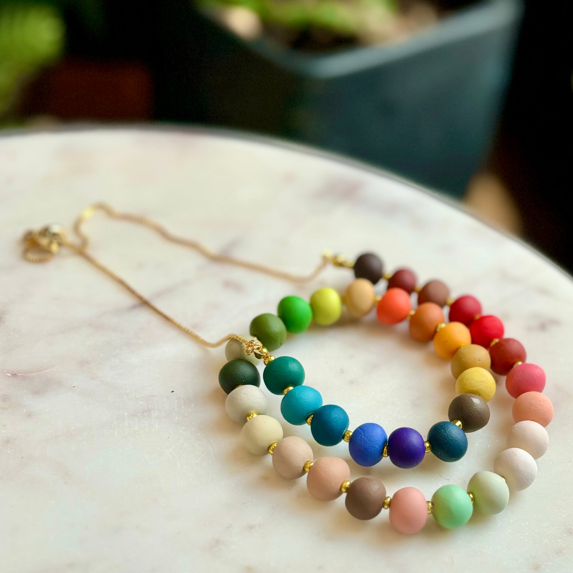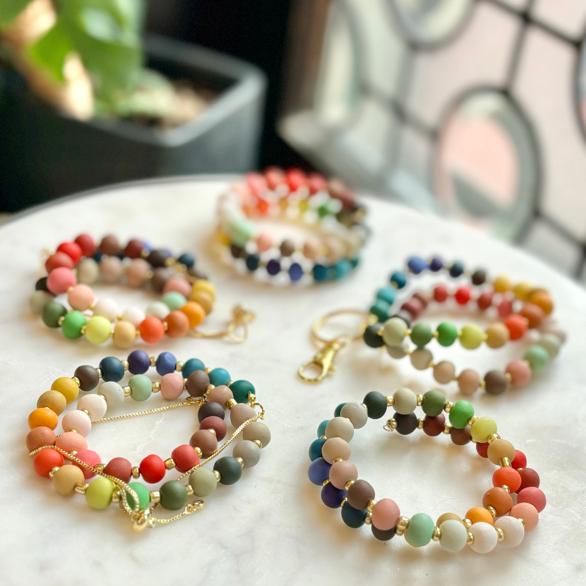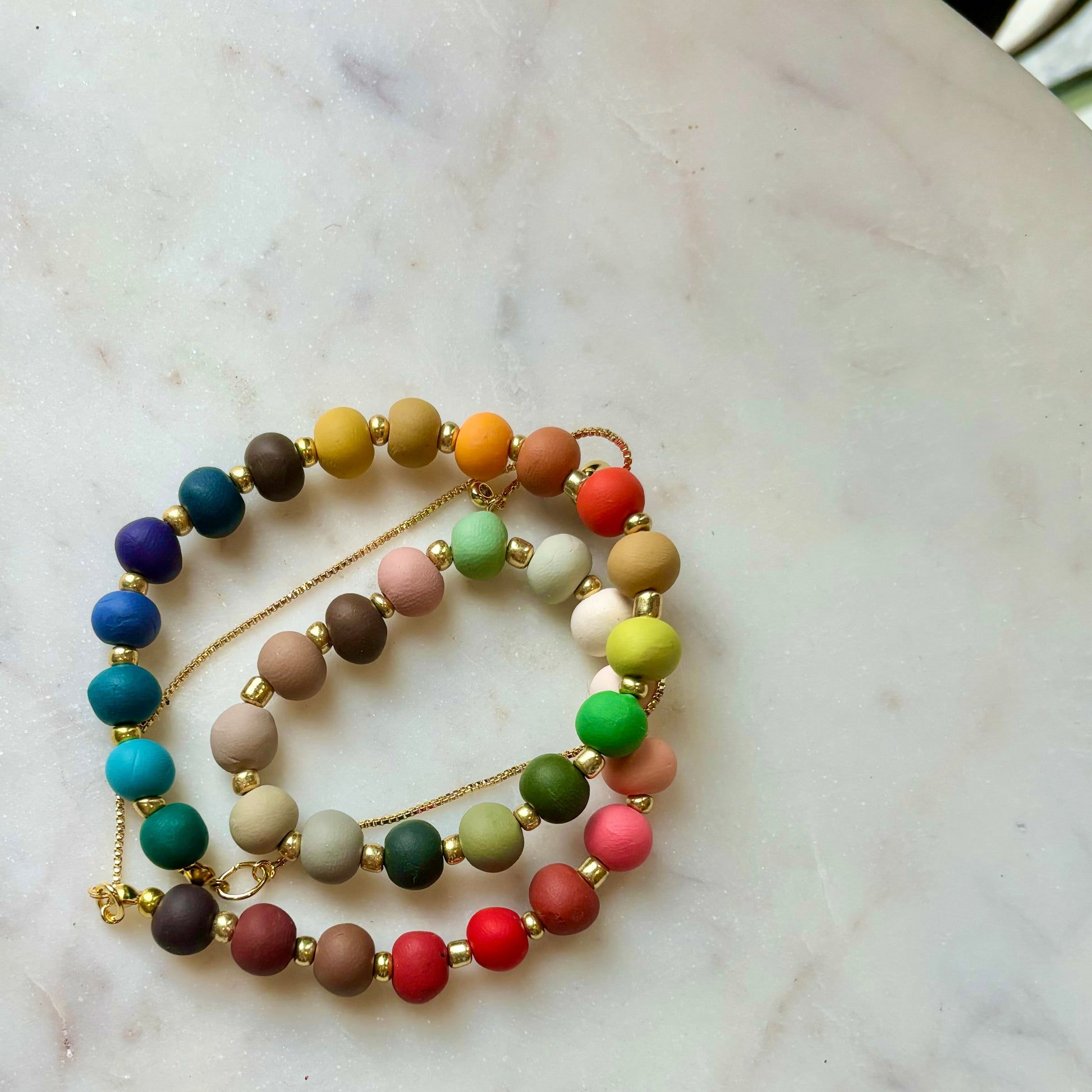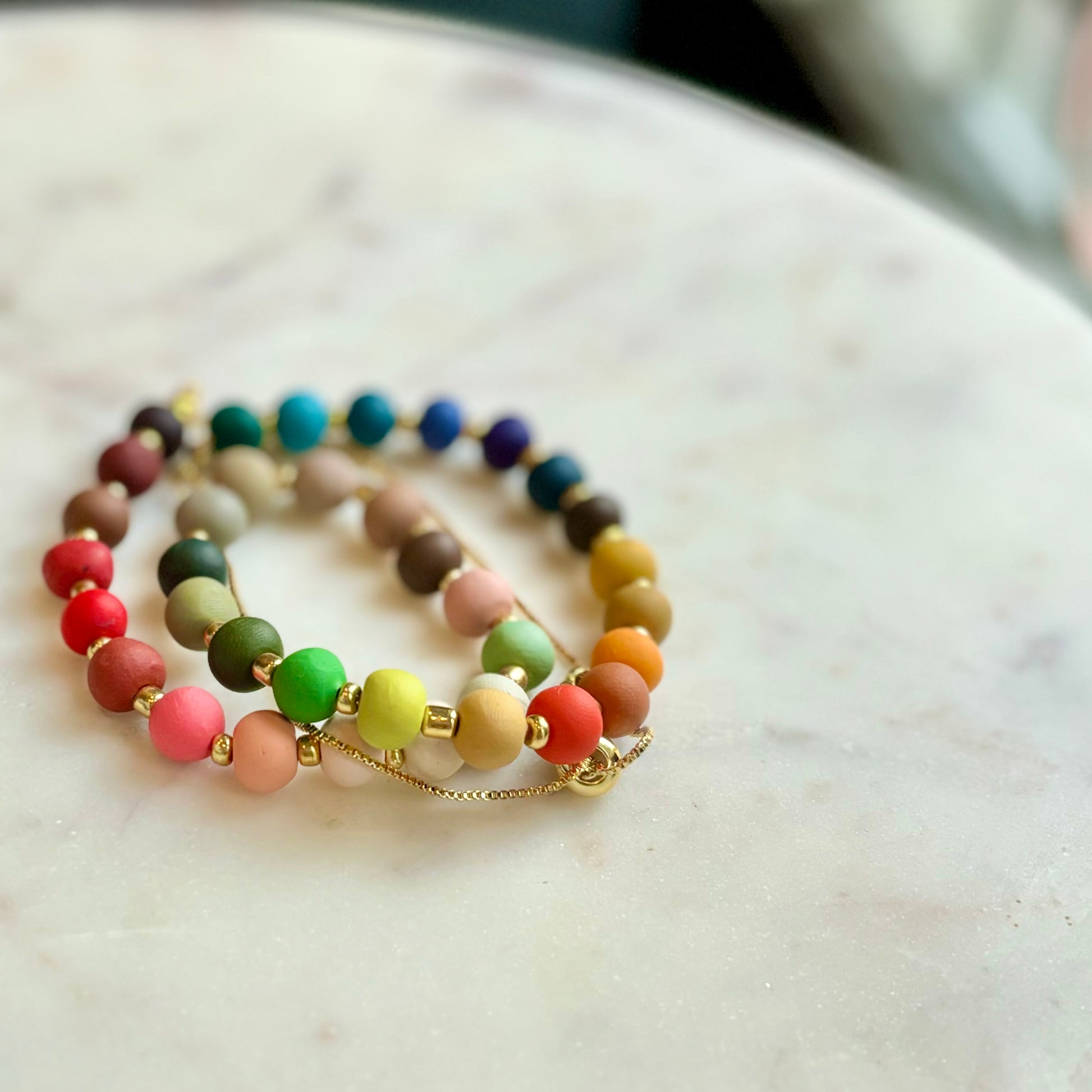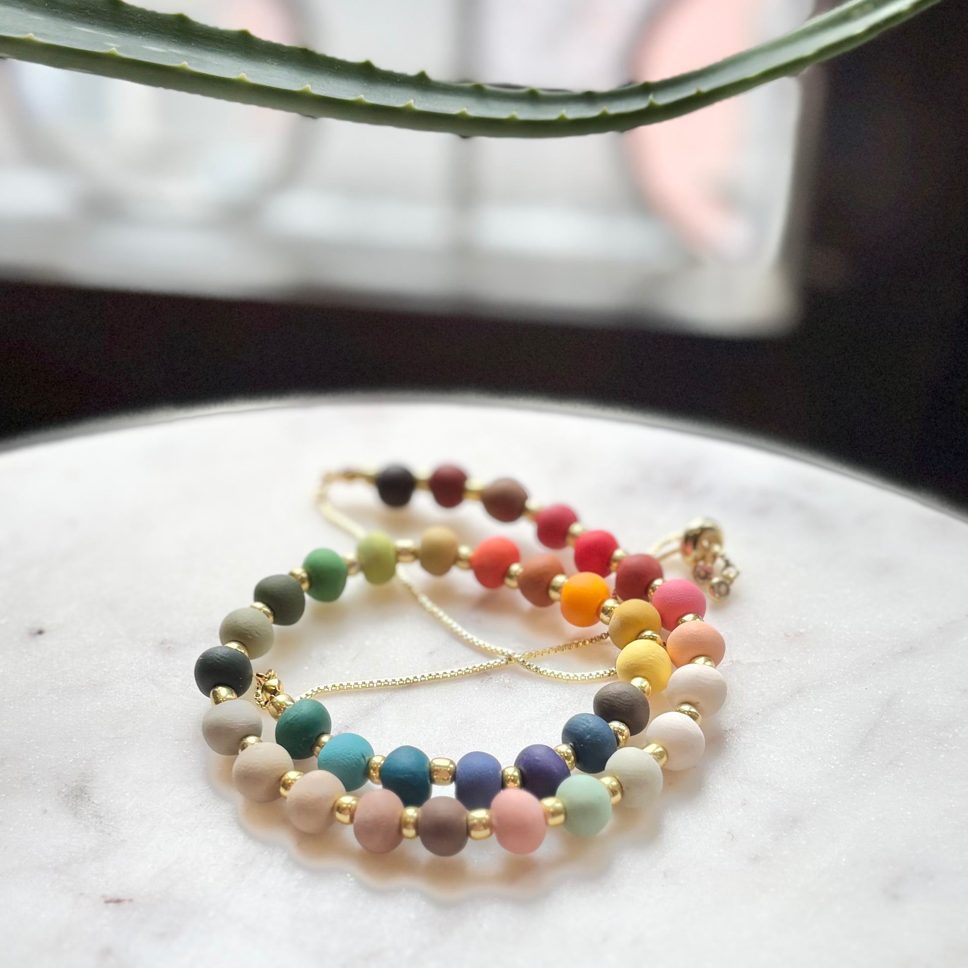 Palette Wearable bracelets include a bead in a custom matched color to each of the 36 House of Colour colors from the autumn palette. Each bead is hand rolled and finished after being color matched. They are placed on a bracelet with gold spacers.