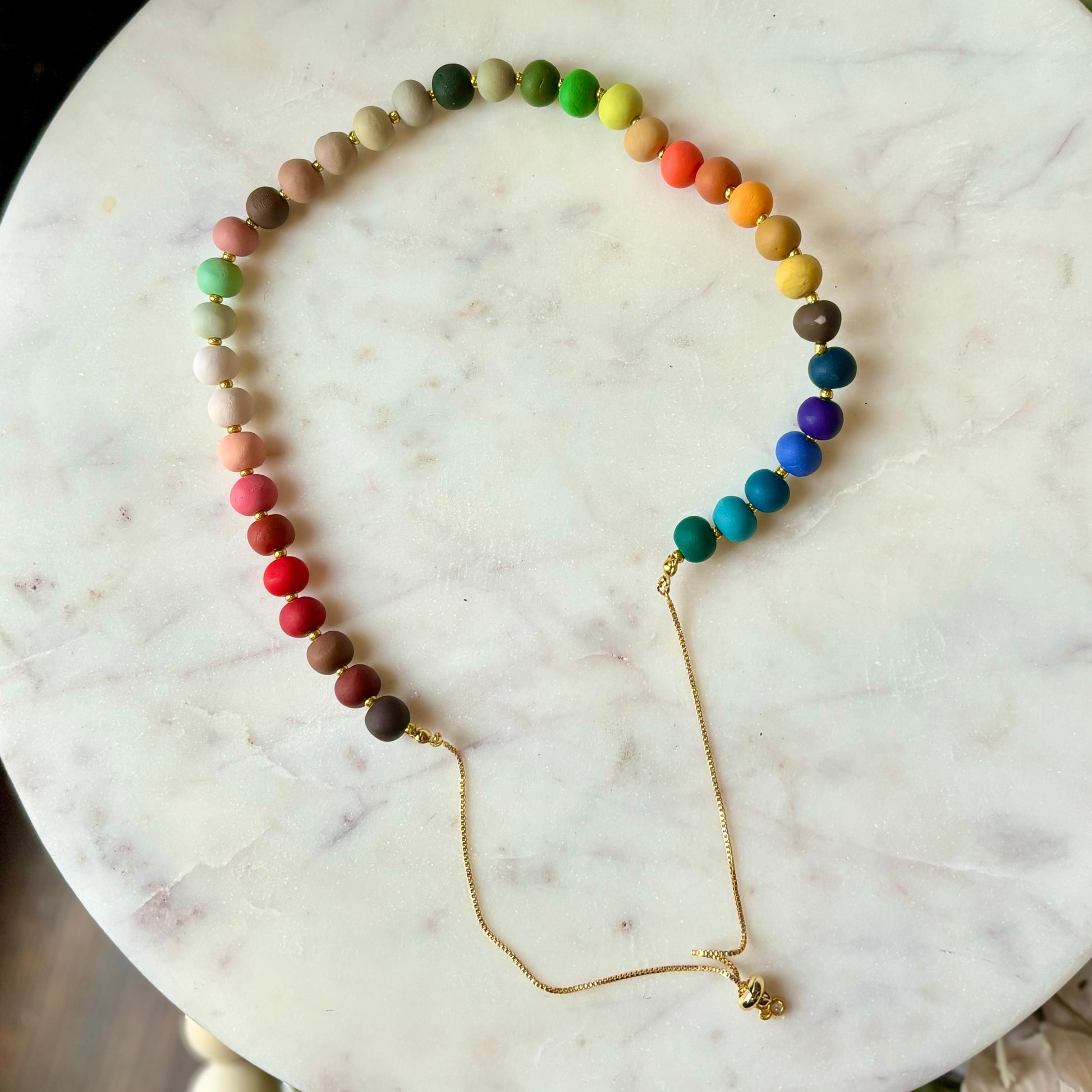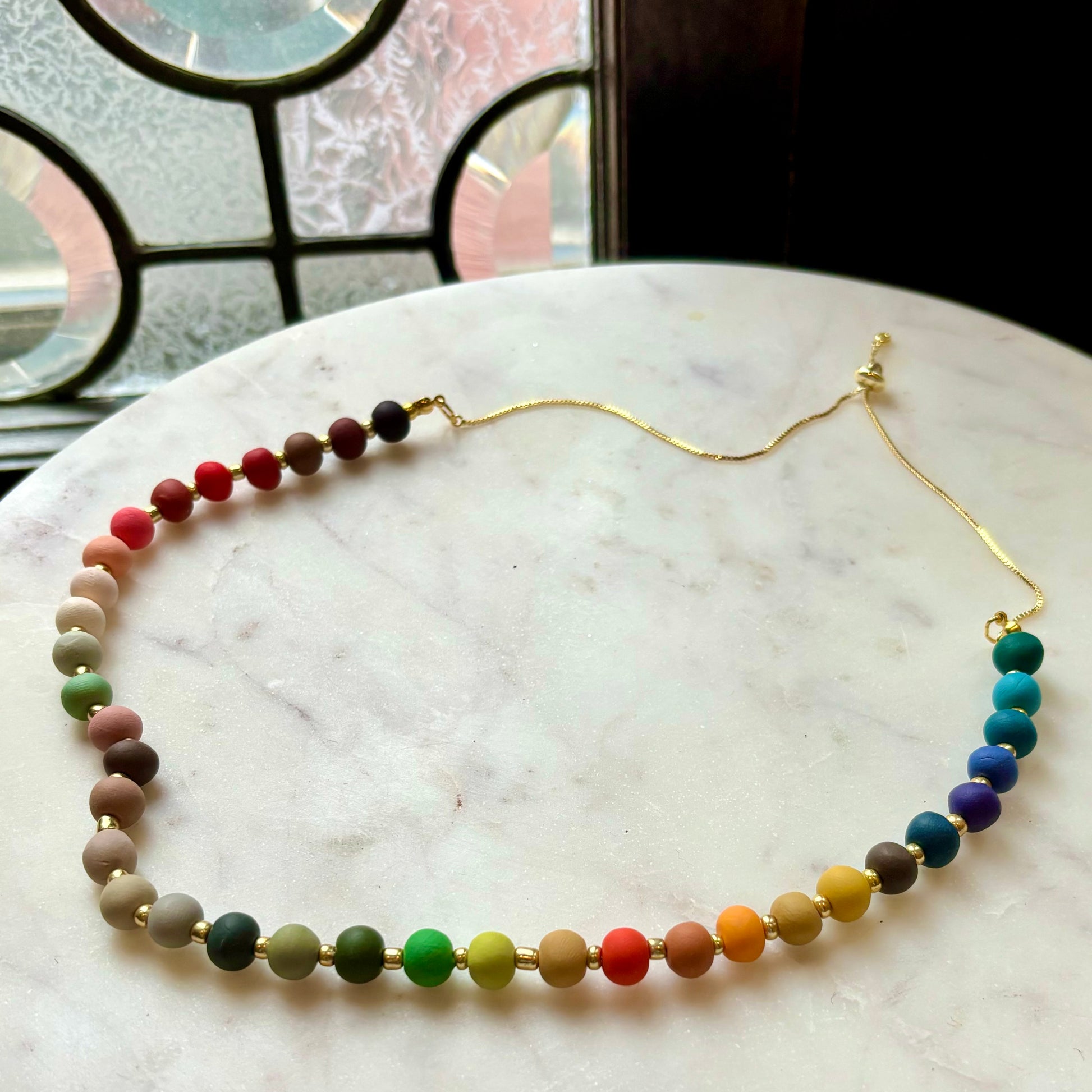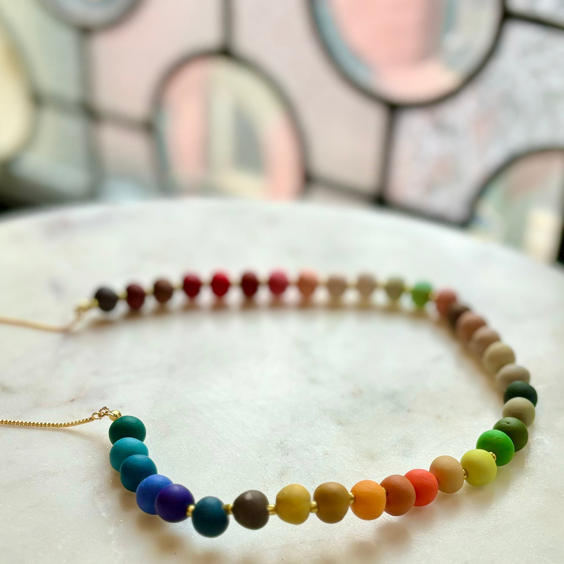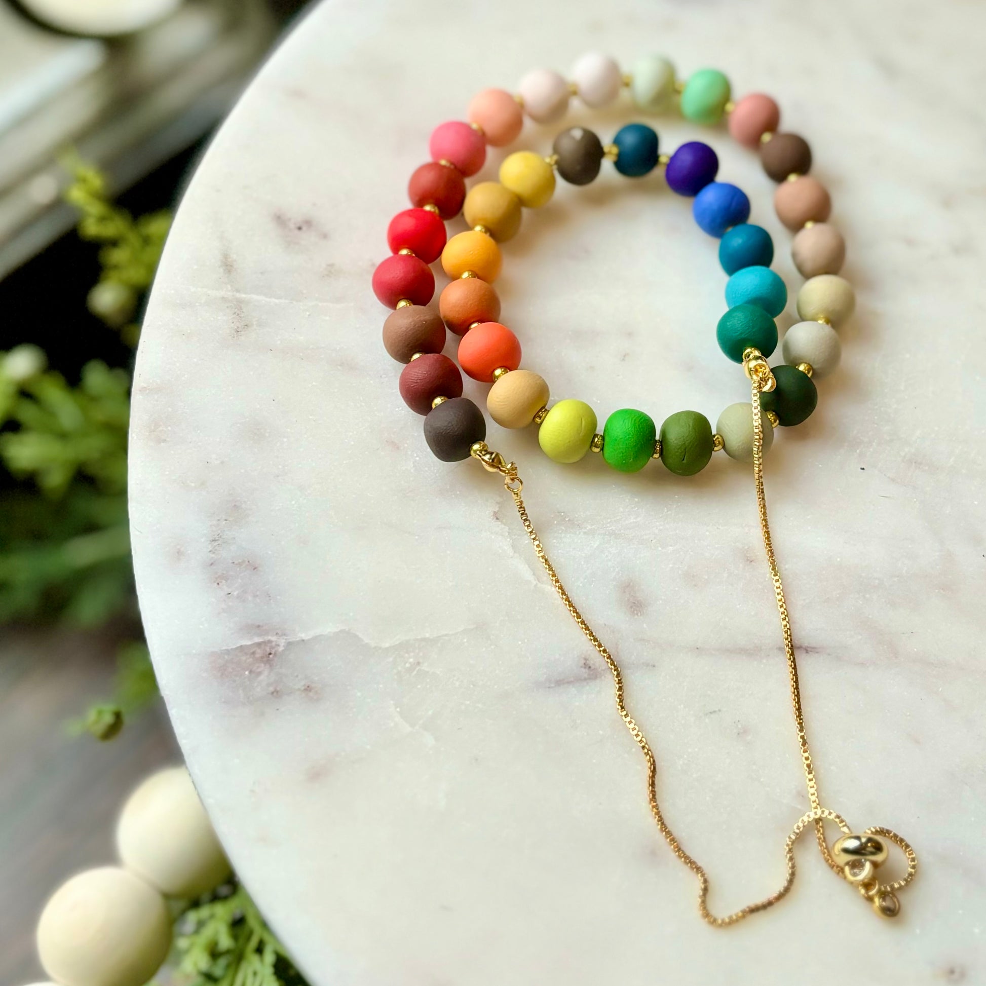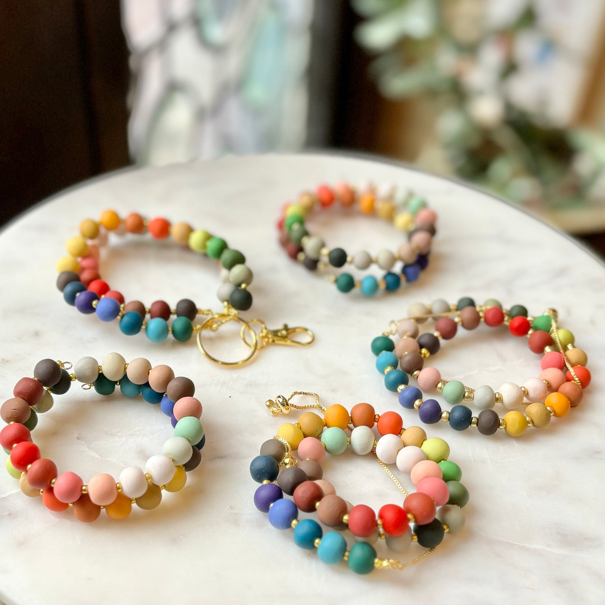 Palette Wearable bracelets include a bead in a custom matched color to each of the 36 House of Colour colors from the autumn palette. Each bead is hand rolled and finished after being color matched. They are placed on a bracelet with gold spacers.