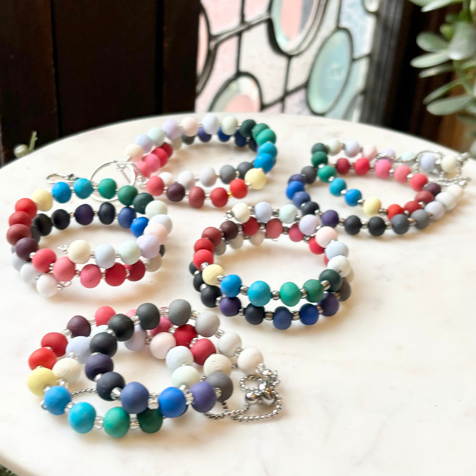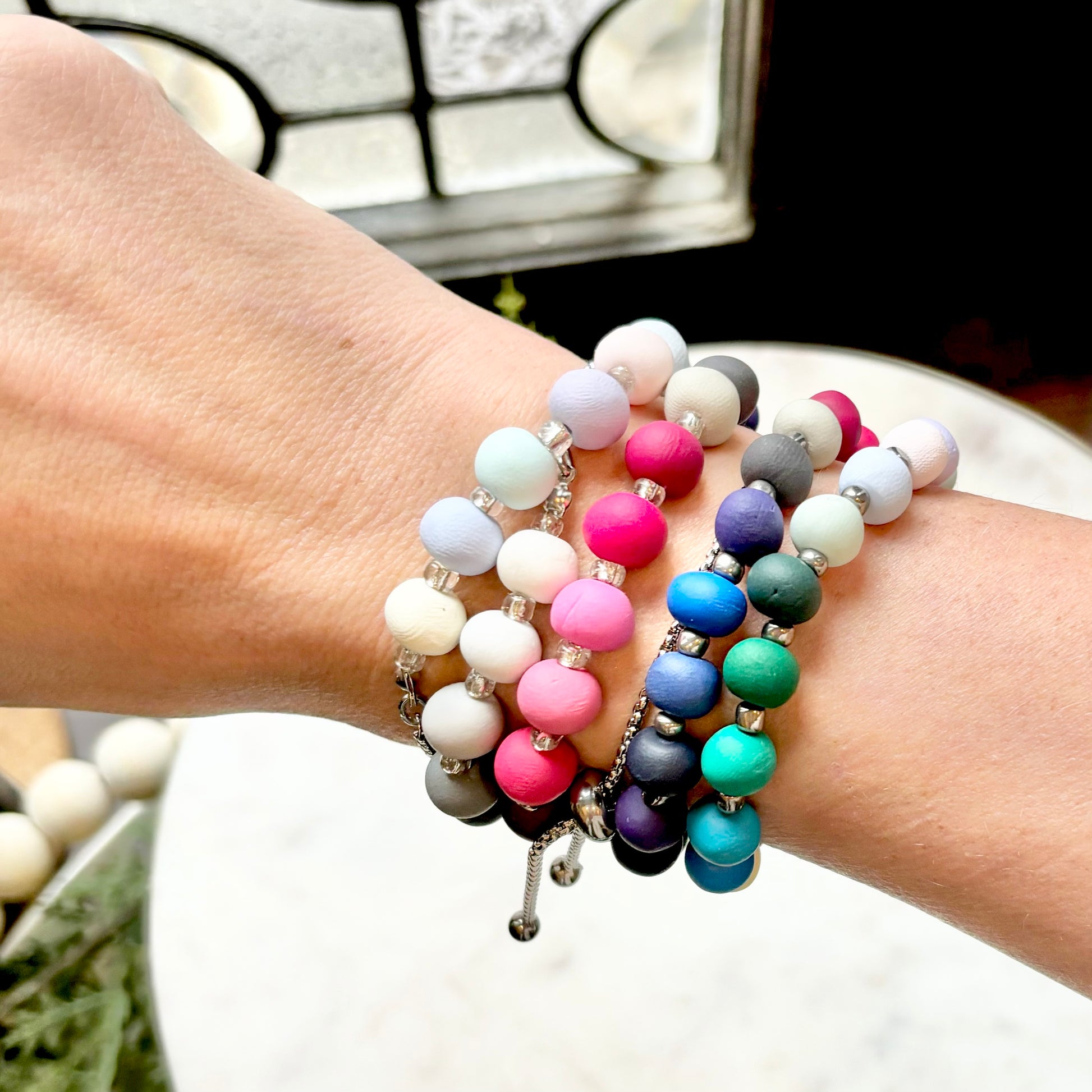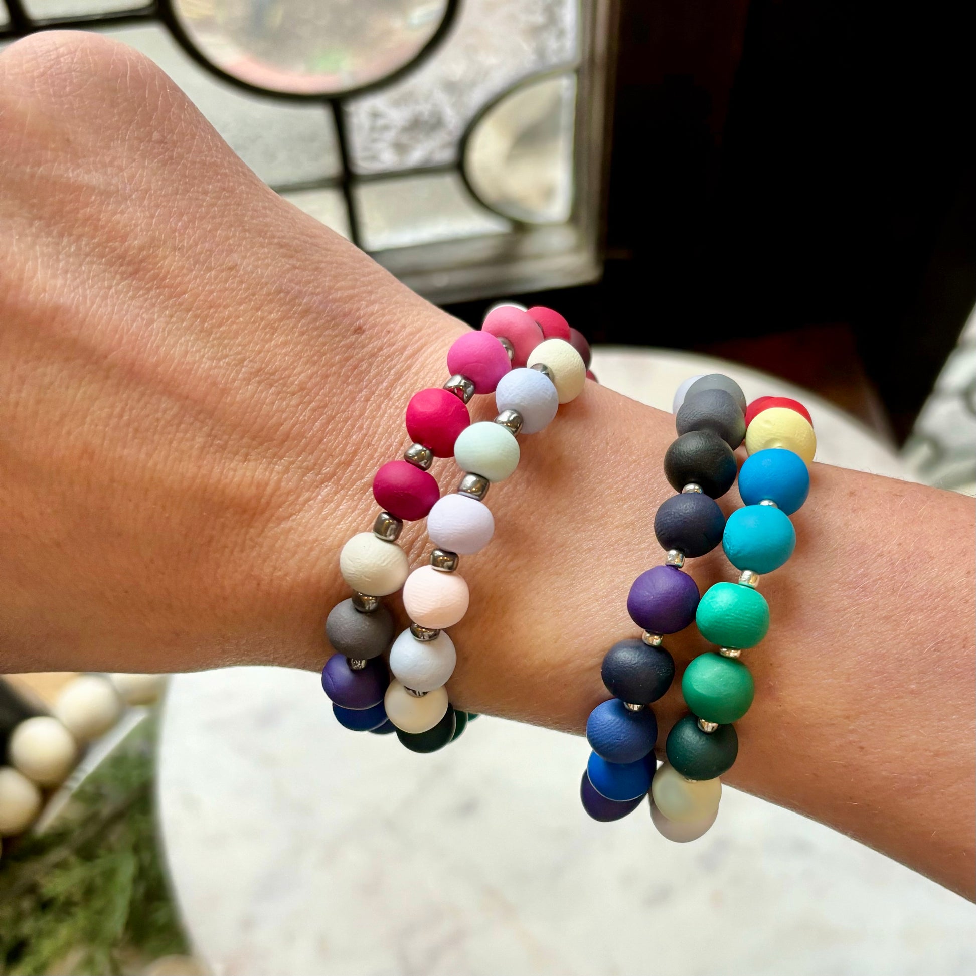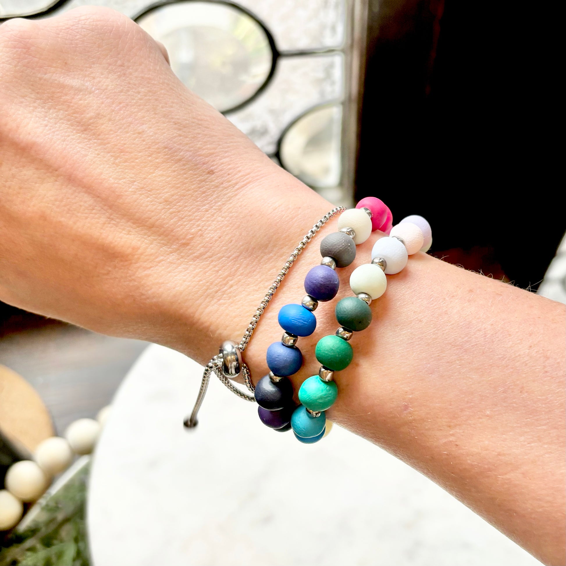 Palette Wearable bracelets include a bead in a custom matched color to the House of Colour colors from the winter palette. Each bead is hand rolled and finished after being color matched. They are placed on a bracelet with silver spacers.