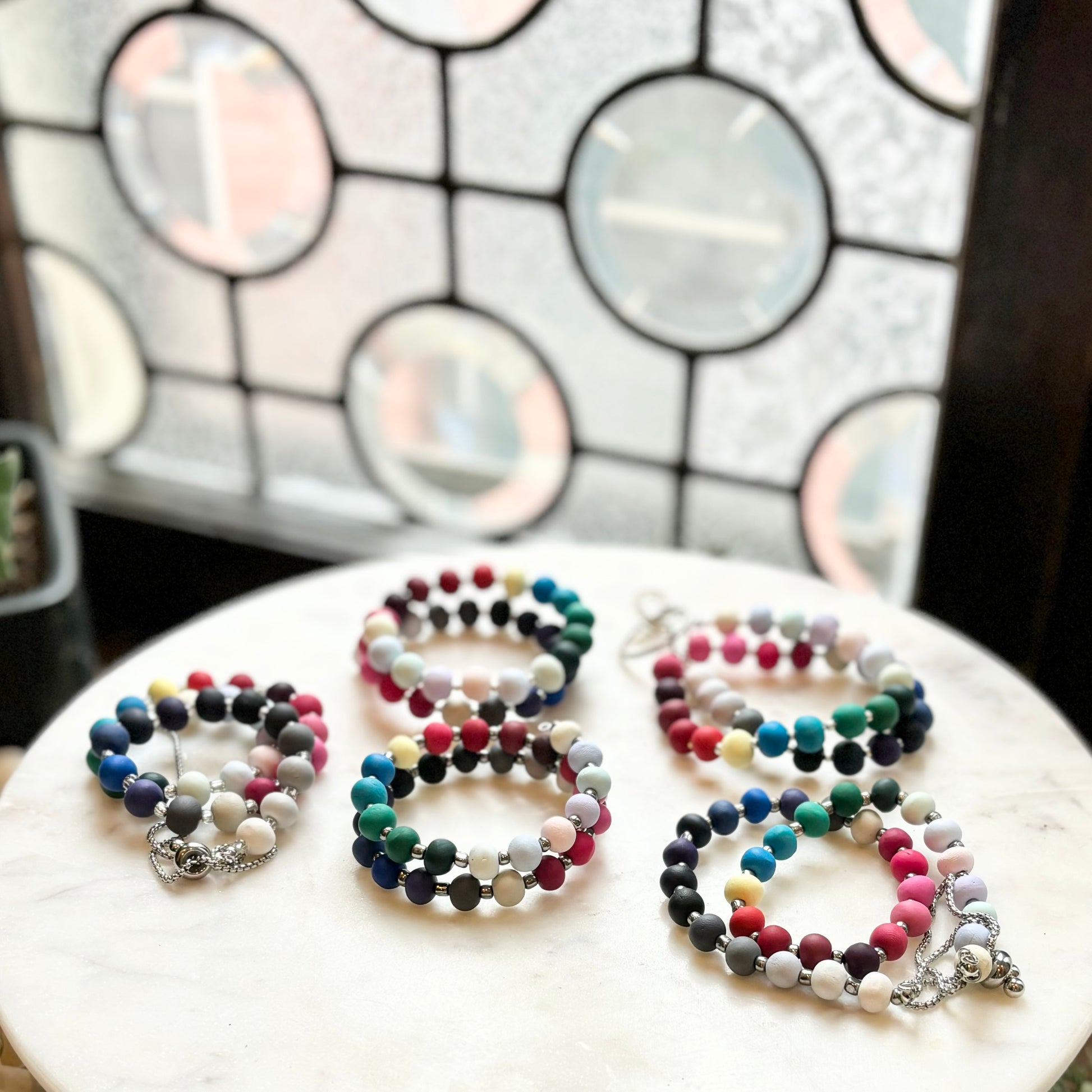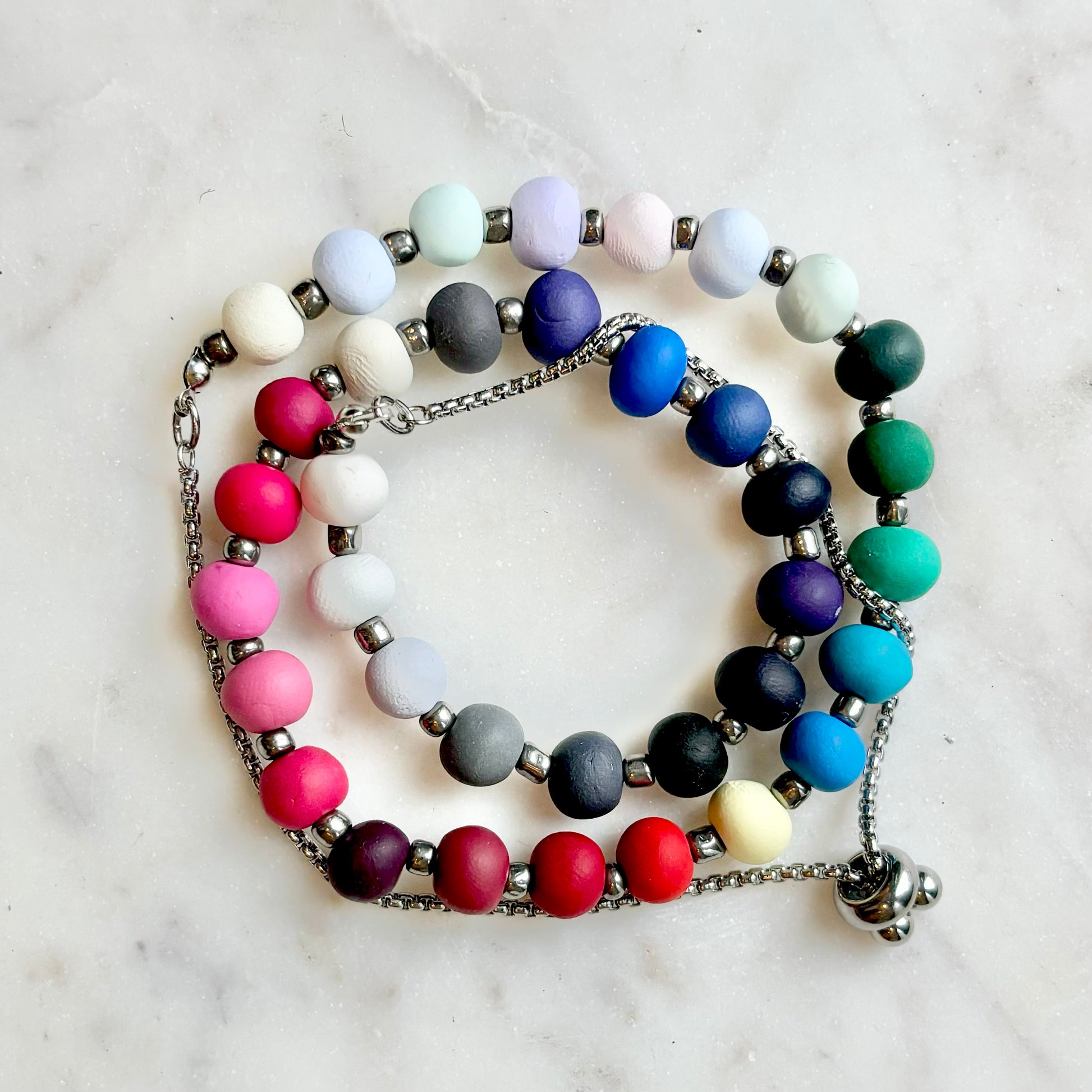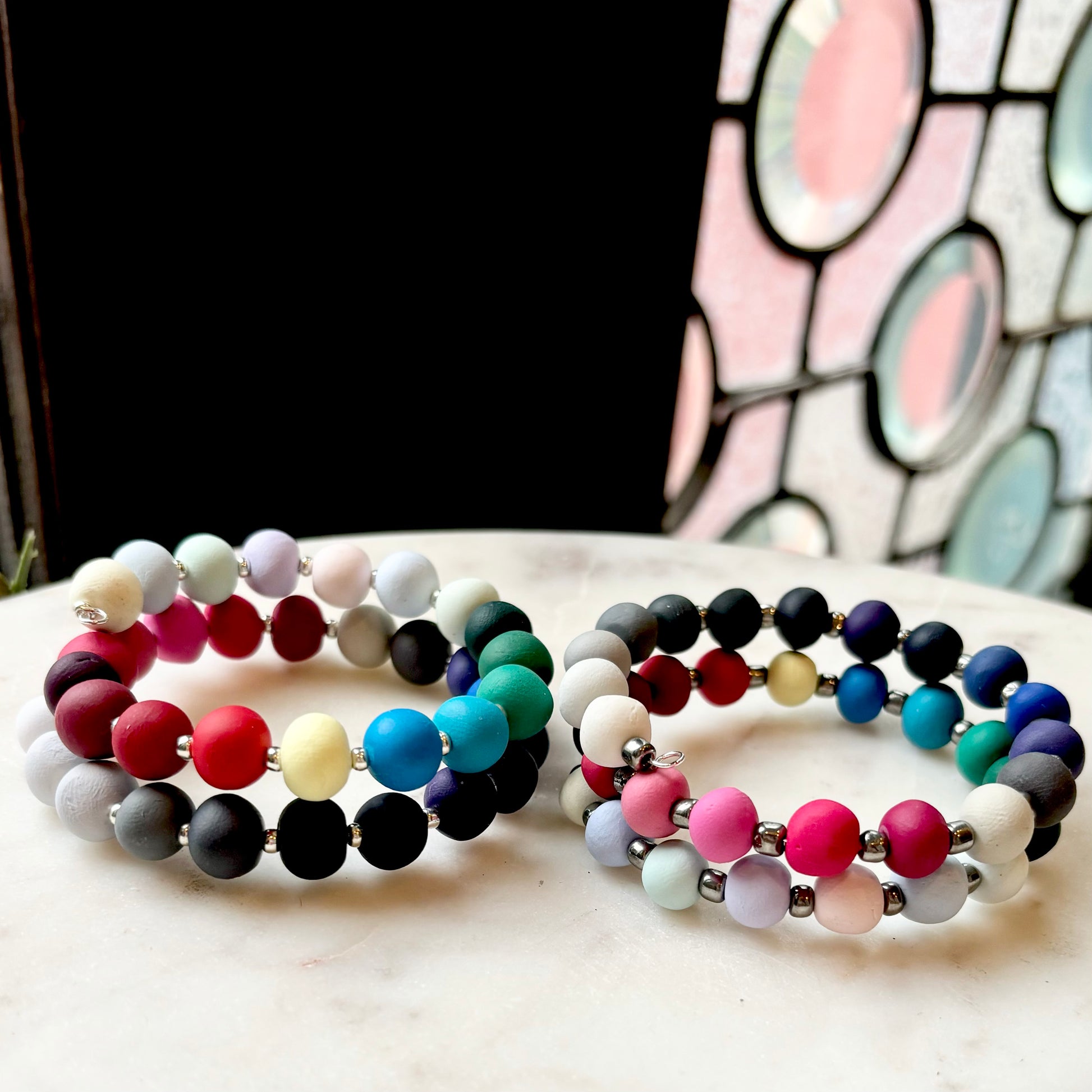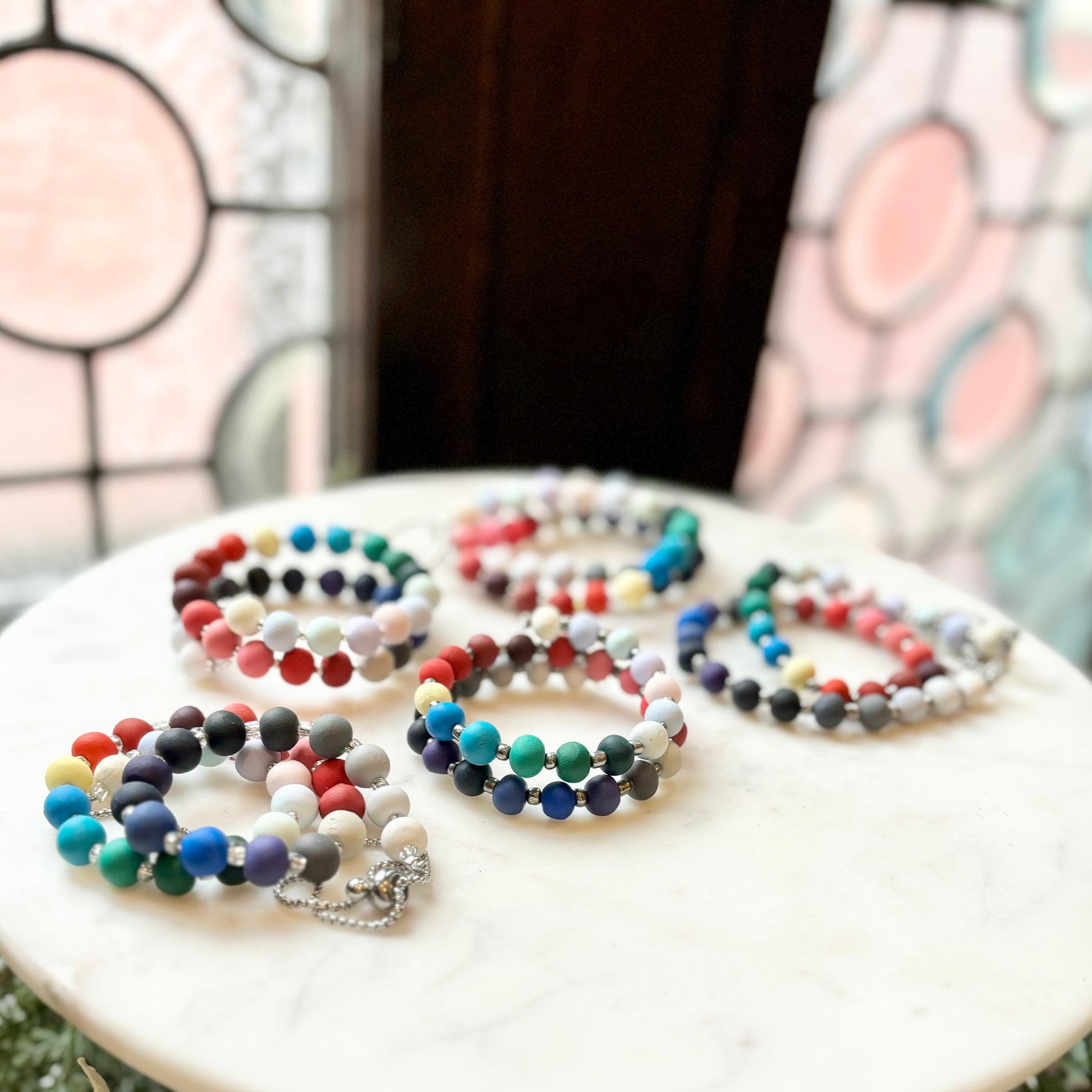 Palette Wearable bracelets include a bead in a custom matched color to the House of Colour colors from the winter palette. Each bead is hand rolled and finished after being color matched. They are placed on a bracelet with silver spacers.