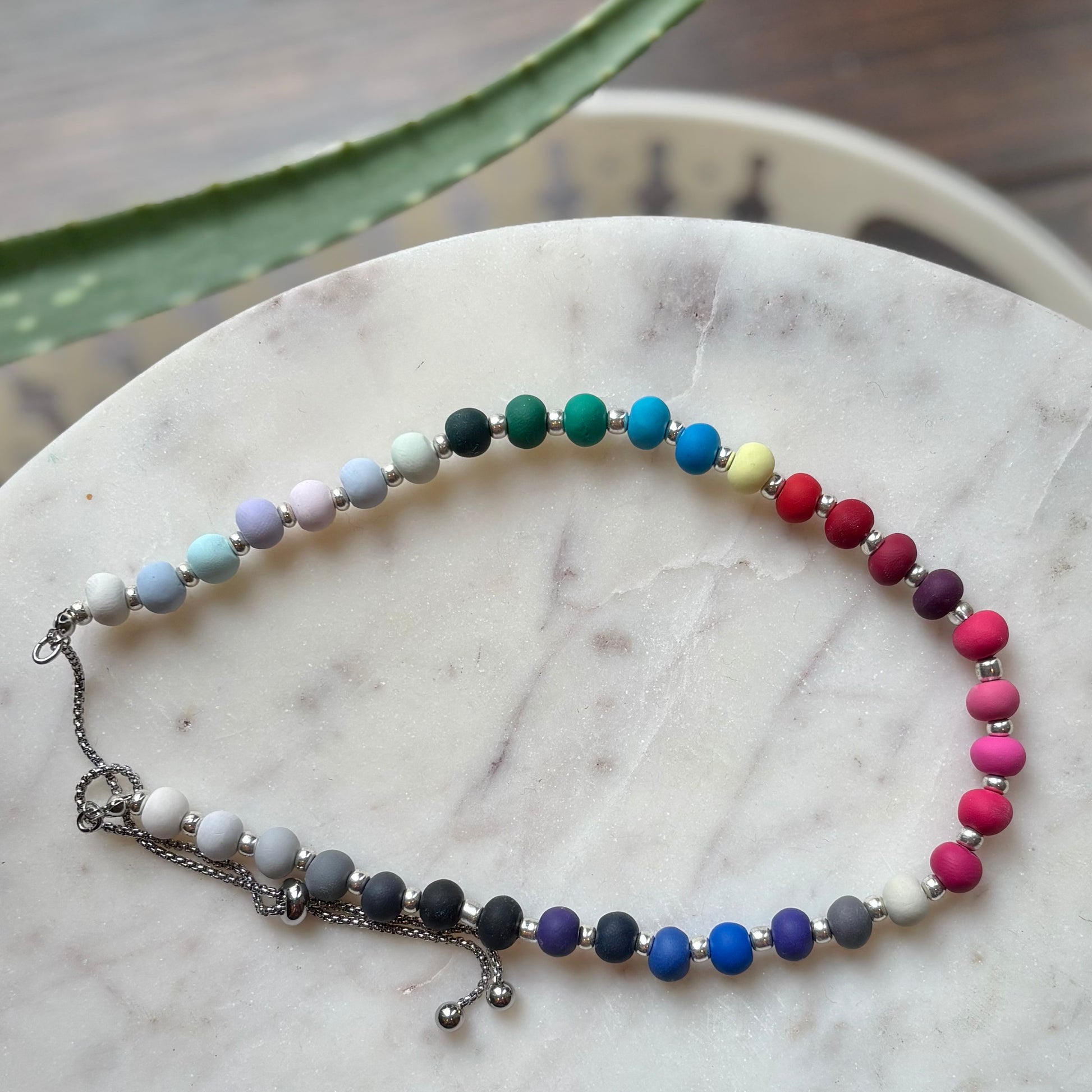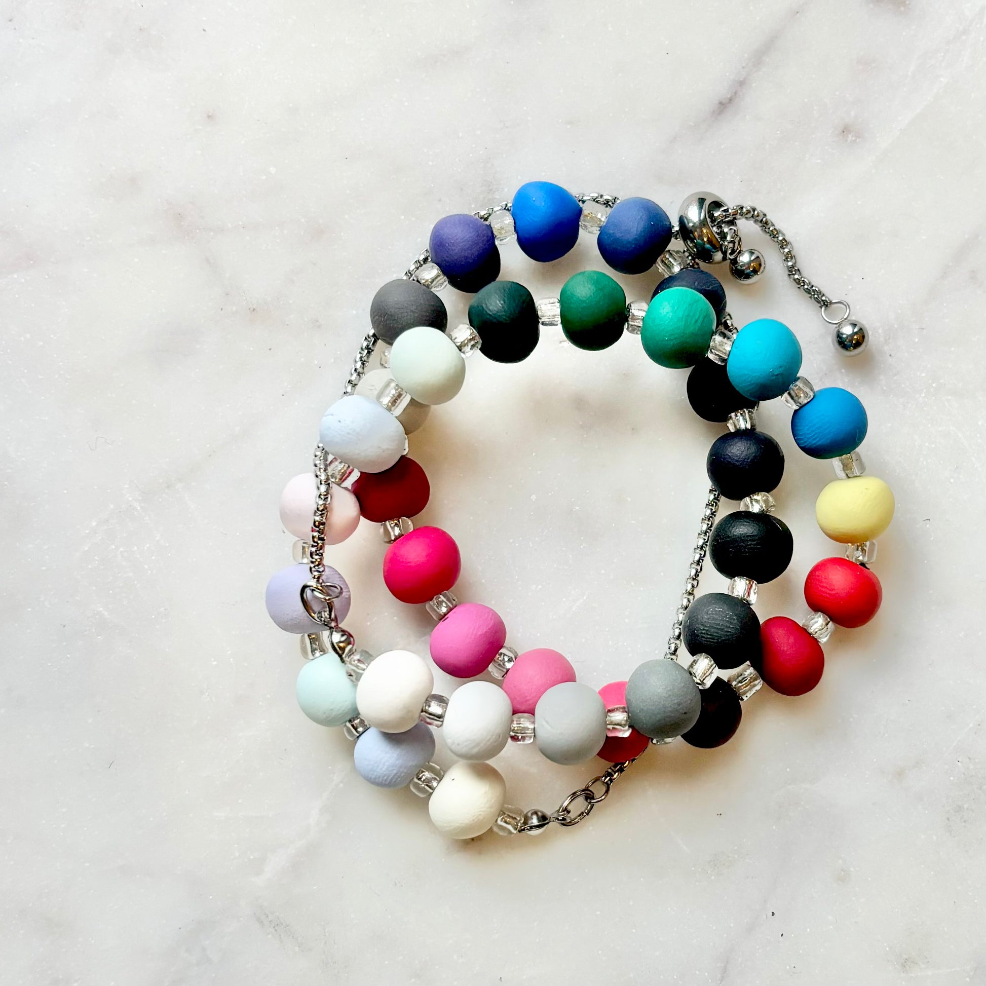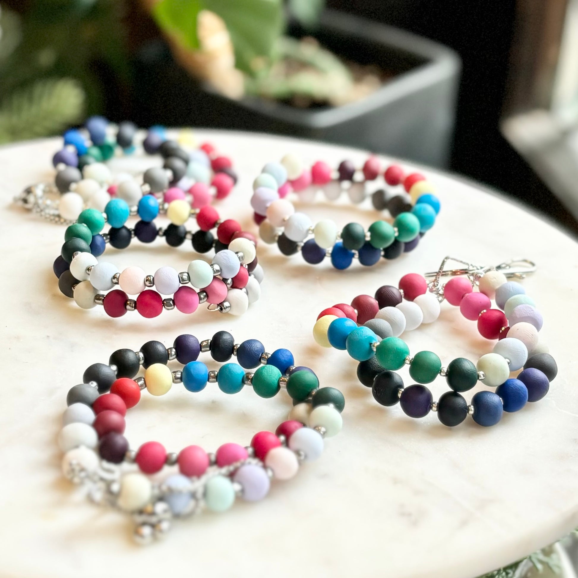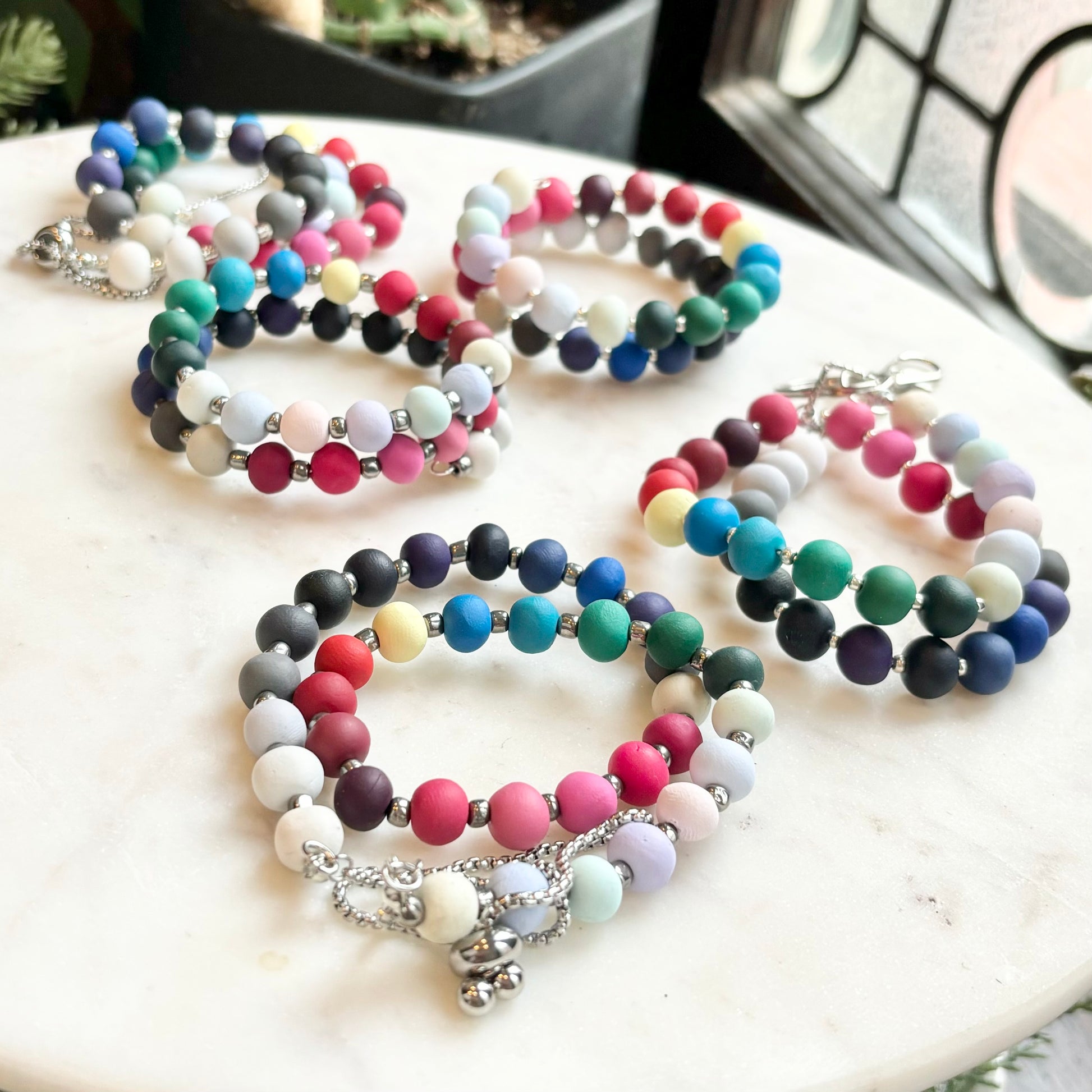 Palette Wearable bracelets include a bead in a custom matched color to the House of Colour colors from the winter palette. Each bead is hand rolled and finished after being color matched. They are placed on a bracelet with silver spacers.