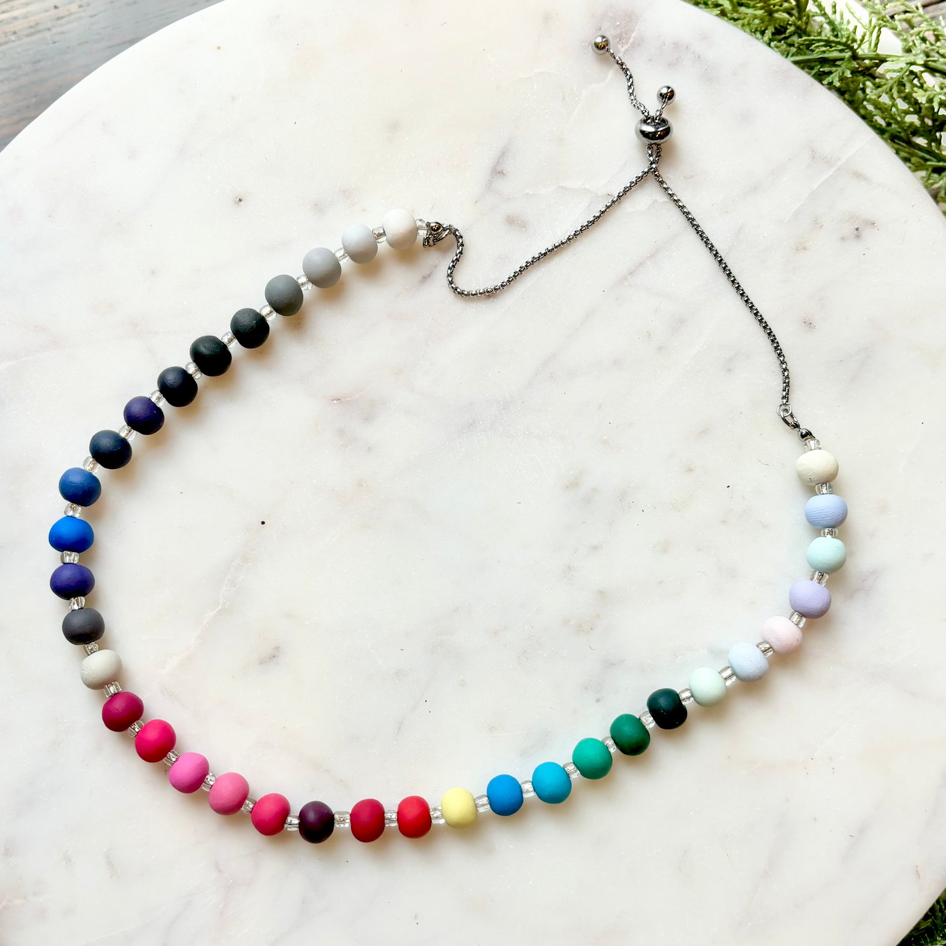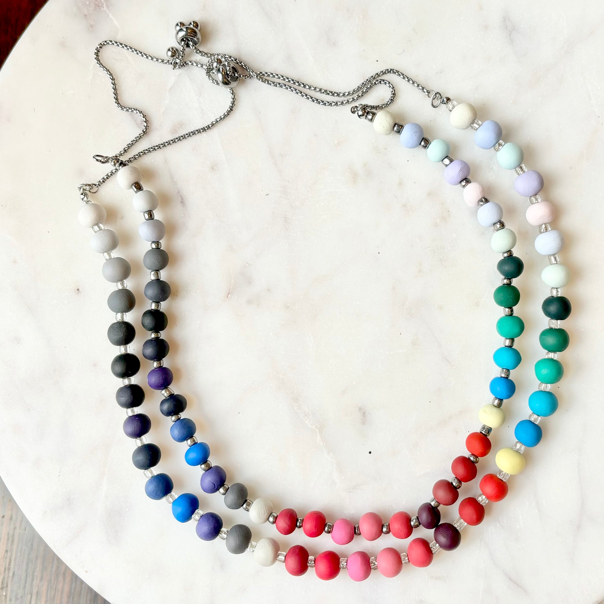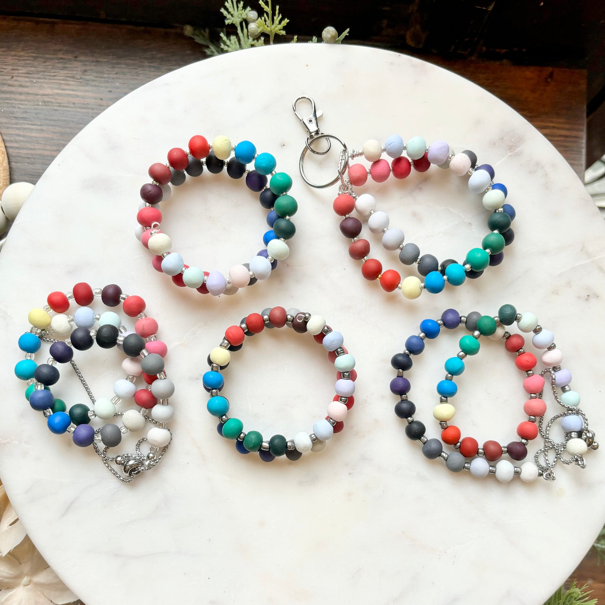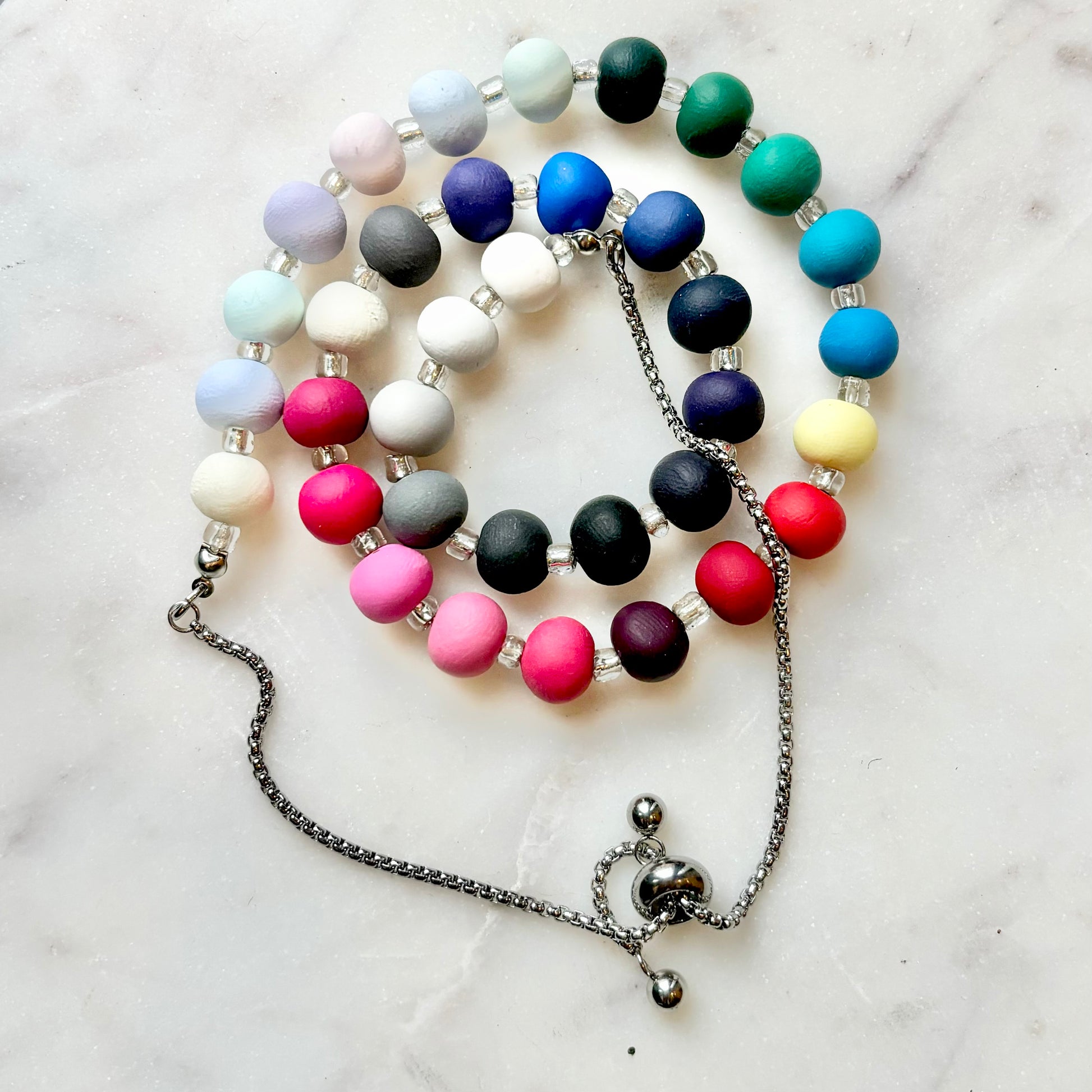 Palette Wearable bracelets include a bead in a custom matched color to the House of Colour colors from the winter palette. Each bead is hand rolled and finished after being color matched. They are placed on a bracelet with silver spacers.