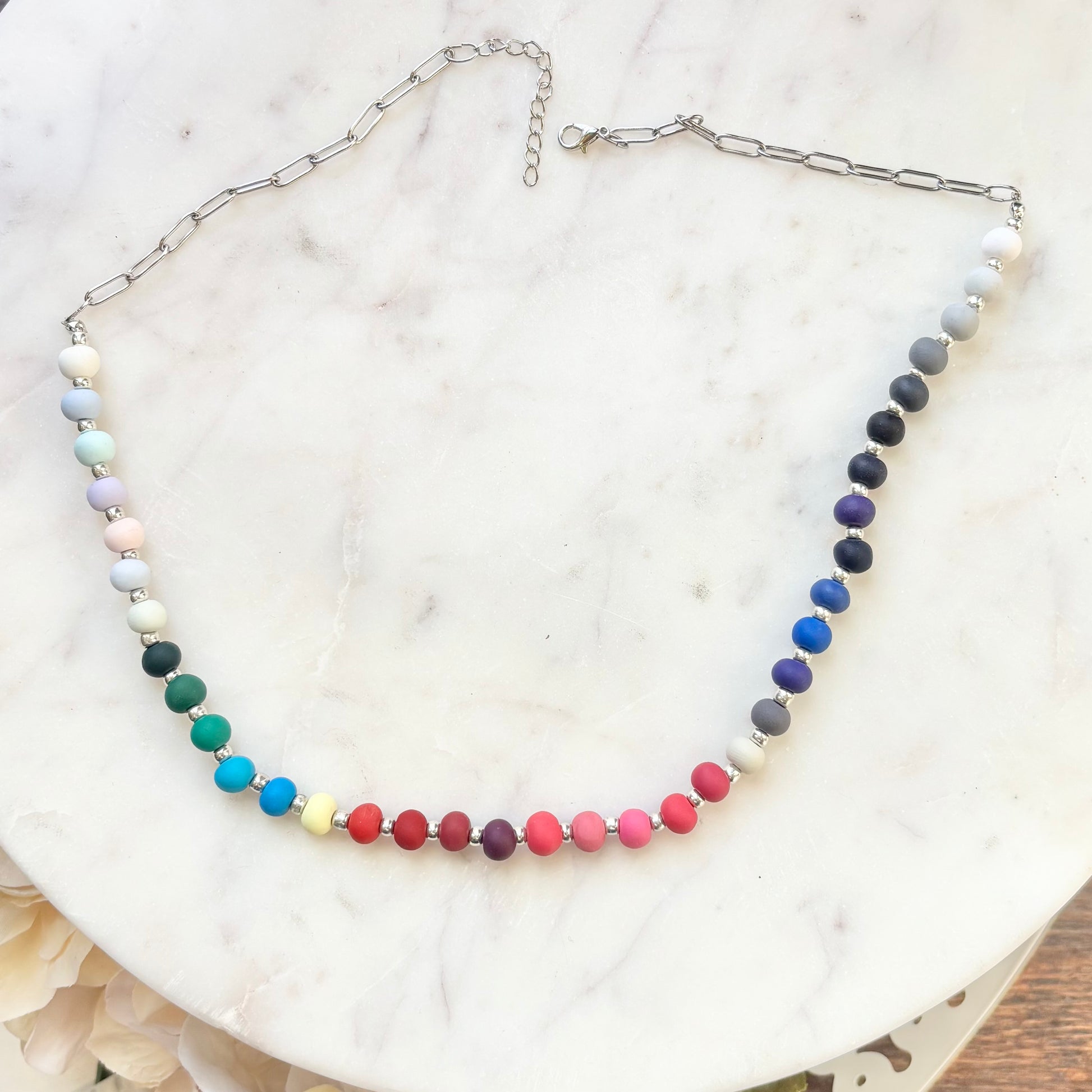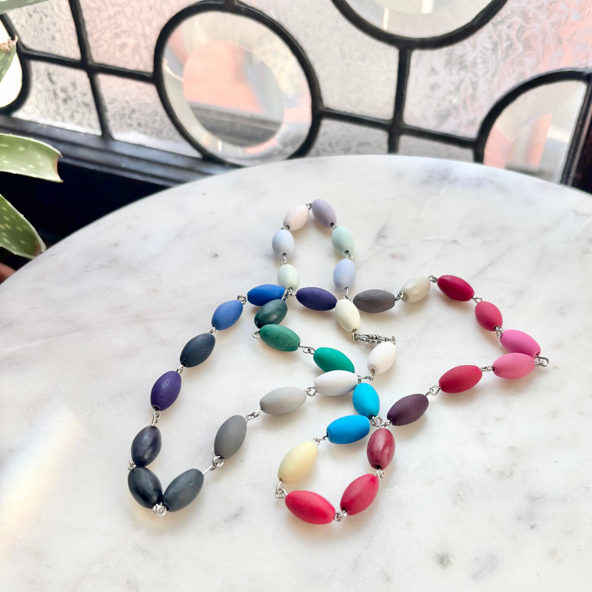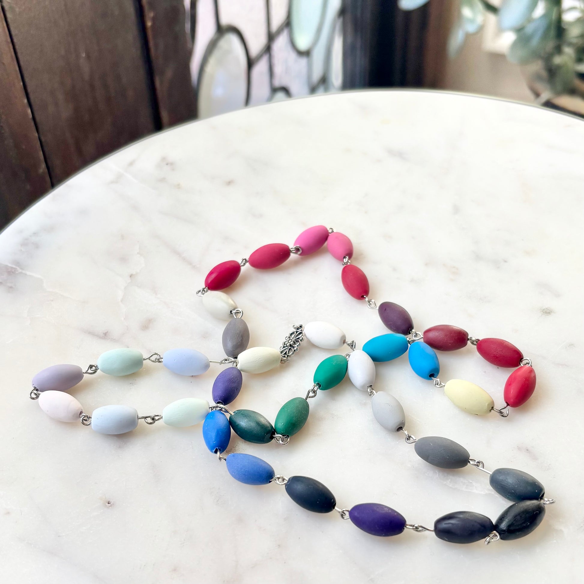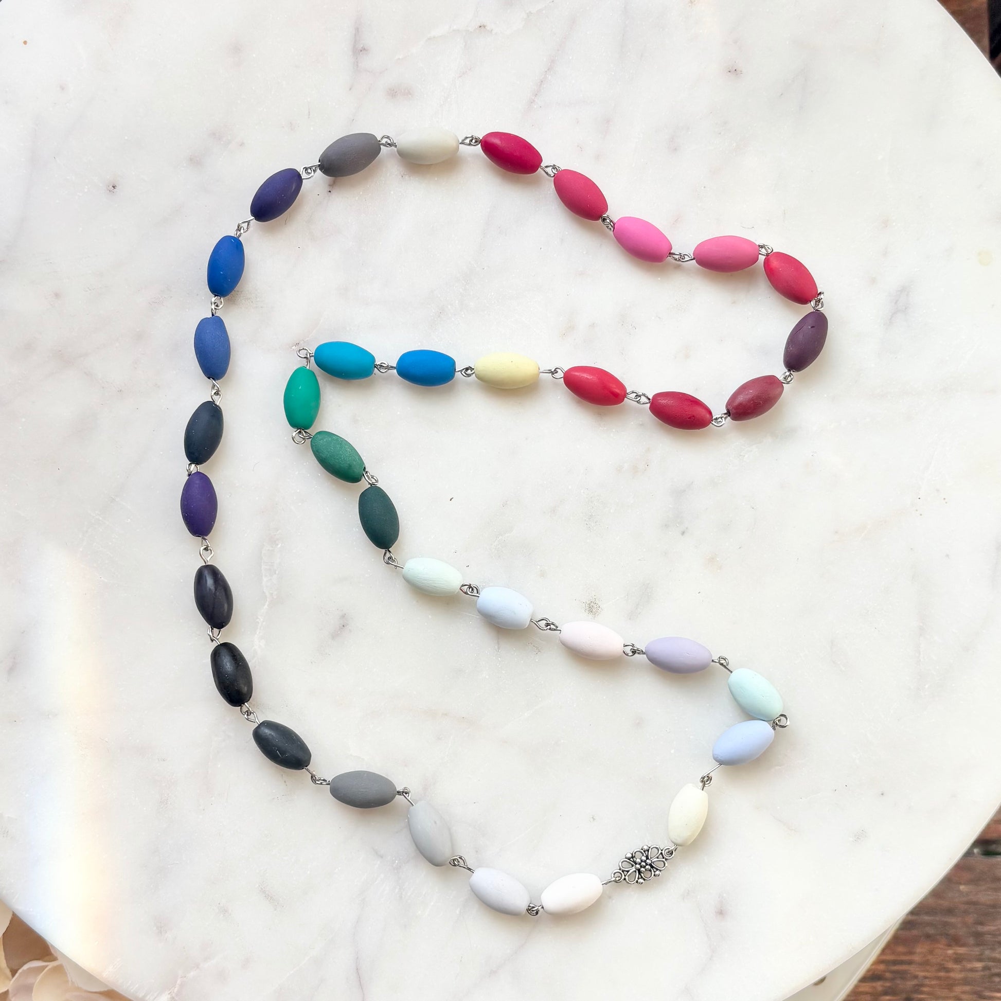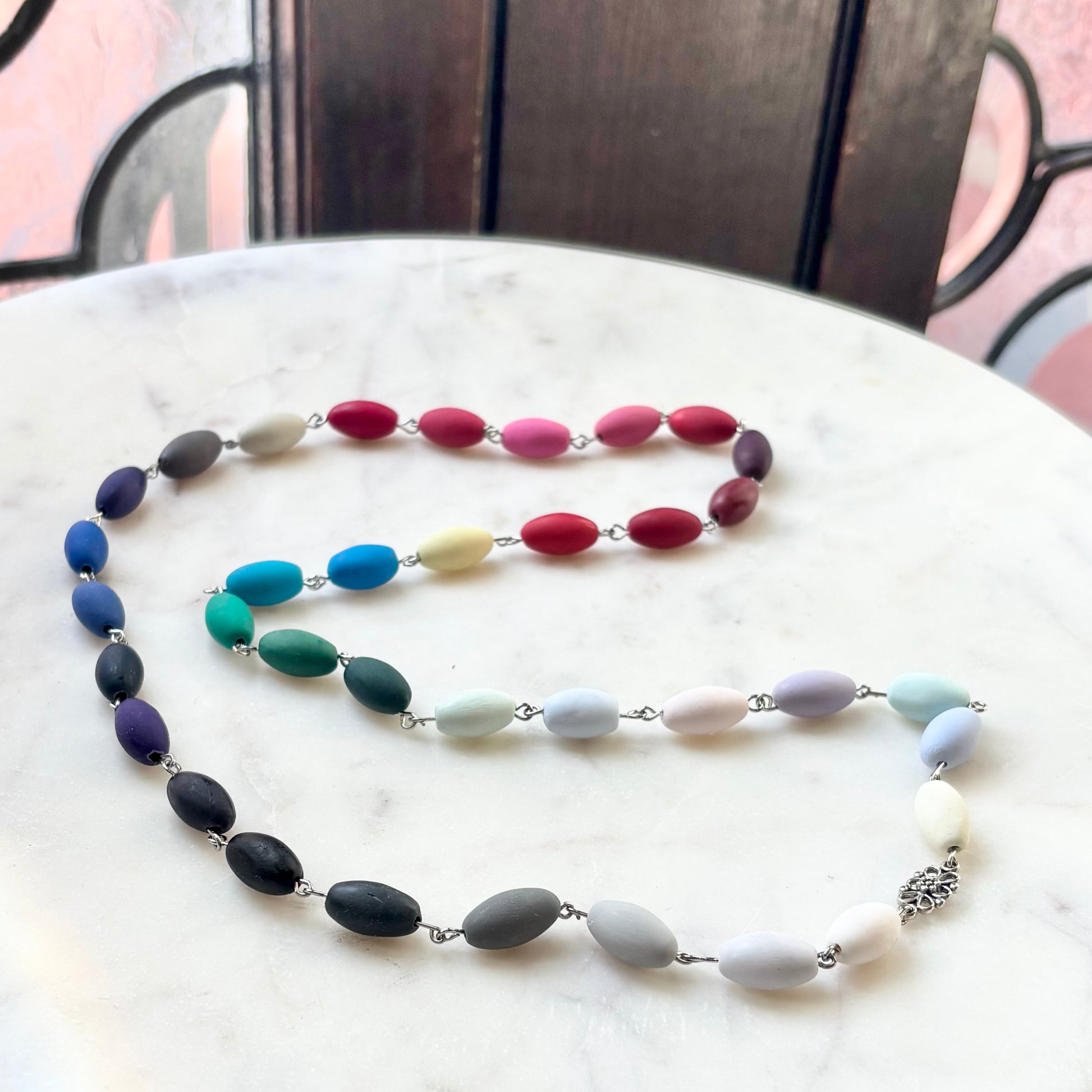 Palette Wearable necklaces include a bead in a custom, hand mixed color to match each of the 36 House of Colour colors from the winter palette. Each bead is hand rolled and finished after being color matched.