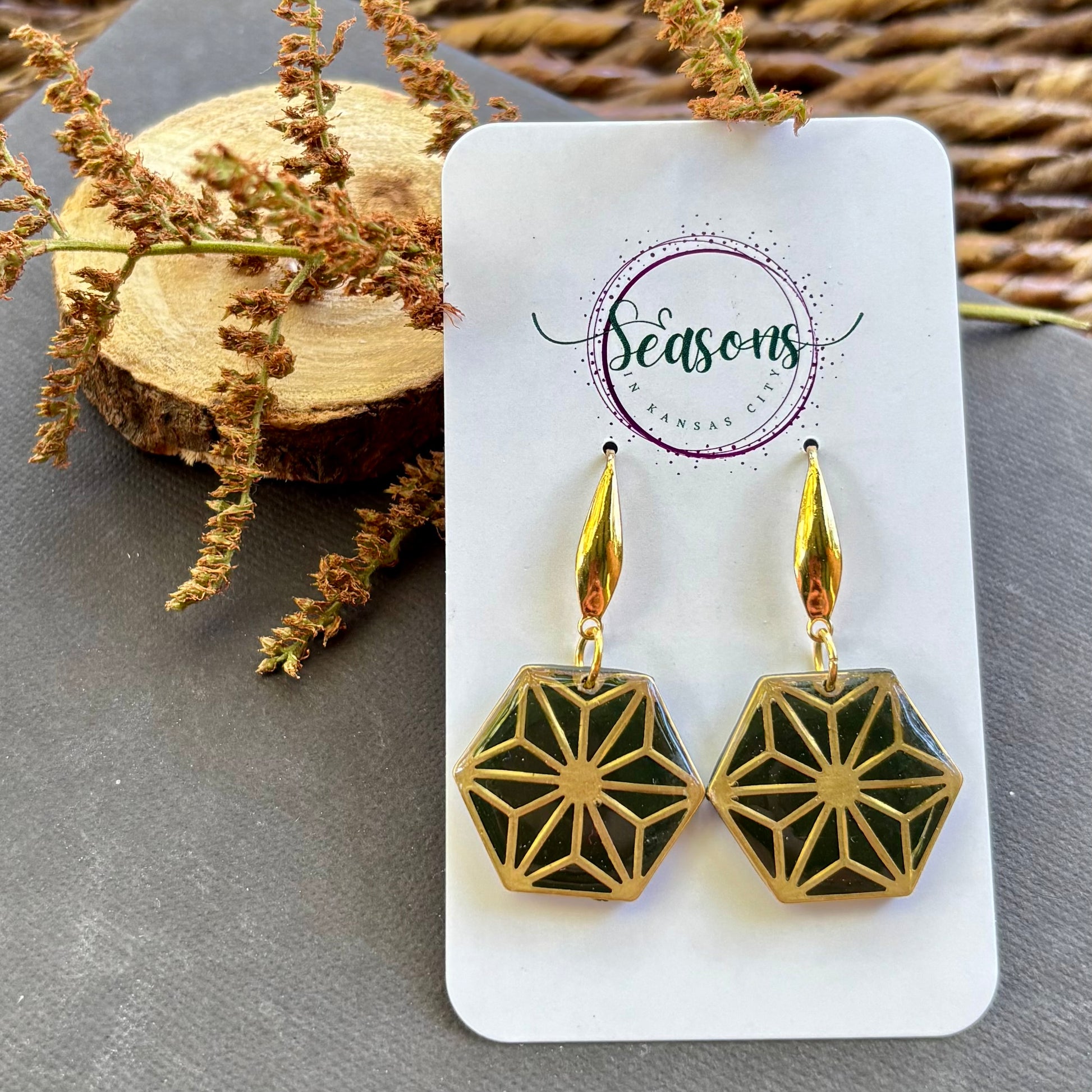 A background of colorful clay is topped with a metal inlay and finished with UV resin for shine.