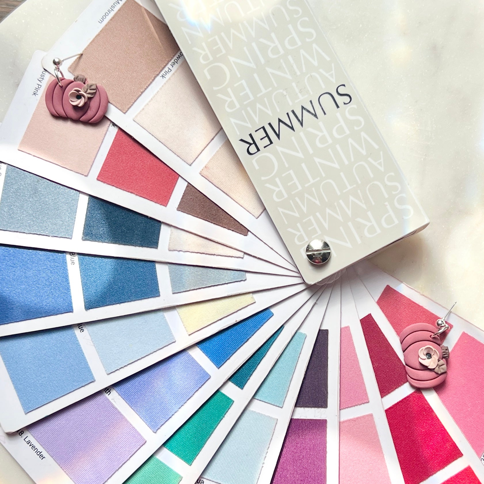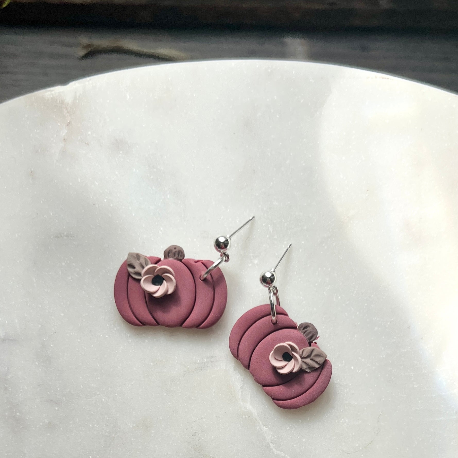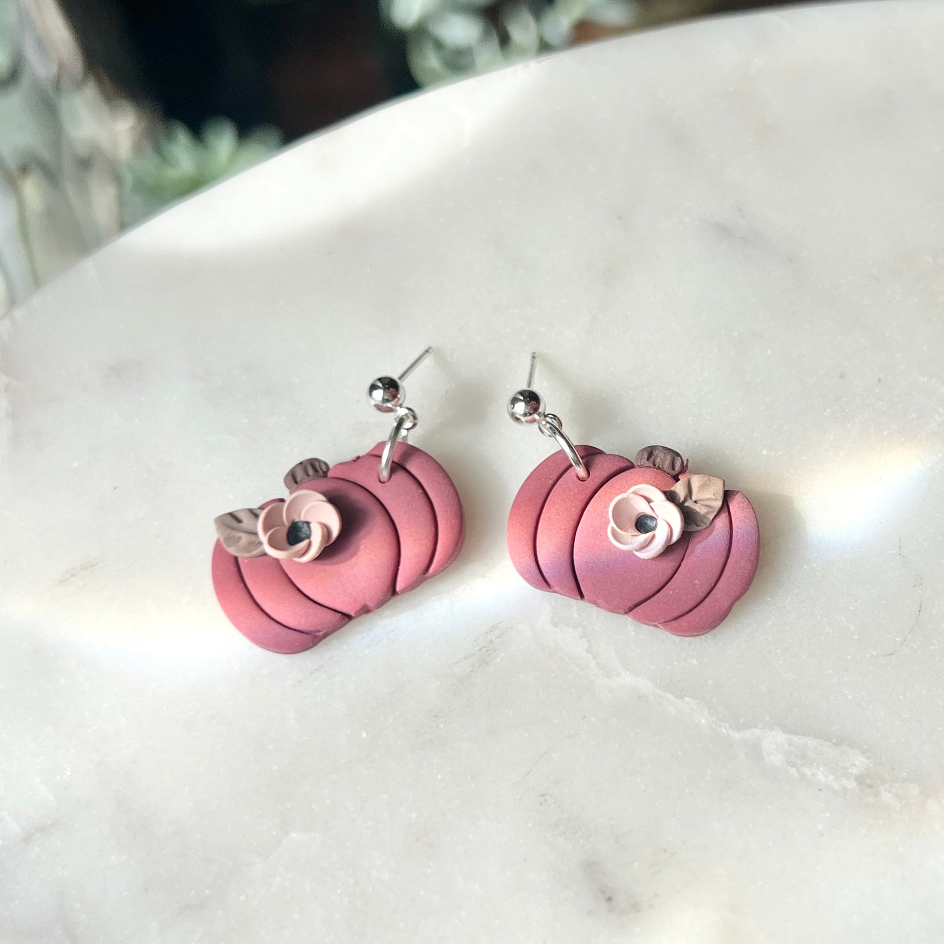 A musk pink pumpkin dangles from a silver, stainless steel post. It is adorned with a dusky pink flower with mushroom leaf and rose brown stem.