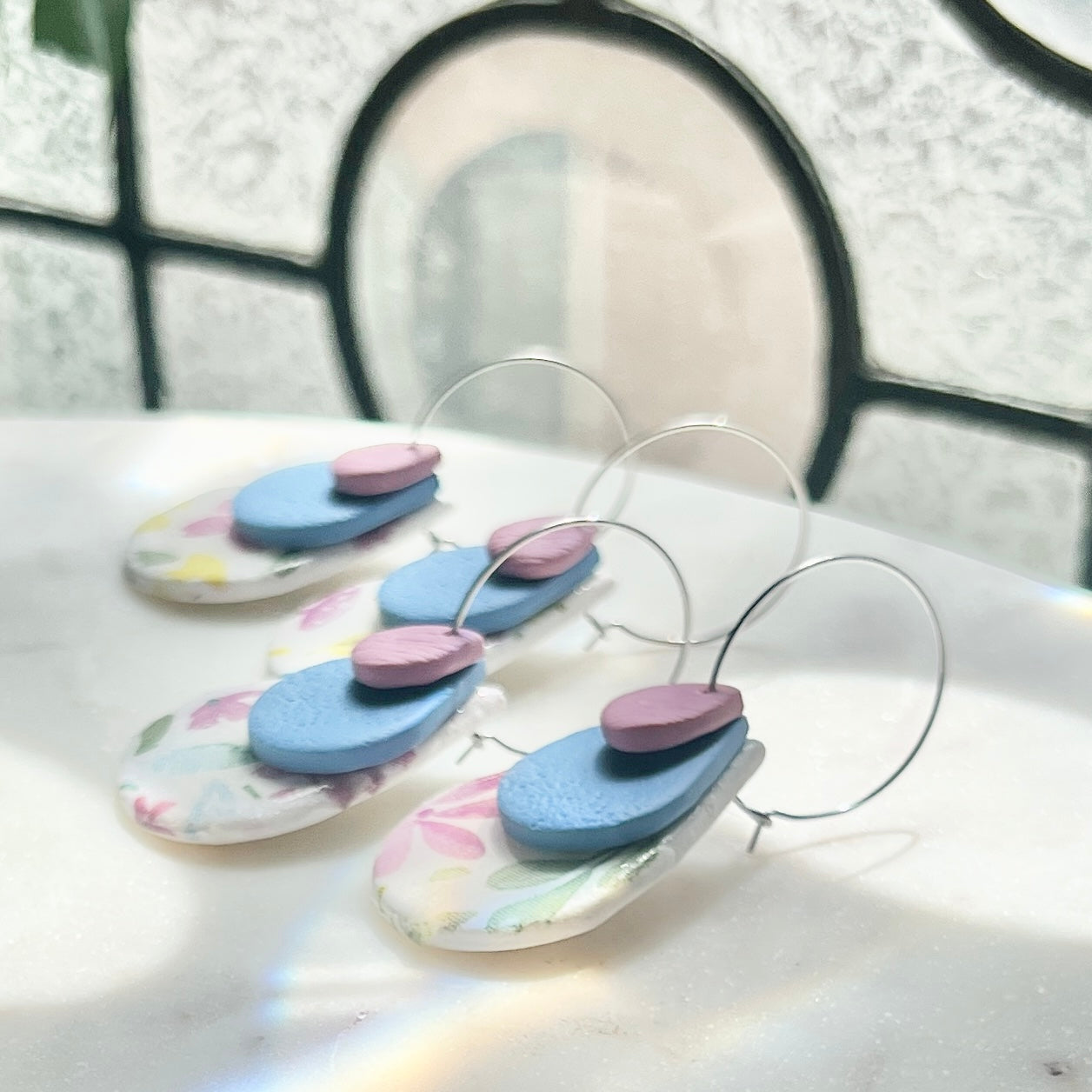 Rosa is a floral print collection with flowers, leaves, and mushrooms printed onto a soft white backdrop. The pattern is topped with UV resin to maintain its integrity and to add interest and shine. Some pieces are finished with additional pieces in sky blue and cyclamen with a touch of lavender to coordinate with the flowers in the print.