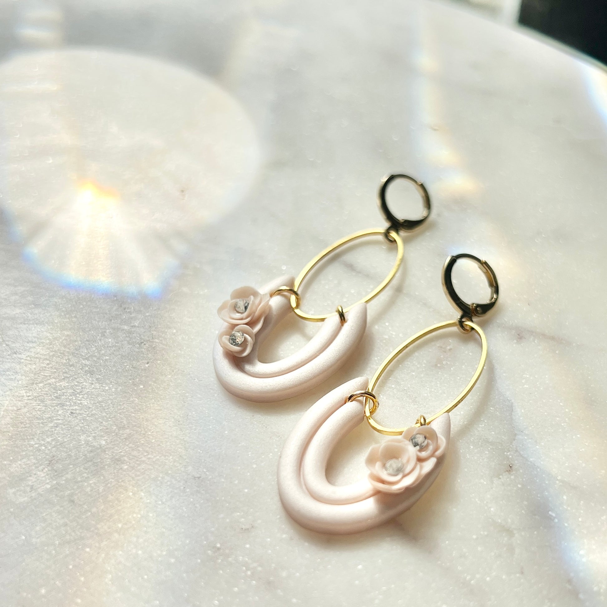 Thea is a collection created with a softly iridescent, mother of pearl soft white clay with bronze mica powder added to create this warm, soft pinky beige. It's perfect for a wedding or other formal occasion.