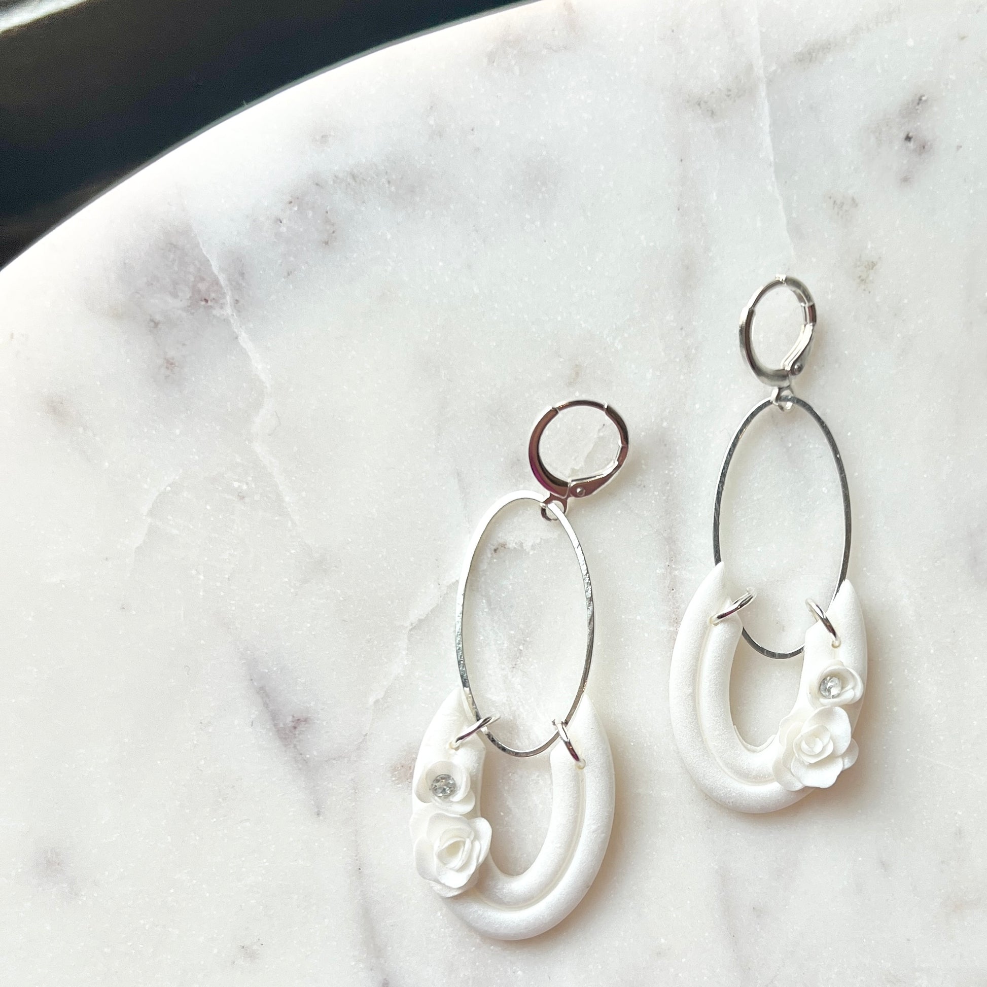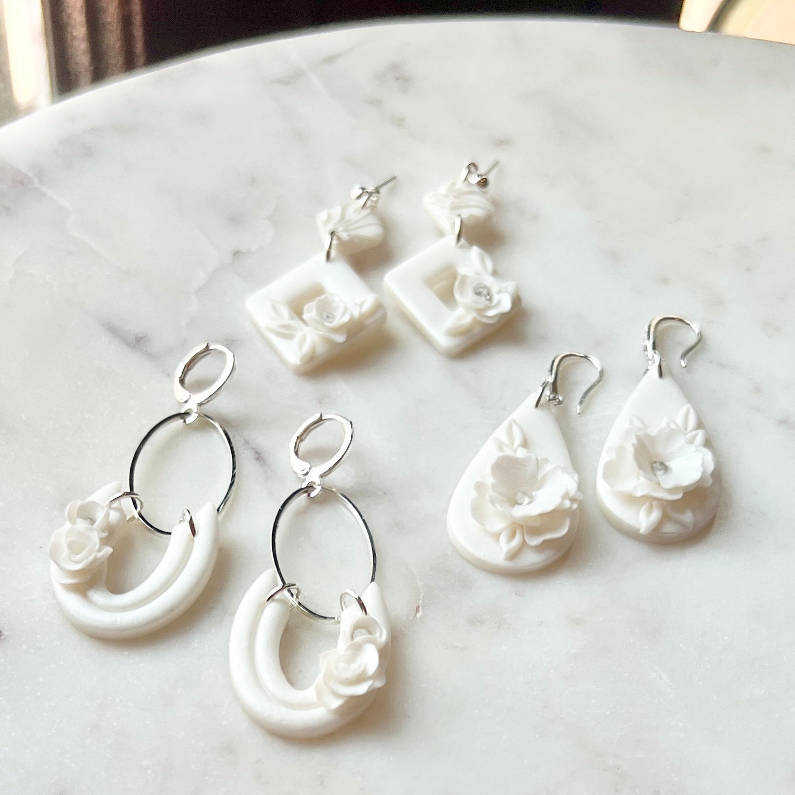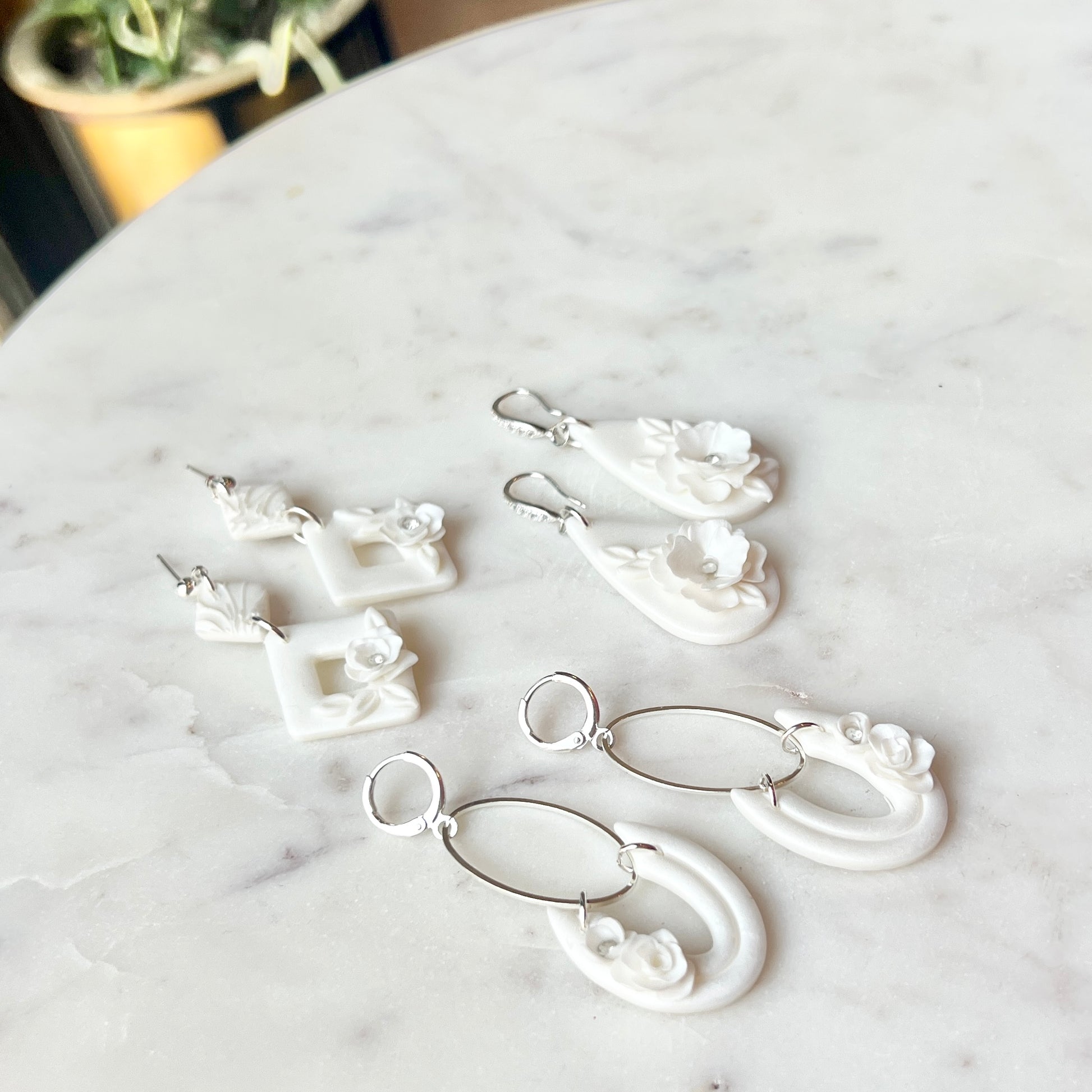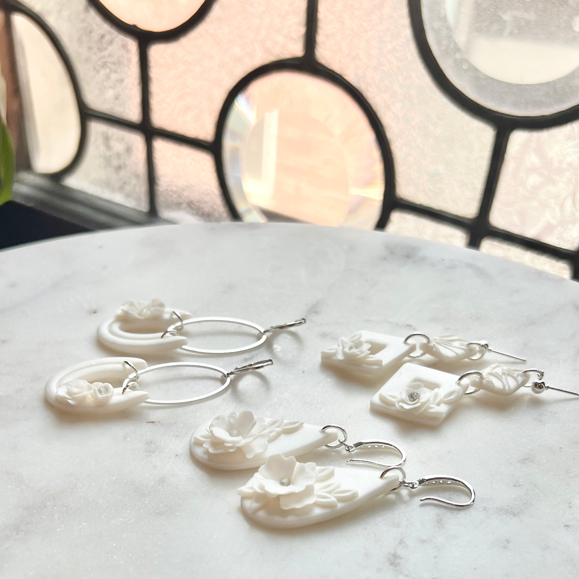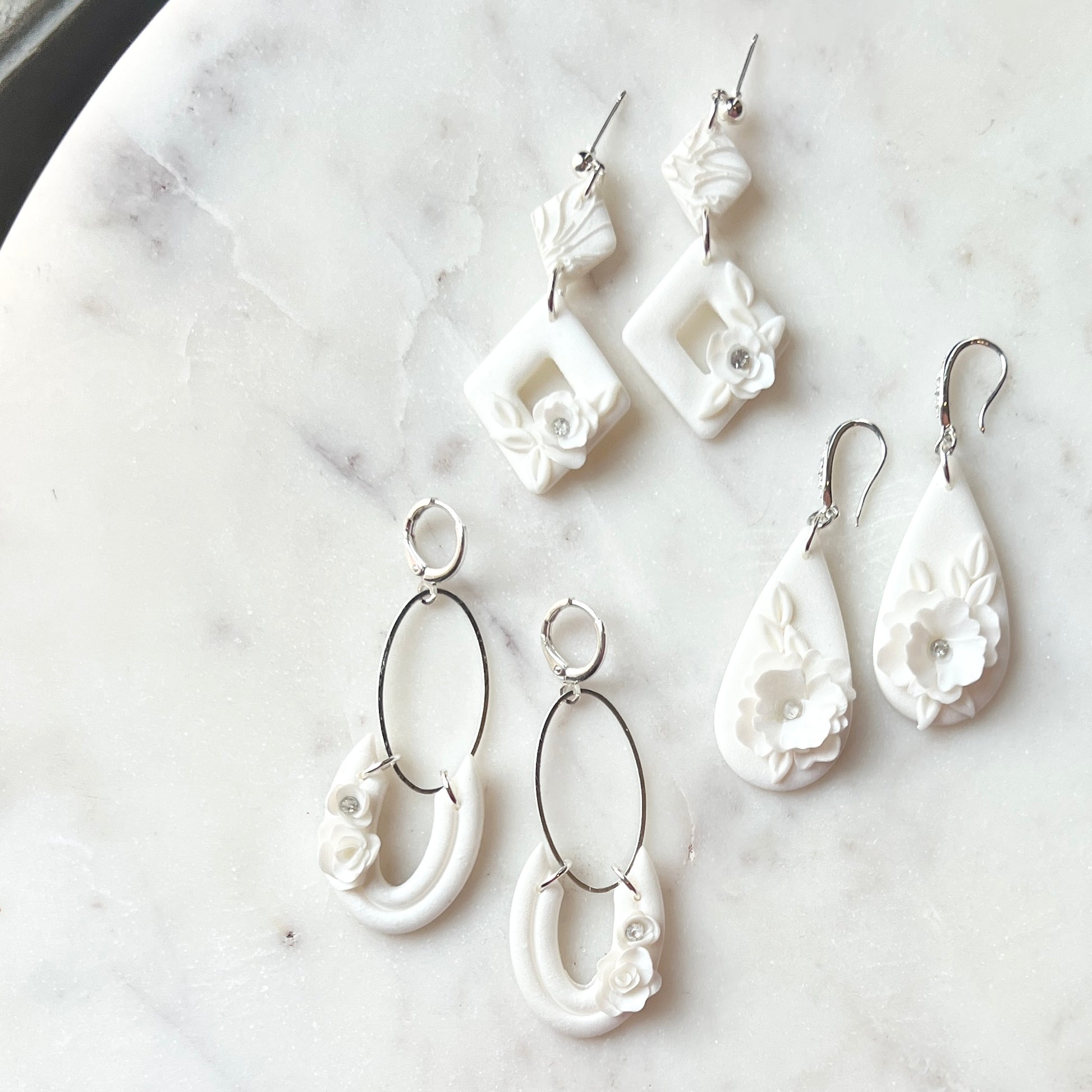 Thea is a collection created with a softly iridescent, mother of pearl soft white clay. It's perfect for a wedding or other formal occasion.