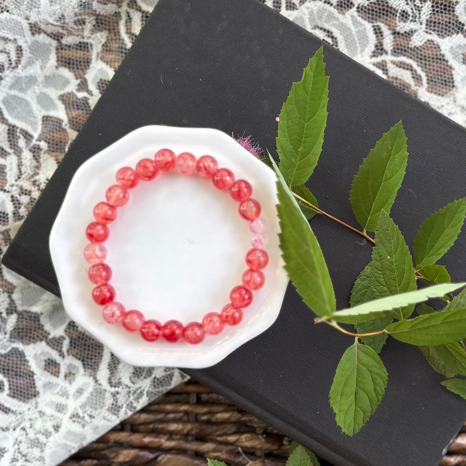 Zoe is a collection of acrylic beaded bracelets made of both 6 and 8 mm beads. They are approximately 7” around and strung on stretchy cord.