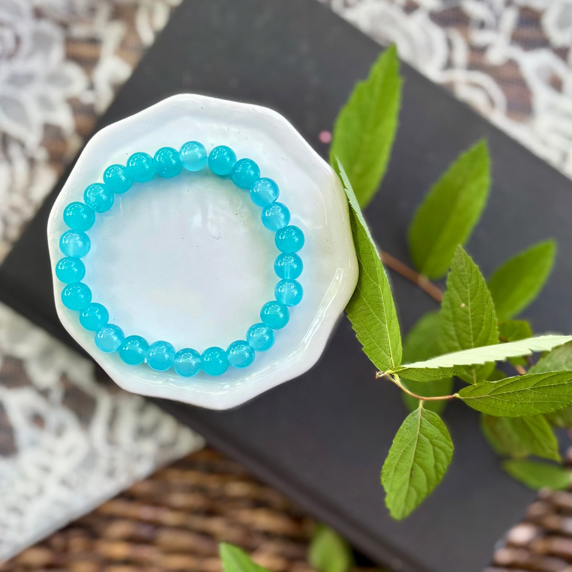 Zoe is a collection of acrylic beaded bracelets made of both 6 and 8 mm beads. They are approximately 7” around and strung on stretchy cord.