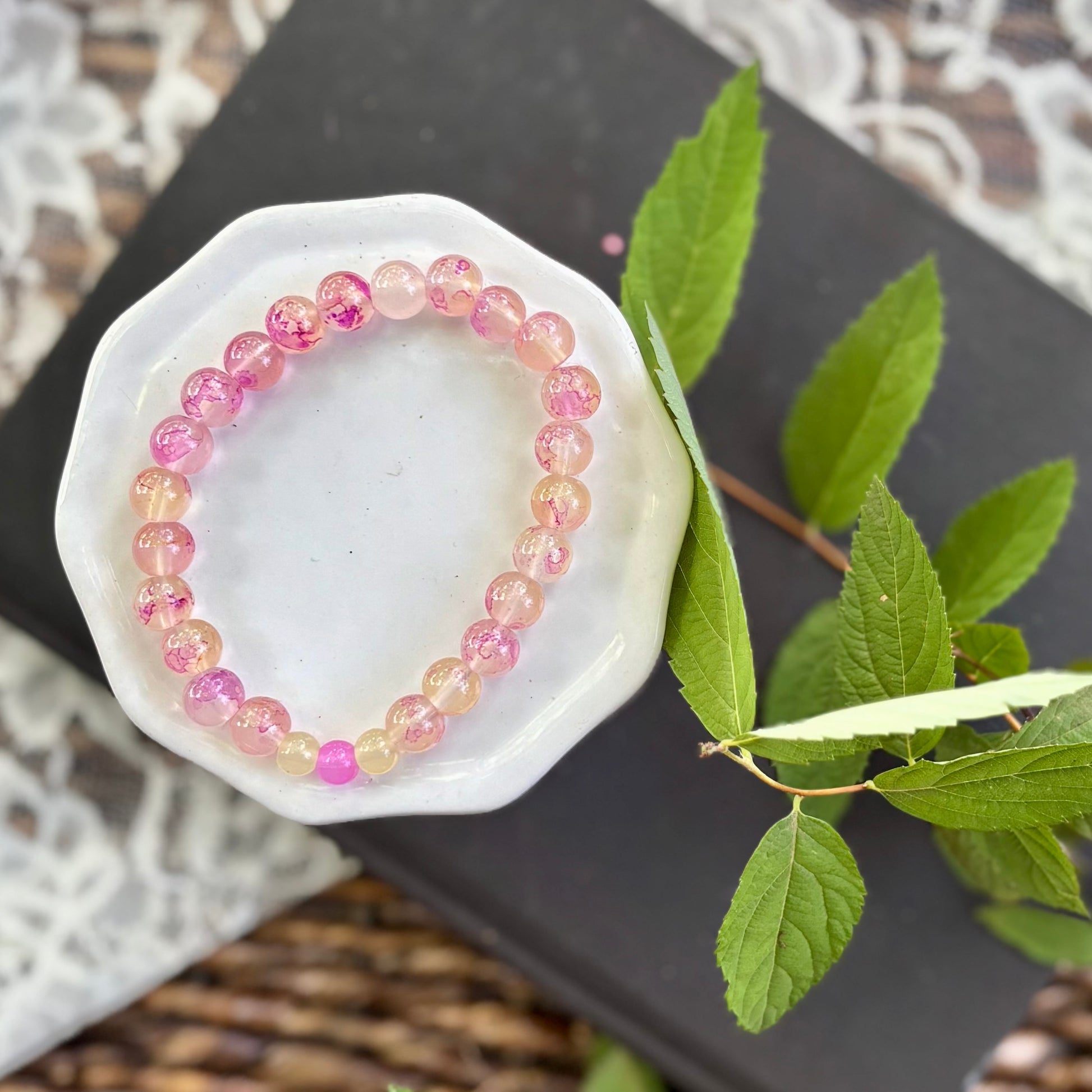 Zoe is a collection of acrylic beaded bracelets made of both 6 and 8 mm beads. They are approximately 7” around and strung on stretchy cord.